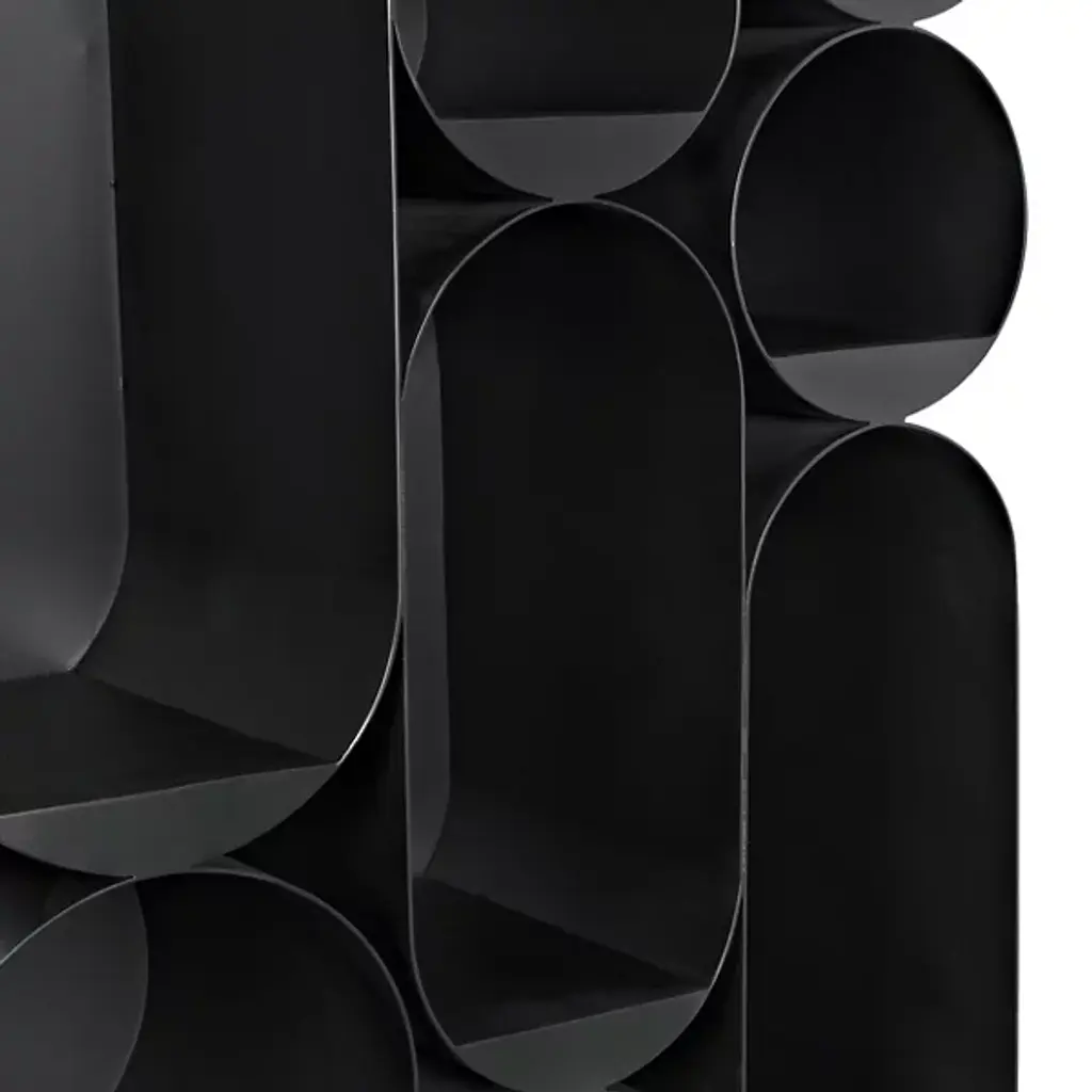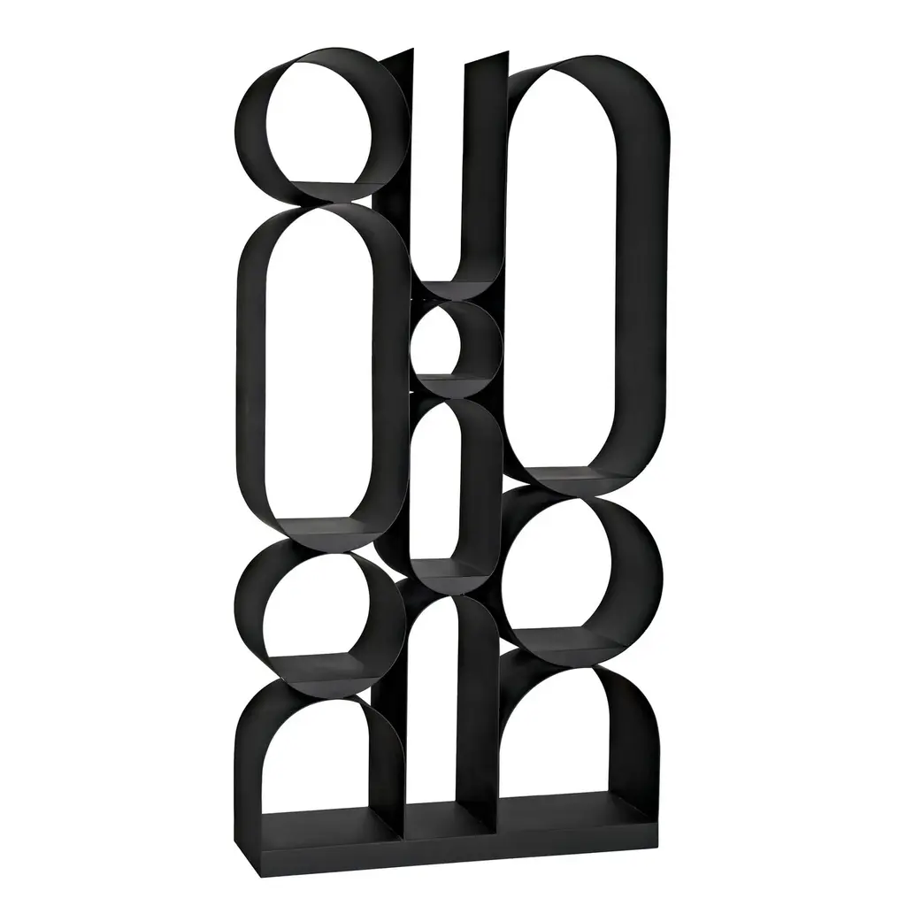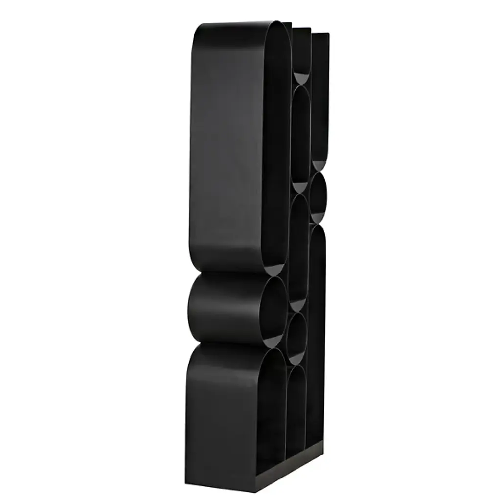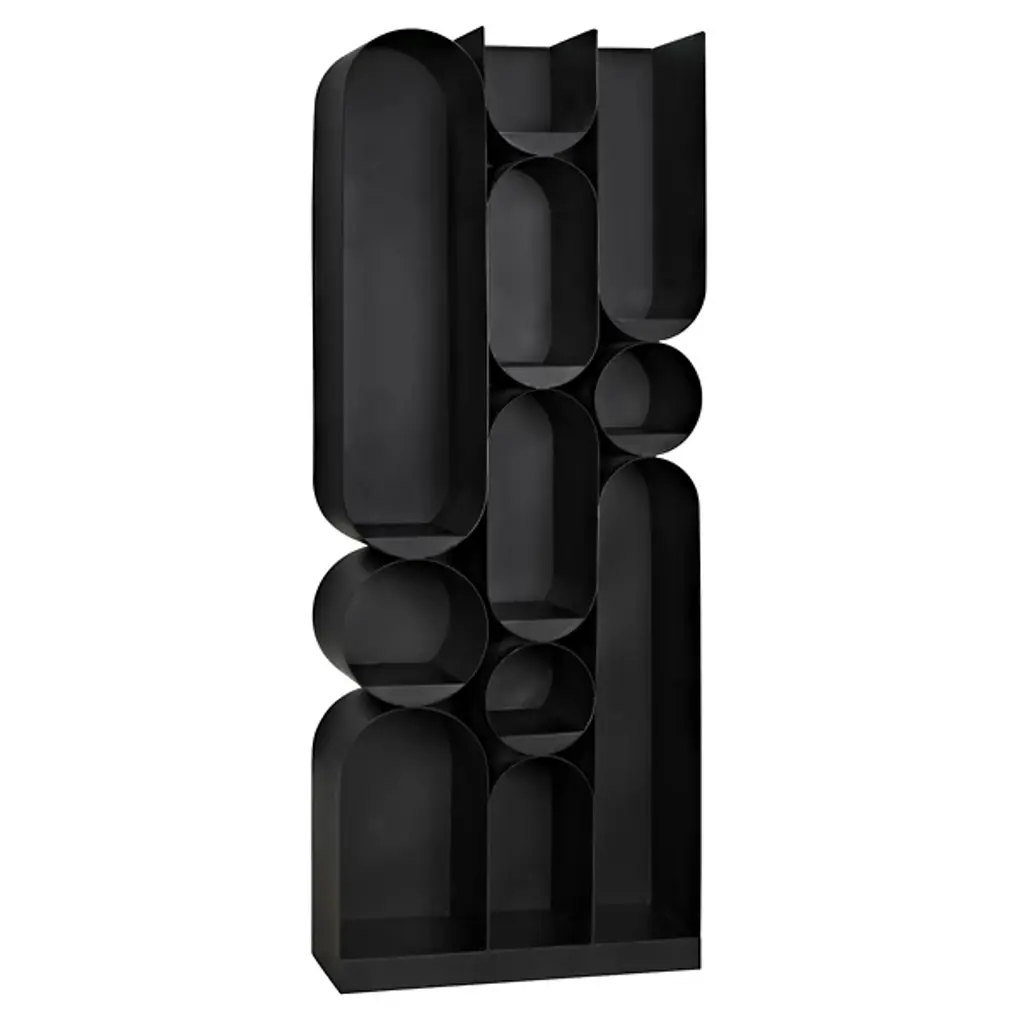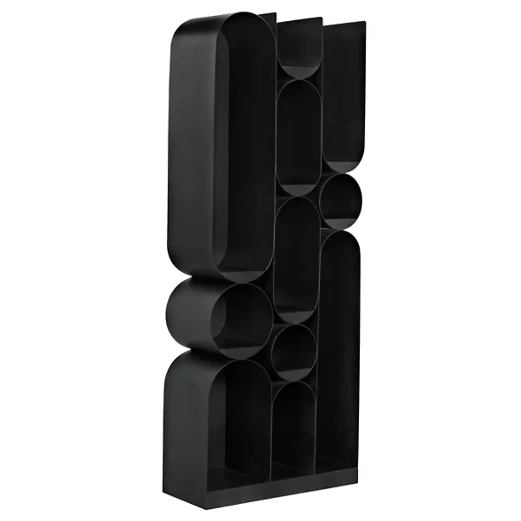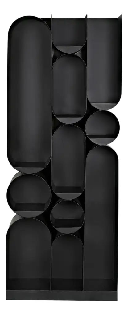 The Atomic Bookcase from Noir stacks oval and rectangular steel modules in an interlocking pattern that recalls mid-century atomic-age graphics. Each compartment curves into the next, creating flowing storage spaces that break away from traditional shelf arrangements. The steel construction allows for thin walls between sections, maximizing interior space while maintaining structural strength. Rounded edges soften what could otherwise be a harsh industrial appearance, making books and objects appear to float within the curved openings. This narrow bookcase fits easily into tight spaces where conventional storage would overwhelm the room.