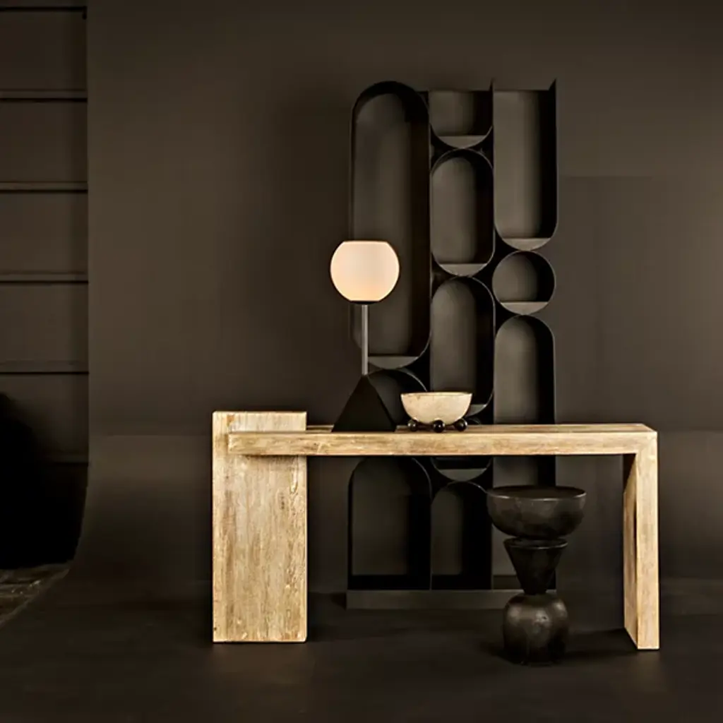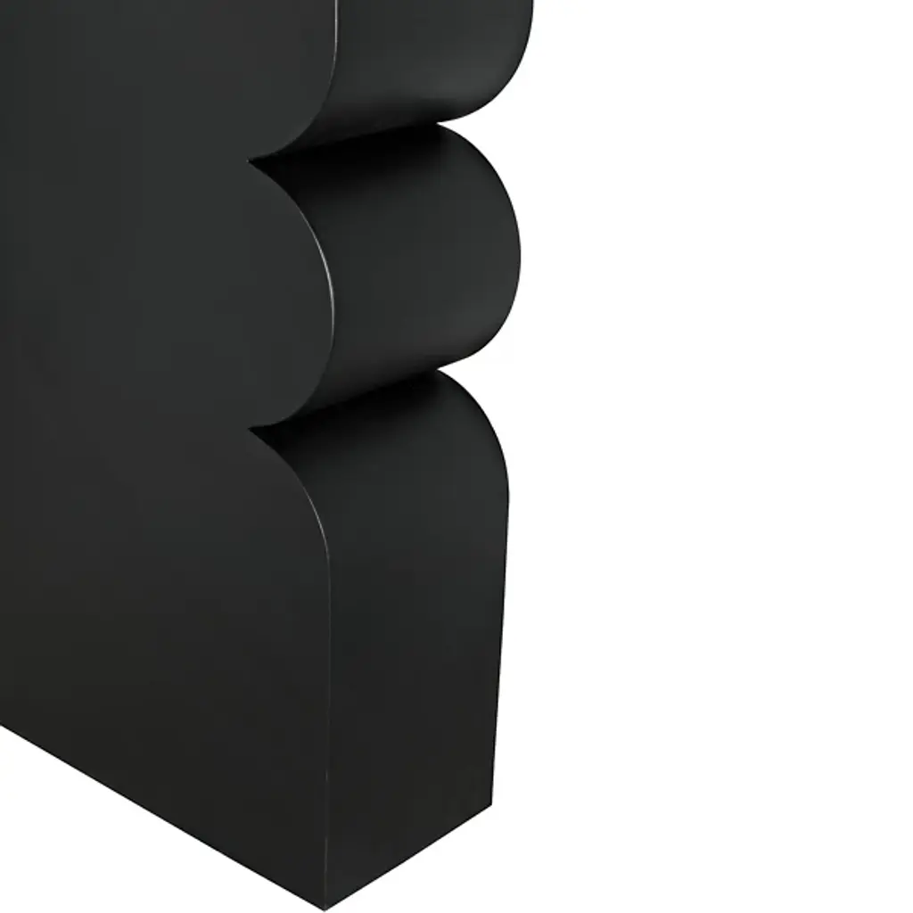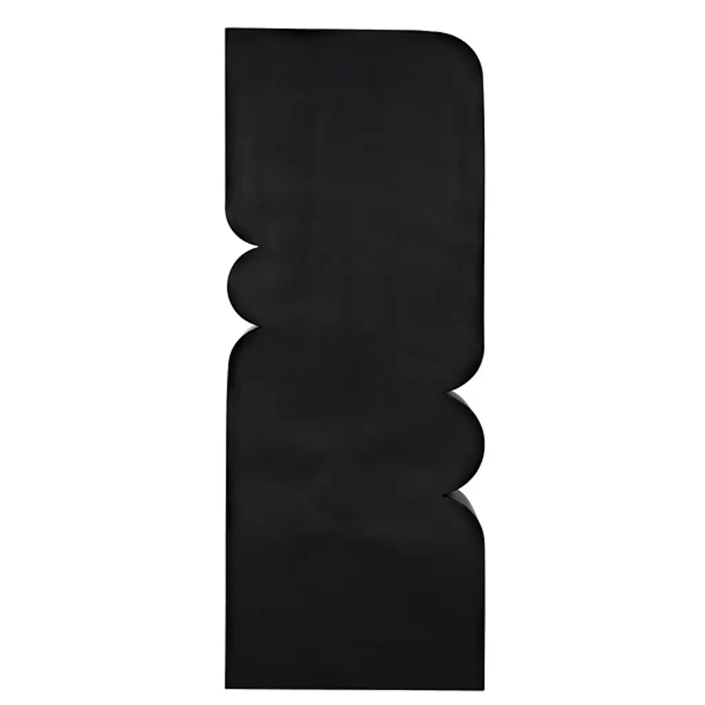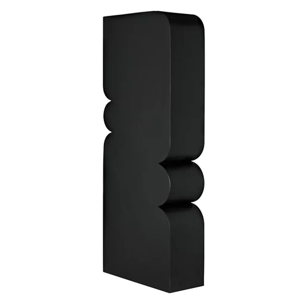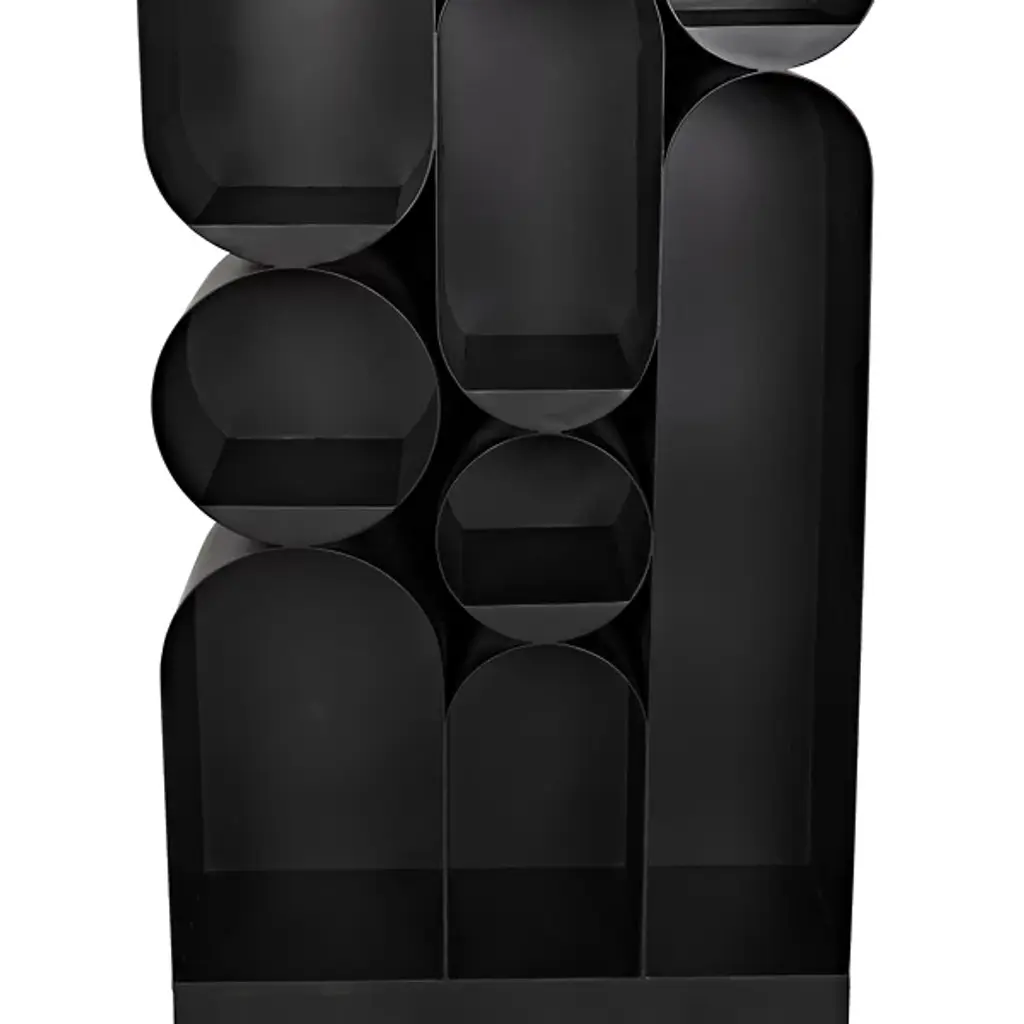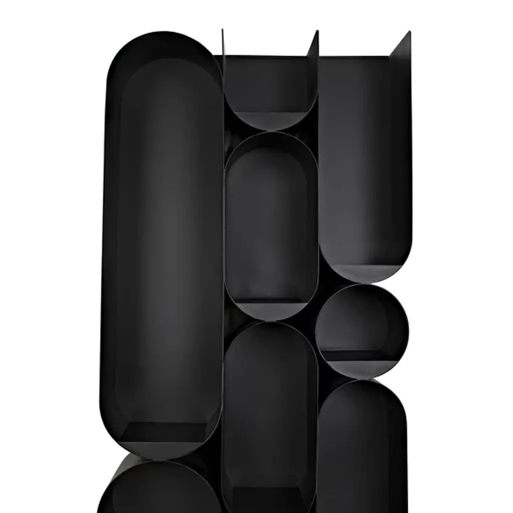 The Atomic Bookcase from Noir stacks oval and rectangular steel modules in an interlocking pattern that recalls mid-century atomic-age graphics. Each compartment curves into the next, creating flowing storage spaces that break away from traditional shelf arrangements. The steel construction allows for thin walls between sections, maximizing interior space while maintaining structural strength. Rounded edges soften what could otherwise be a harsh industrial appearance, making books and objects appear to float within the curved openings. This narrow bookcase fits easily into tight spaces where conventional storage would overwhelm the room.