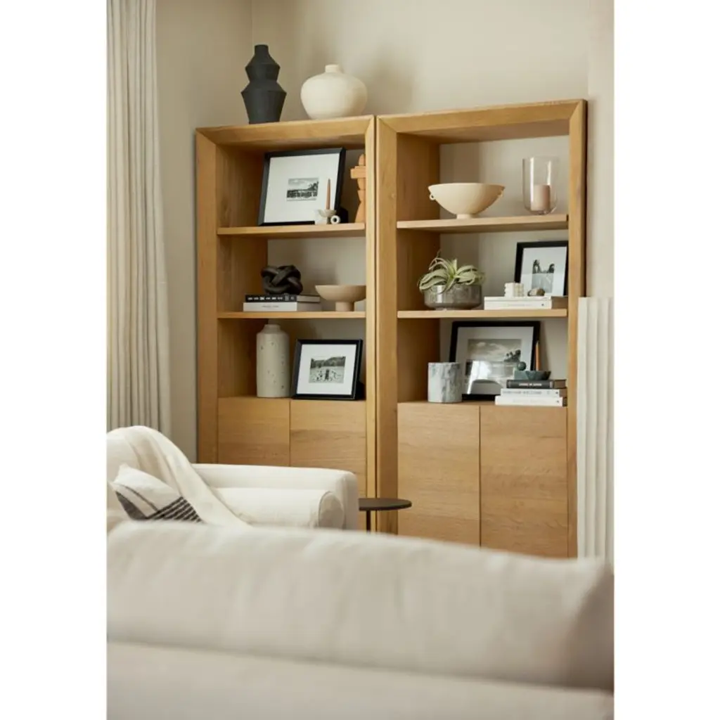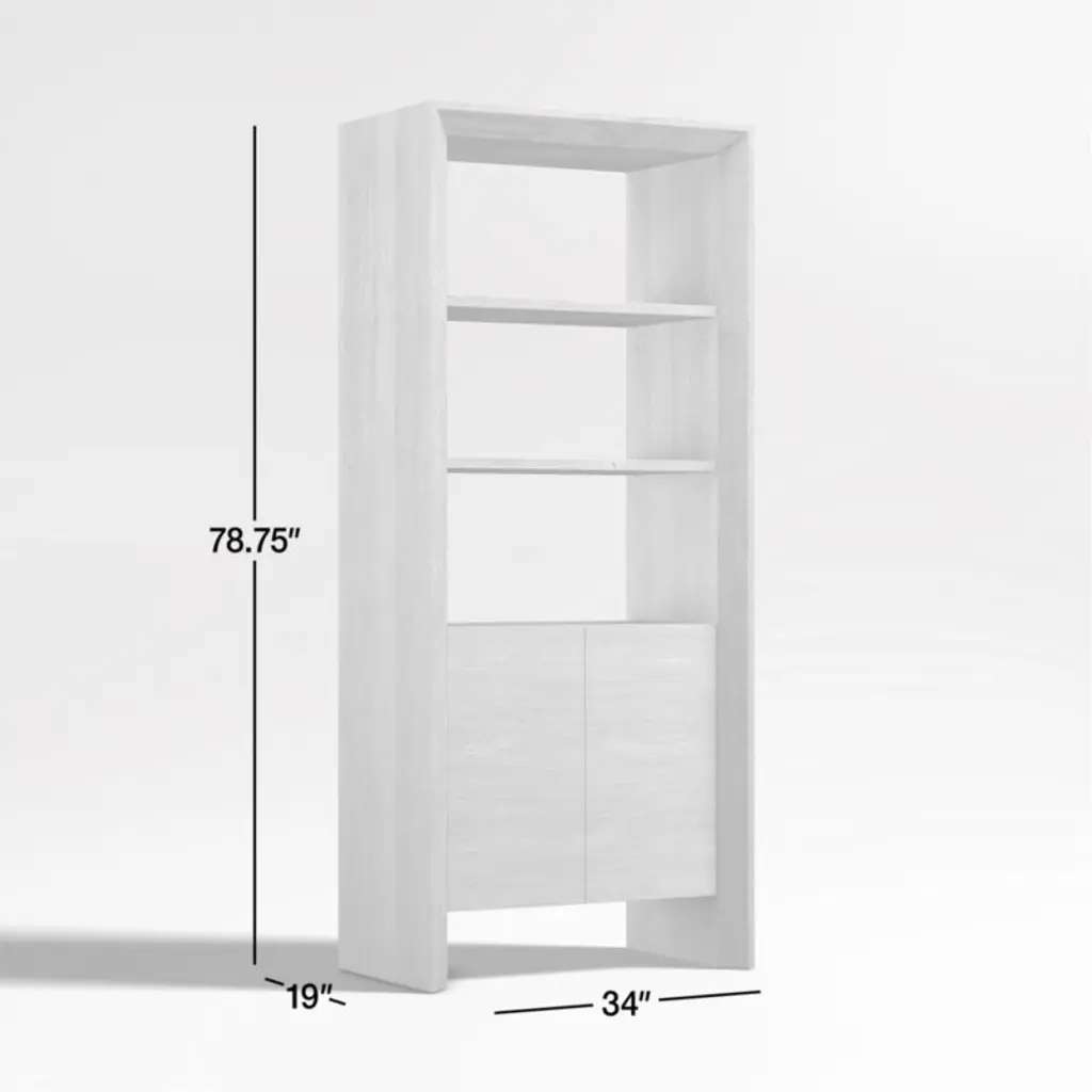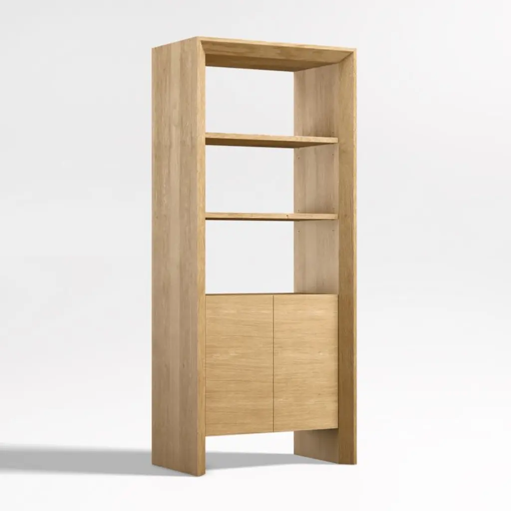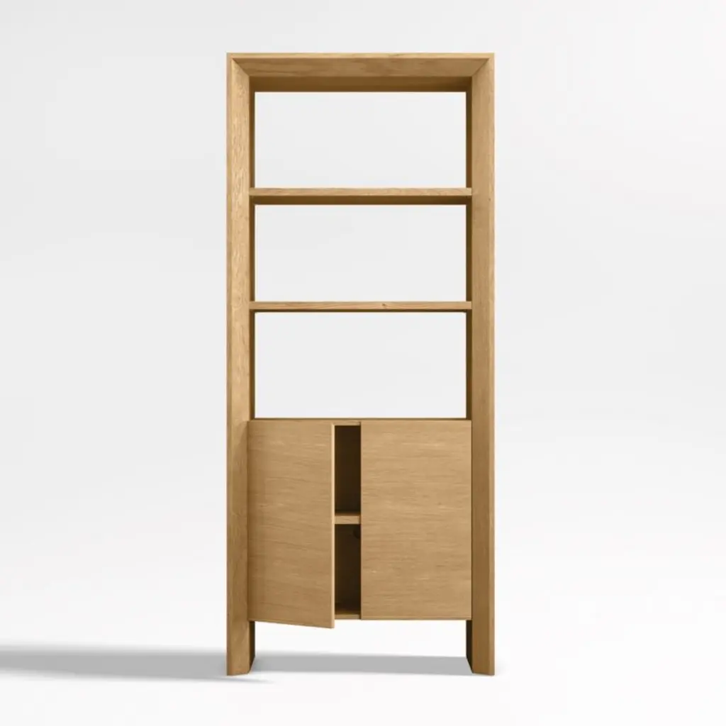 Named after the natural beauty found in the Baja Peninsula, our storage bookcase celebrates the organic richness of oak. Simple geometry and a natural stain put the focus on the wood's unique grain, knots and markings. Reverse chamfer edges and open shelving lighten the clean waterfall silhouette, floating a flat-fronted cabinet for closed storage. Rustic and timeless, the Baja natural oak bookcase is a Crate & Barrel exclusive.By choosing FSC ®-certified furniture, you are supporting responsible management of the world's forests.