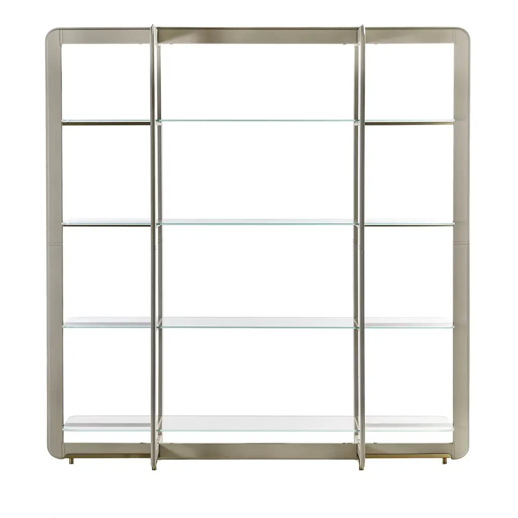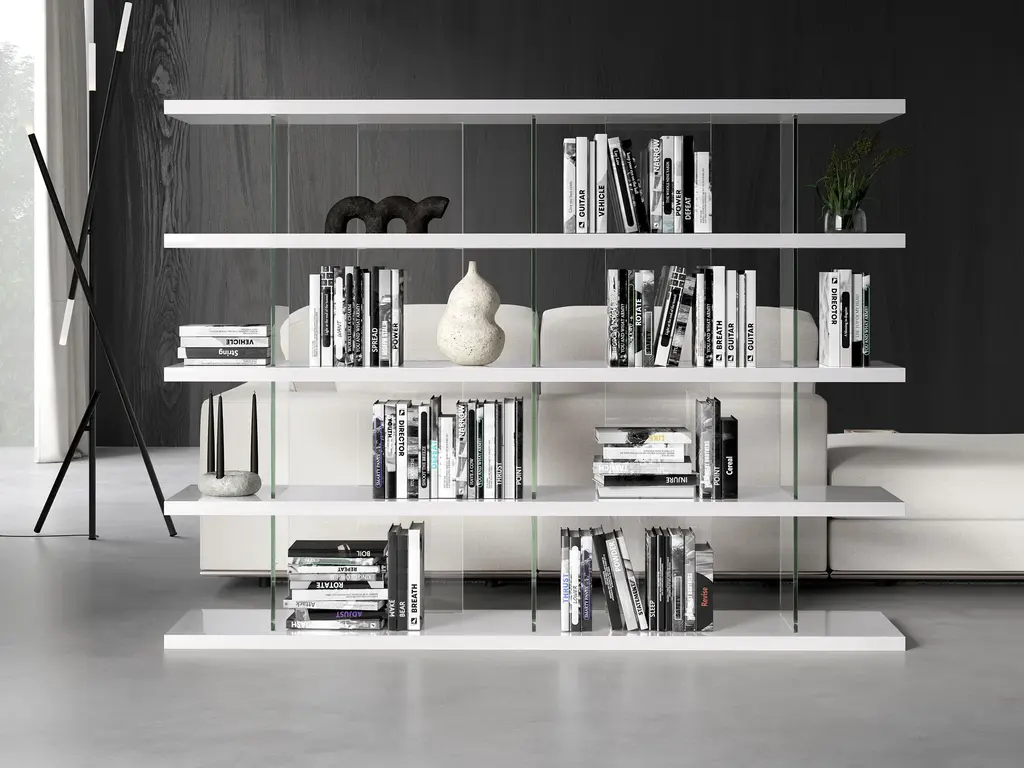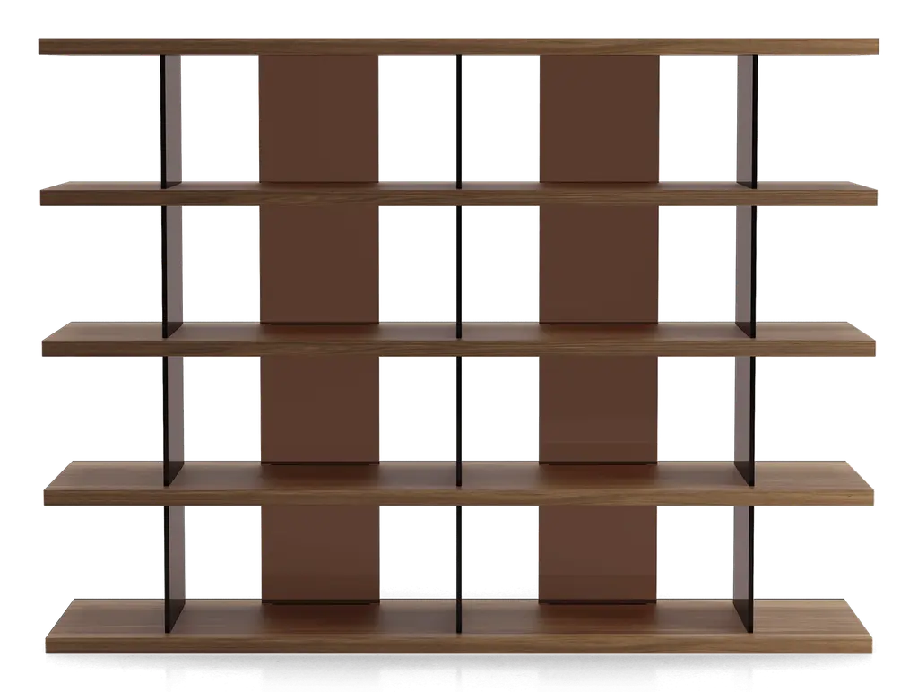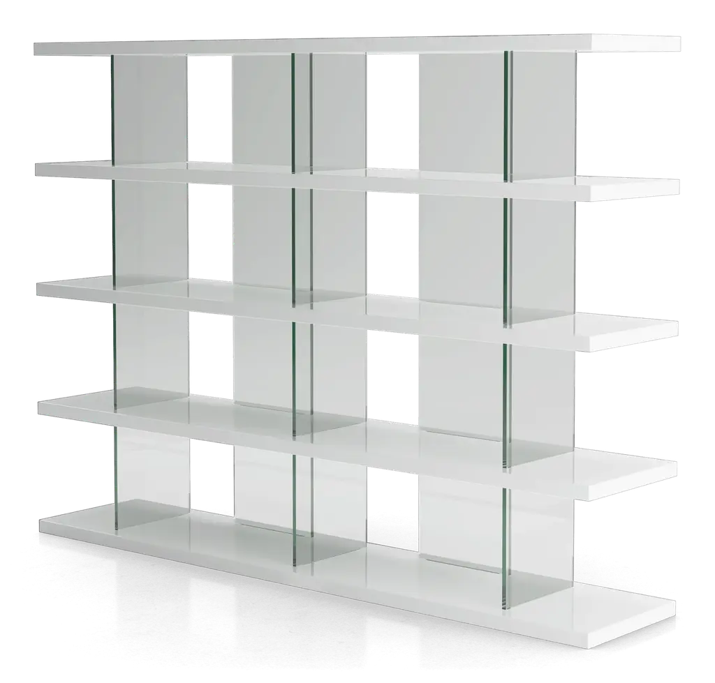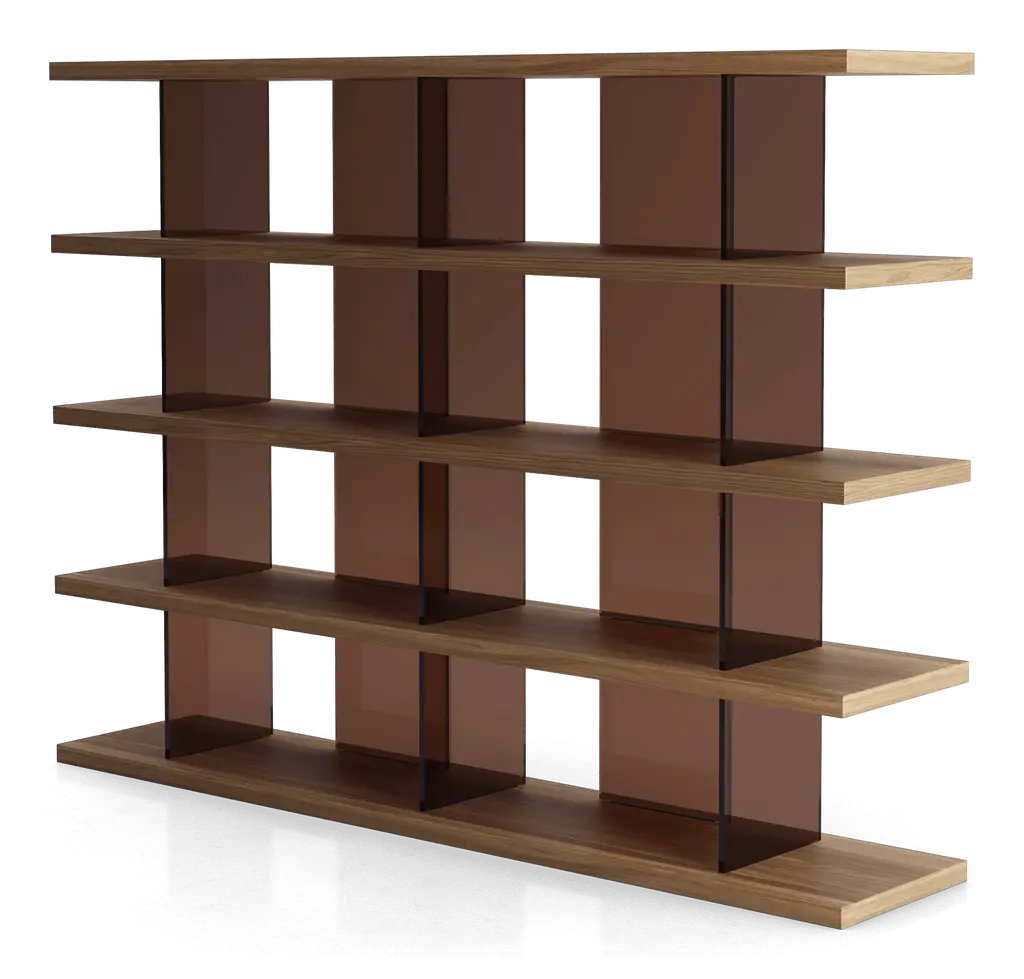 Showcase your sophistication with the Beekman Bookcase. A multi-tier design featuring your choice of warm wood veneers or high-gloss lacquers affords incredible amounts of display space. Smoked transparent glass columns in complementary colors add a touch of class while contributing to the minimalist aesthetic.