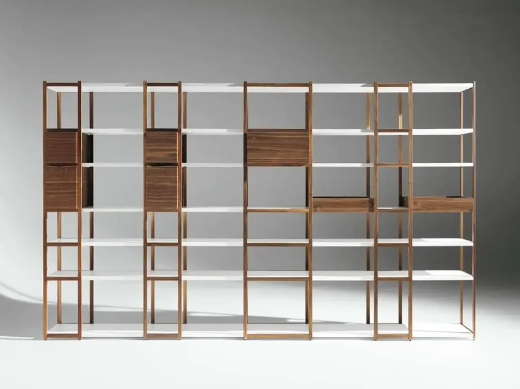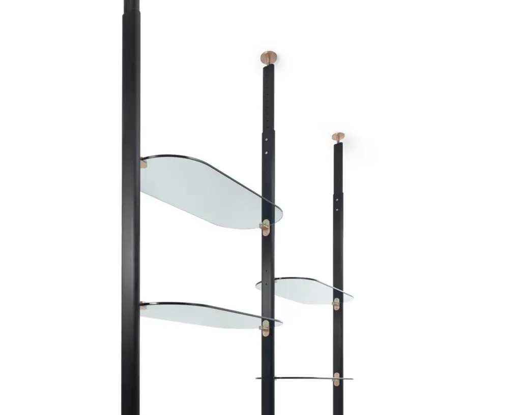 Ellen Bernhardt and Paola Vella for Arflex, Set of 4 'Alba' Sectional Freestanding Ceiling Fixed Bookcases. This is a wonderful and very versatile freestanding bookcase with many possibilities. This is for a set of 4 of version 'B' with 4 sections. More than 12 meters long and compositions you can create yourself. Great for a shop or boutique interior!Alba is a bookcase for displaying and containing, with exceptional compositional versatility. The shelves, thanks to the fixing elements with a single pin, allow to create round compositions.Please ask us about all the possibilities. About Bernardt & VellaEllen Bernhardt, born in Germany and Paola Vella, born in Assisi, Italy, both move to Milan in 2001. They meet at a design studio in Milan and start their collaboration based on affinity and a common vision of design, developed during their individual international working experiences. Design is understood as an individual interface, which can tell in a simple and clear way the project and at the same time convey emotion and poetry. Since 2008 they collaborate with important furniture companies, developing products and acting as artistic directors.