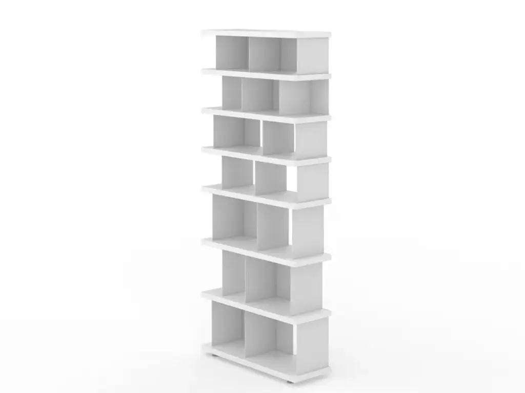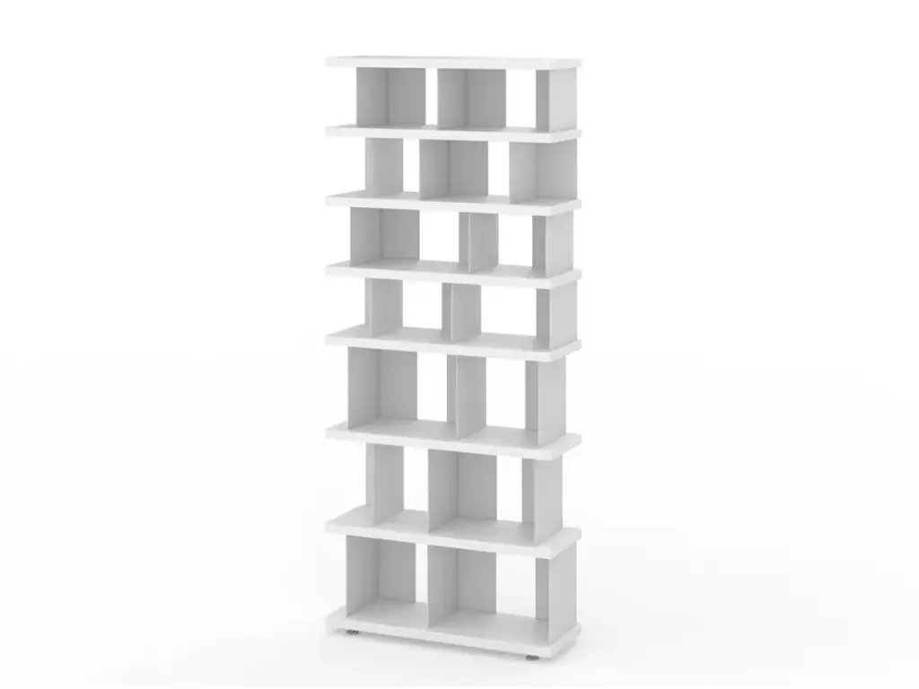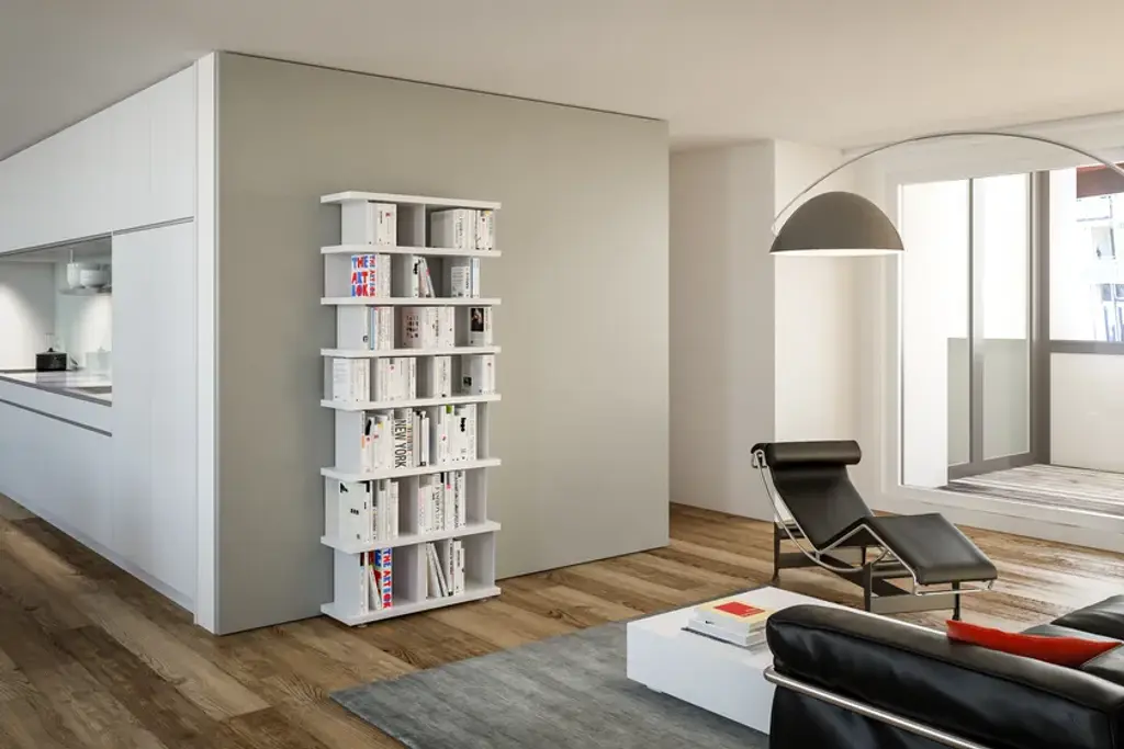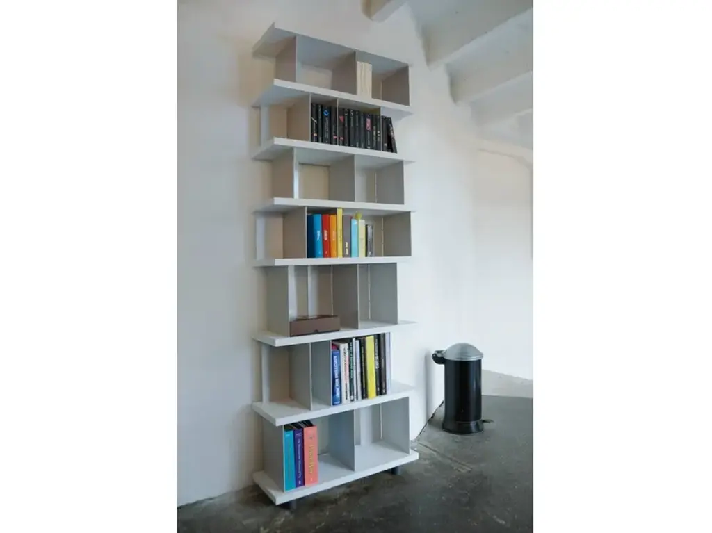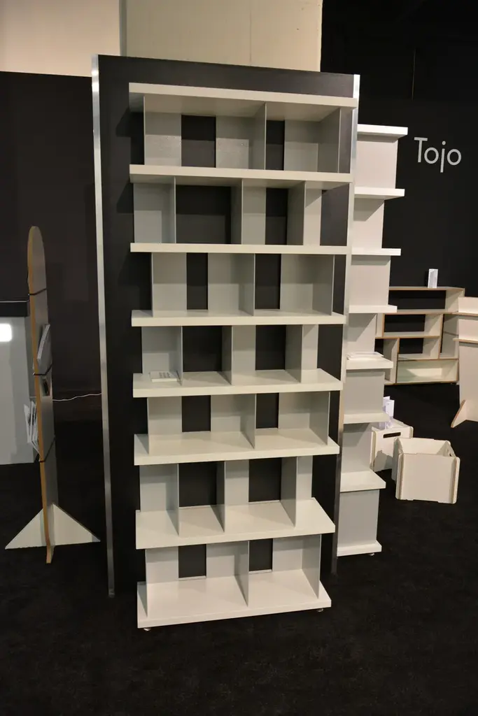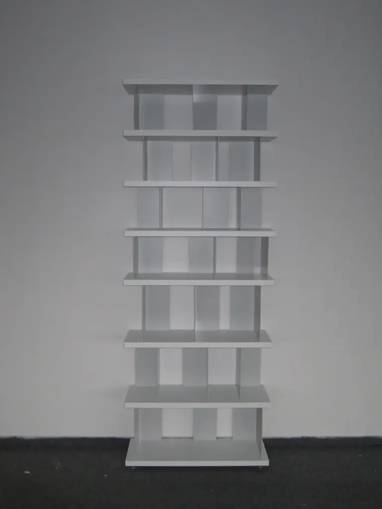 Bieg... the freestanding bookcase is the little brother of the shelf system Tojo-stell.The look has been refined and the dimension adapted at the common book formats. This makes it possible to build a flexible bookshelf, get both in the pocket books, as well as larger books with hard cover their own levels.Tojo-bieg is available in base and extension modules. The angle brackets are pre-bent and must only be used accordingly.MaterialShelves MDF, white painted mattAngle brackets aluminium, light gray powder coated.DimensionsShelves: 80 x 28 cmAngle bracket: 31 cm or 23 cm highThe shelf pictured consists of the following modules:1 x base-module large, 2 x extension-module large, 4 x extension-module small Award2010 Contribution of the Kanton Bern for design and creation