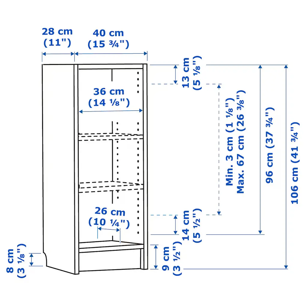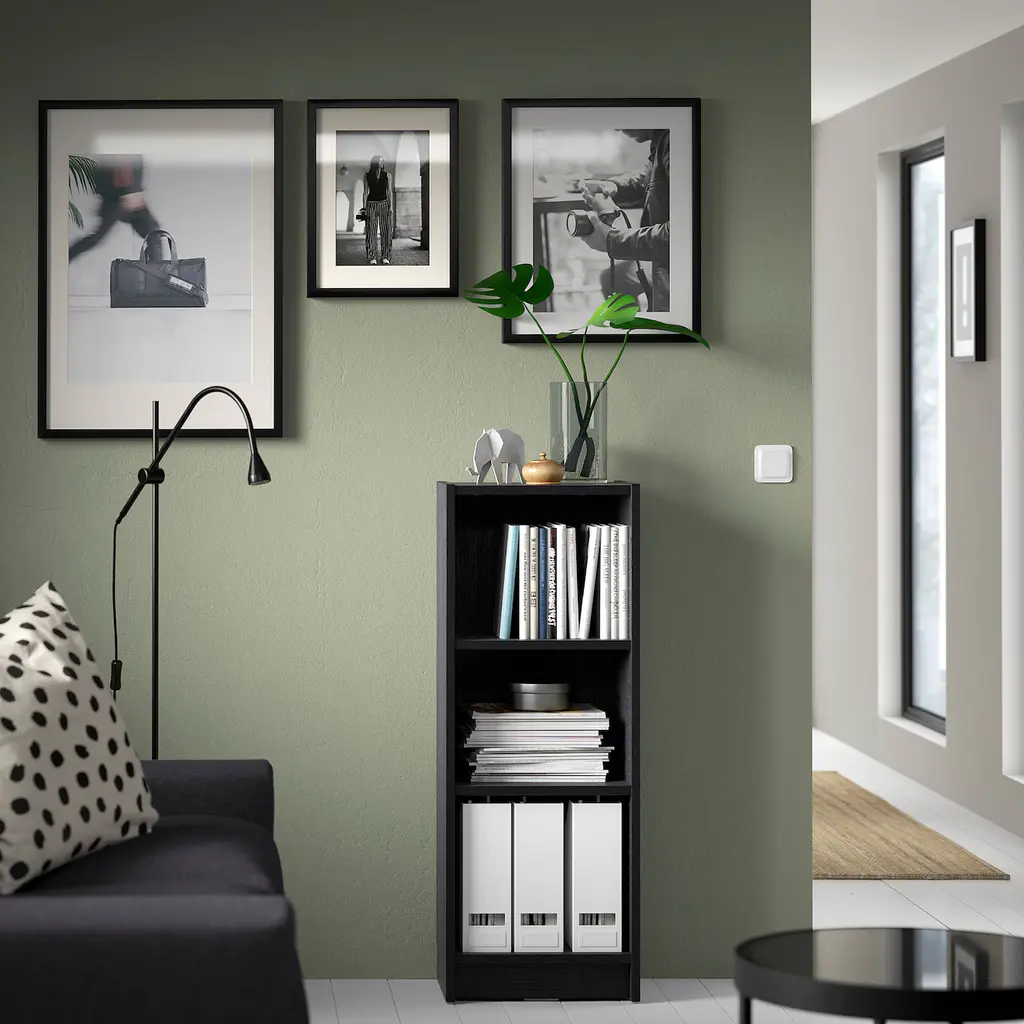 BILLY Bookcase - black oak effect 15 3/4x11x41 3/4 ". BILLY is a versatile bookcase that works just as good as a storage unit and is suitable to use in many different ways at home. BILLY has a simple and timeless design that is easy to personalize by adding boxes, lighting and your favorite items.