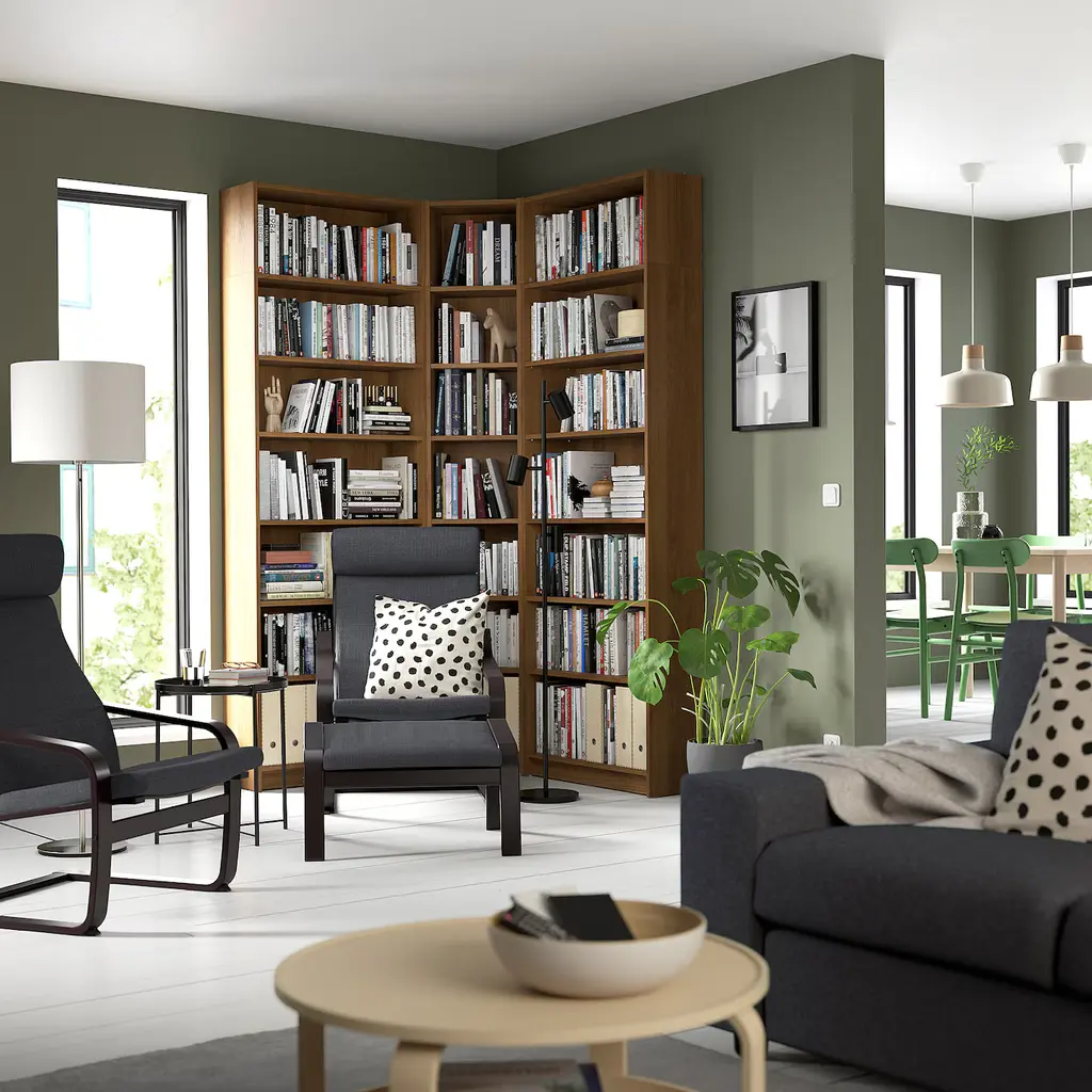 BILLY Bookcase corner comb w ext units - brown walnut effect 53 1/2/53 1/2x11x93 1/4 ". BILLY is a versatile bookcase that works just as good as a storage unit and is suitable to use in many different ways at home. May be completed with extra shelves to add storage space.