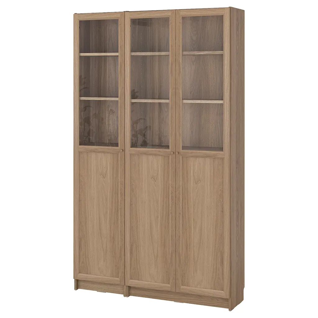 BILLY / OXBERG Bookcase with panel/glass doors - oak effect/clear glass 63x11 3/4x79 1/2 ". Keep in mind that you need enough space between the top of the furniture and the ceiling to be able to anchor the product to the wall. May be completed with extra shelves to add storage space.