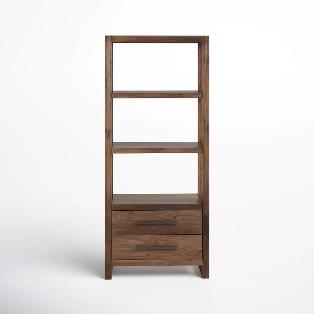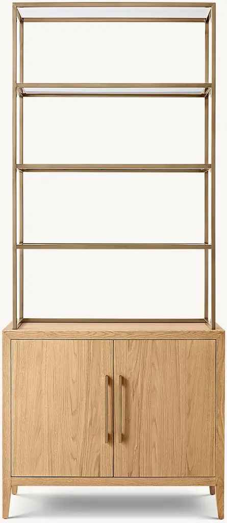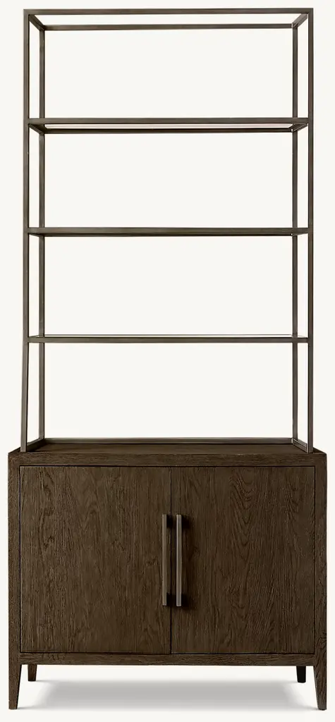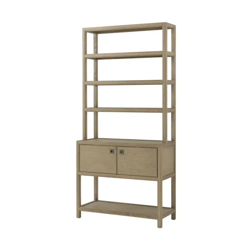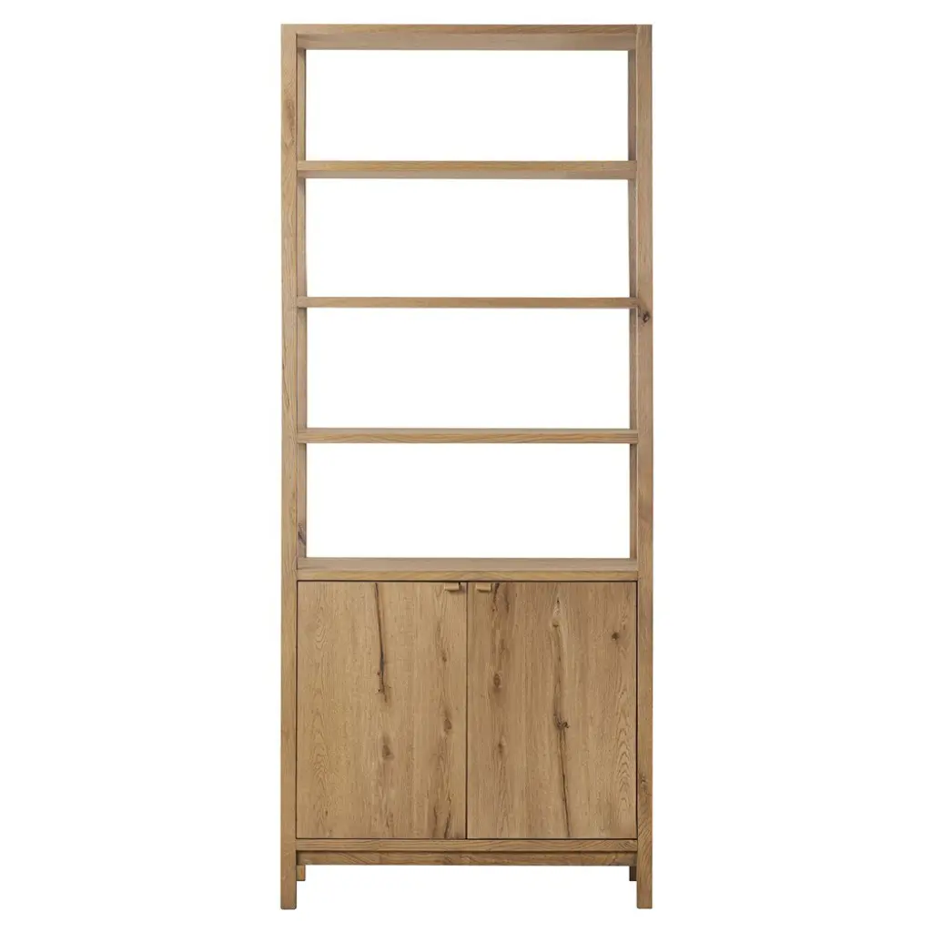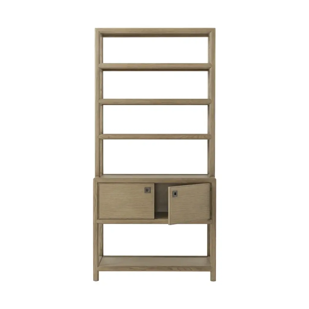 A highly functional and stylish addition to any home. This rustic oak veneered bookcase features beautiful herringbone parquetry, three veneered shelves, and a herringbone parquetry design on the bottom drawer. This type of open bookcase is ideal to display all of your most precious treasures. Sitting upon a tapered leg with Verde bronze finished knobs to accentuate this hand-crafted oak piece.
