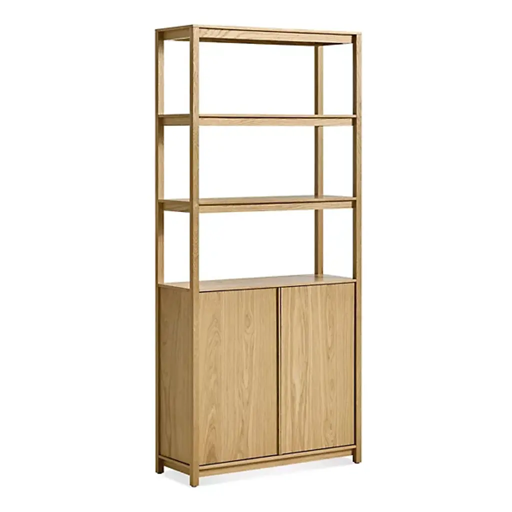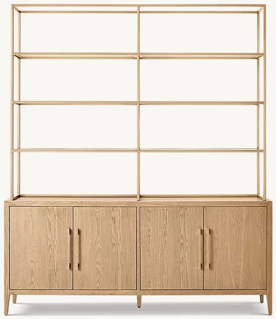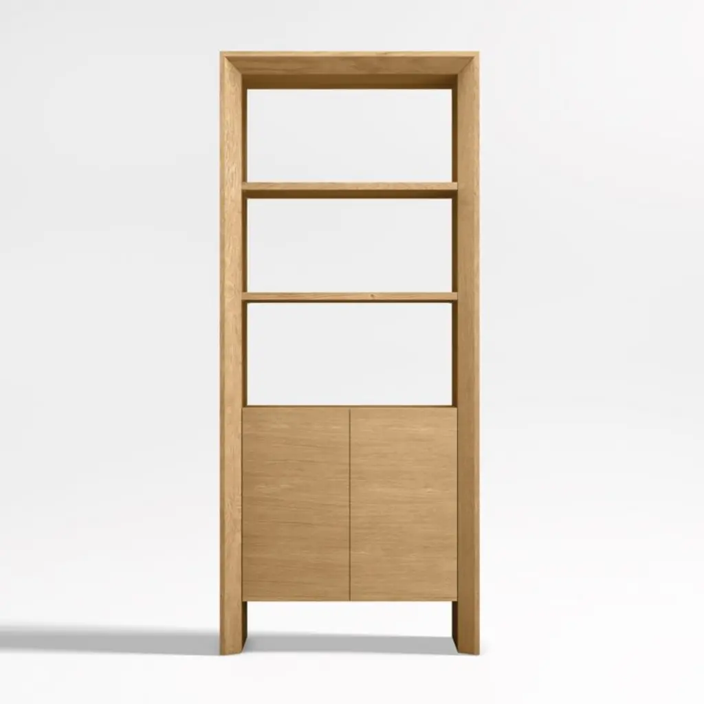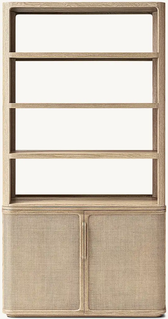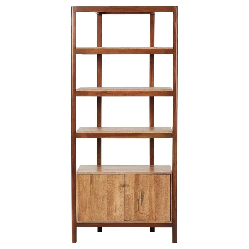 A highly functional and stylish addition to any home. This rustic oak veneered bookcase features beautiful herringbone parquetry, three veneered shelves, and a herringbone parquetry design on the bottom drawer. This type of open bookcase is ideal to display all of your most precious treasures. Sitting upon a tapered leg with Verde bronze finished knobs to accentuate this hand-crafted oak piece.