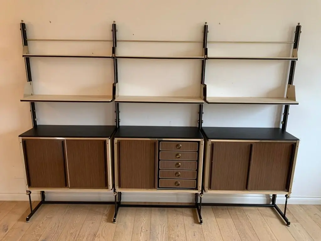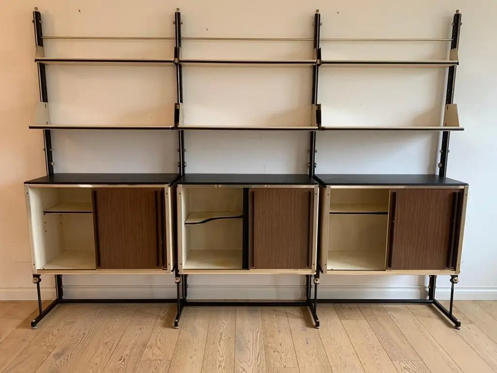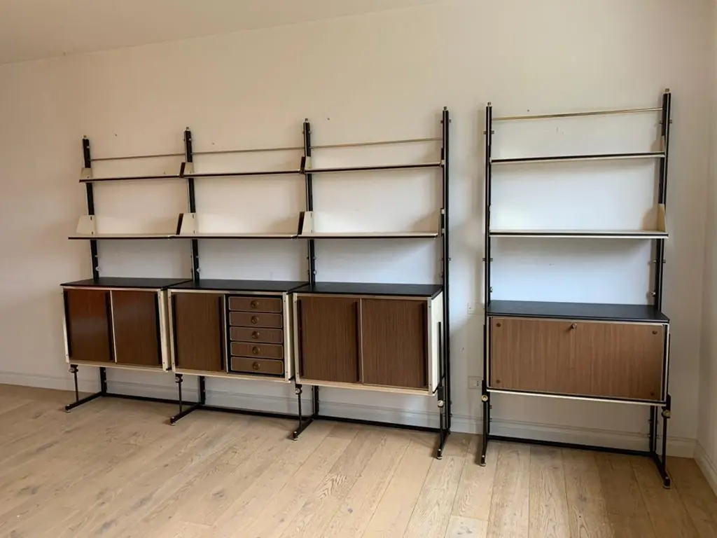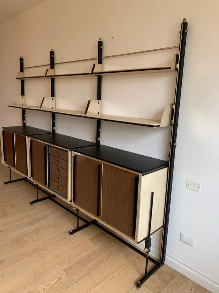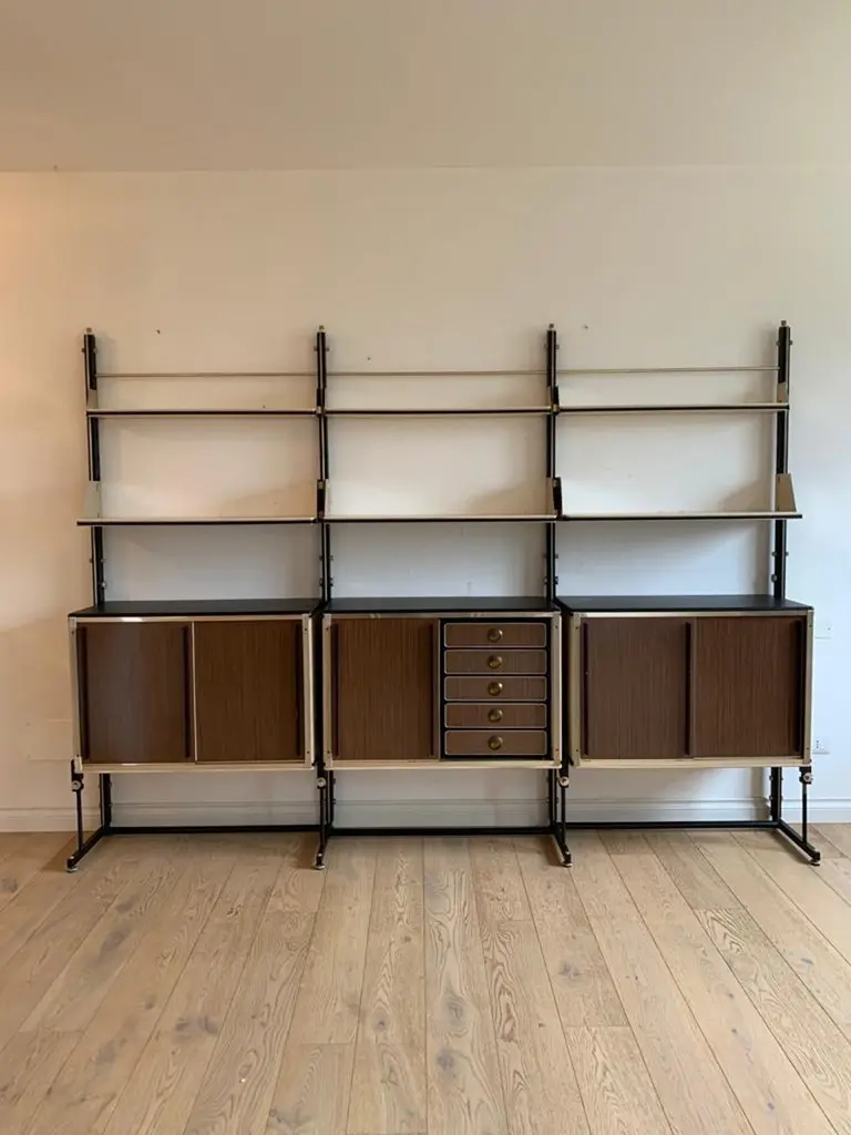 Modular bookcase unique in style, design, planning and materials. The Mascagni company for the excellent quality and uniqueness of its products boasted in the 50's a reference of exclusivity for luxury furniture, Harrods stores agreed to a distribution of products. Materials Wood, laminate, vinyl, steel, brass, aluminum. The bookcase can be assembled, disassembled and adjusted by hand through comfortable small parts. The furniture is in good condition and it will be our care to further verification before delivery. Packing in wooden crates for wall units.