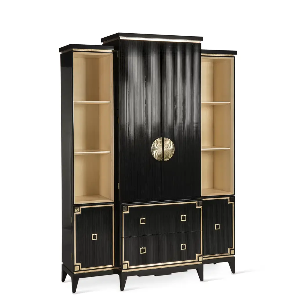 Bookcase Deco, upper part with two doors and lateral shelves. Down, two central drawers on metallic guides and two lateral doors. Brass finishings.