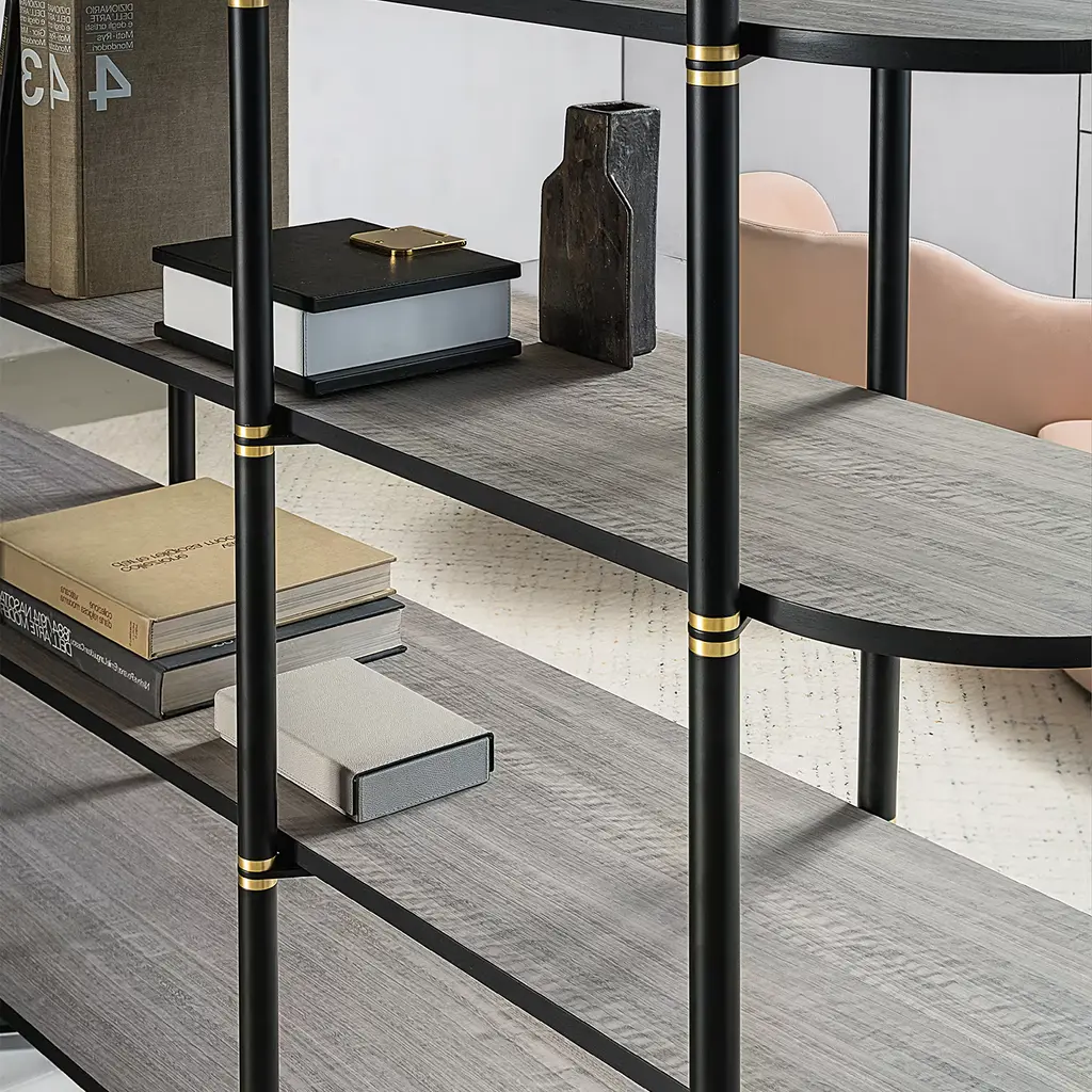 The bookshelf features a matte black painted metal frame with elegant brass details, adding a touch of sophistication. The shelves are made of particleboard panels, covered in a greige frisé eucalyptus veneer for a refined, natural look. Perfect for modern interiors, it combines industrial and organic elements, offering both style and functionality. A timeless piece for any spaces.