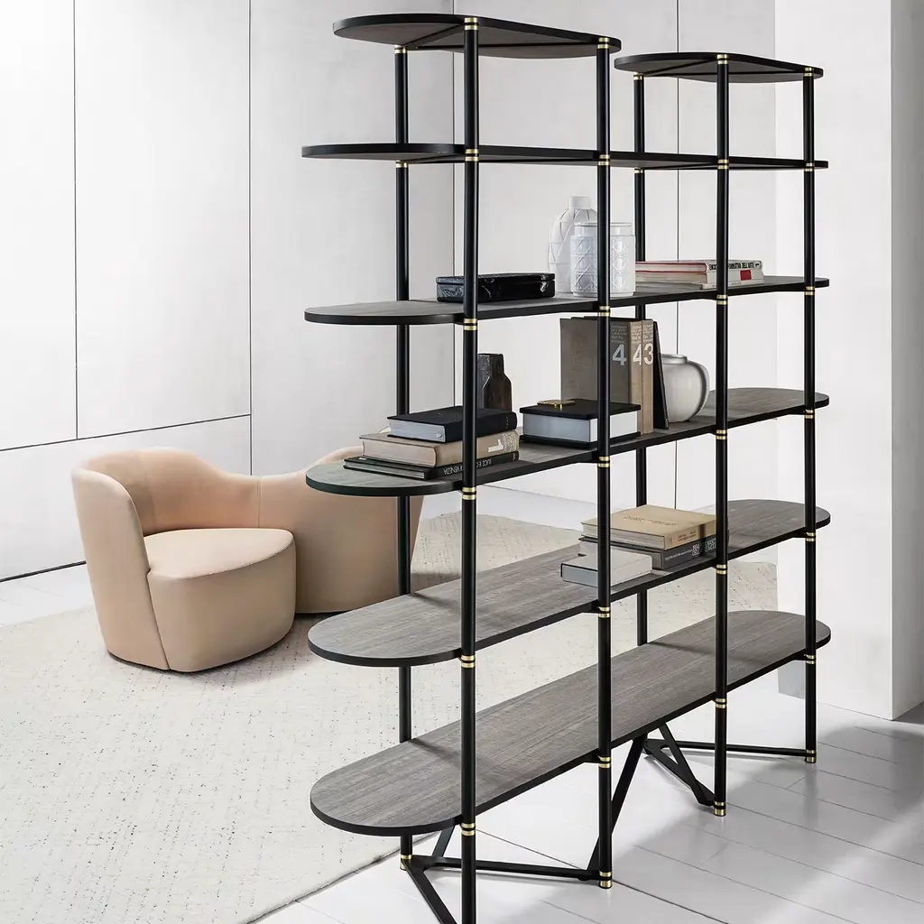 The bookshelf features a matte black painted metal frame with elegant brass details, adding a touch of sophistication. The shelves are made of particleboard panels, covered in a greige frisé eucalyptus veneer for a refined, natural look. Perfect for modern interiors, it combines industrial and organic elements, offering both style and functionality. A timeless piece for any spaces.