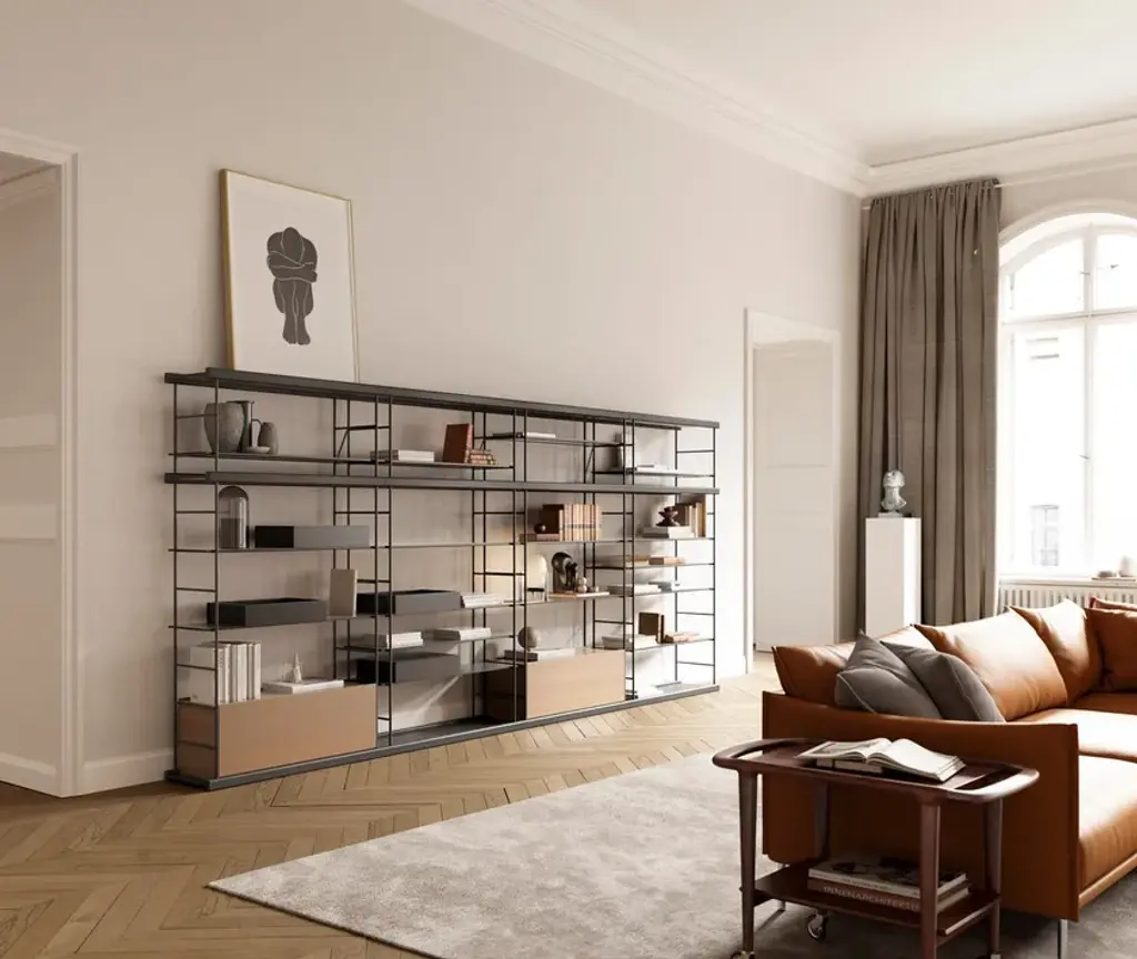 Bost shelving unit 2 m high in Walnut and Kai Black.Composition in photo:A144-MA941 Floor structure shelf with drop-down opening 110 x 150 x 43structure: GraphiteBase and top shelf: Graphiteshelf1: Graphiteshelf2: Graphitedoor: Tobacco OakA143-A ground-3 110 x 150 x 43 structure: GraphiteBase and top shelf: Graphiteshelf1: Graphiteshelf2: Graphiteshelf3: Graphiteshelf4: GraphiteC141A-Impilabile-1 110 x 49 x 43 structure: GraphiteBase and top shelf: Graphiteshelf1: GraphiteC142A-Impilabile-2 110 x 49 x 43 structure: GraphiteBase and top shelf: Graphiteshelf1: GraphiteC141A-Impilabile-1 110 x 49 x 43 structure: GraphiteBase and top shelf: Graphiteshelf1: GraphiteCA44-Container open 48 x 10 x 43drawer: GraphiteCC44-Container closed 48 x 11 x 43drawer: GraphiteCC44-Container closed 48 x 11 x 43drawer: GraphiteCA44-Container open 48 x 10 x 43drawer: GraphiteFor more finishes, please contact the contact center.Simplicity, innovation and originality. Without extravagance. This is the philosophy of Yonoh, the creative study that has created the new modular shelf Bost for Treku. The result is a product that harmonizes wood and metal organically and work in different spaces in the home or in the work place.“Bost arose from a formal idea: how to make a simple model that combines wood and metal in a function way, sober, but with our most organic essence.” (Yonoh)
