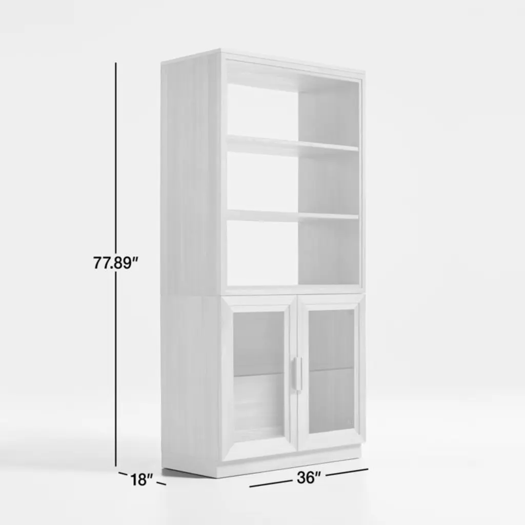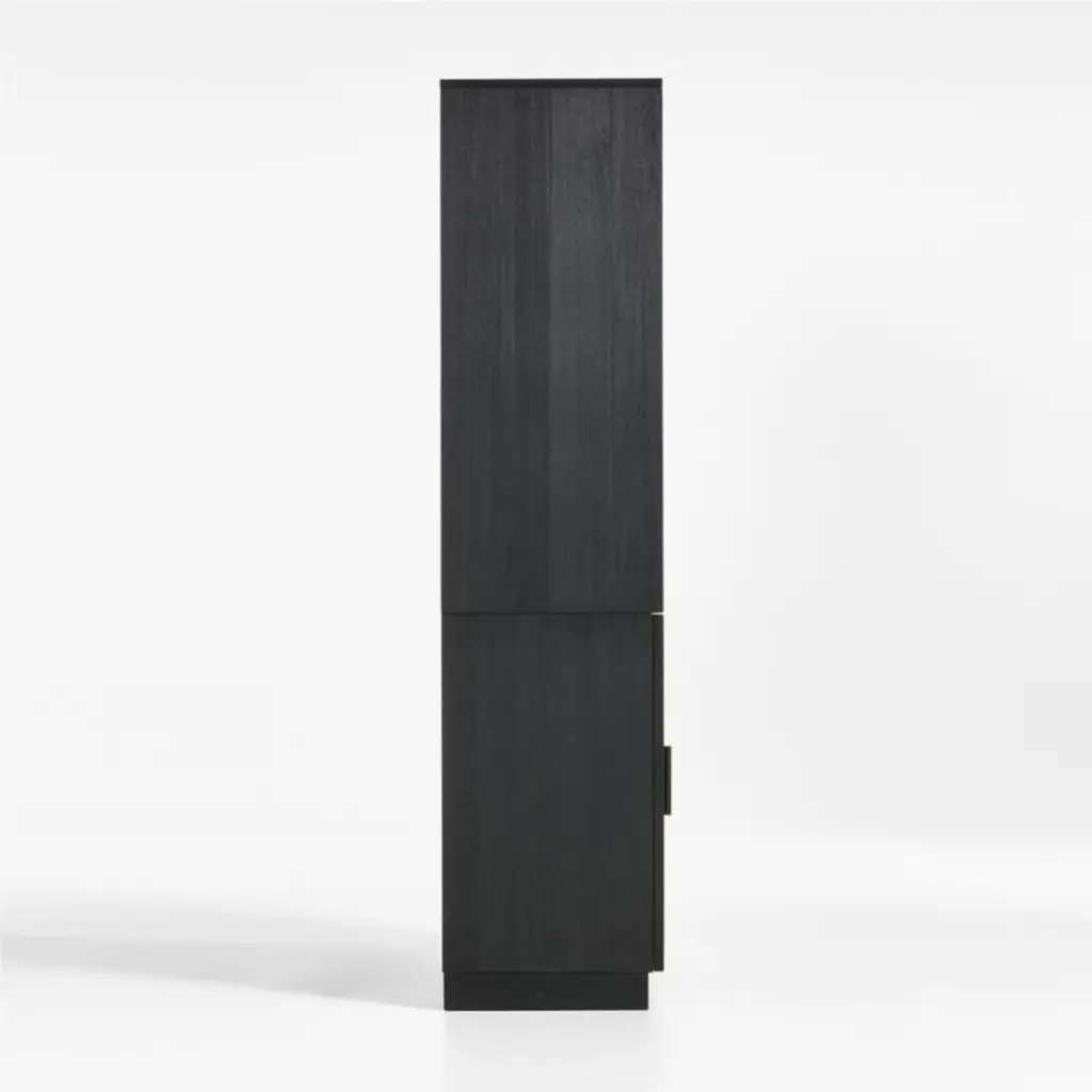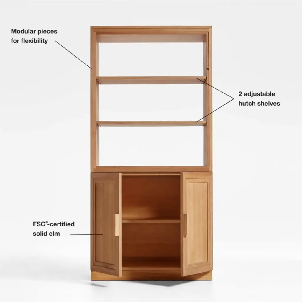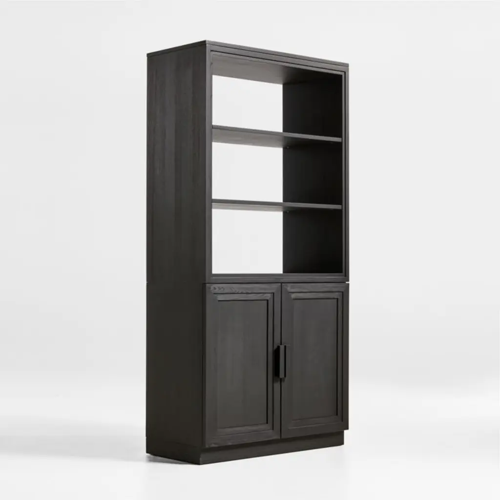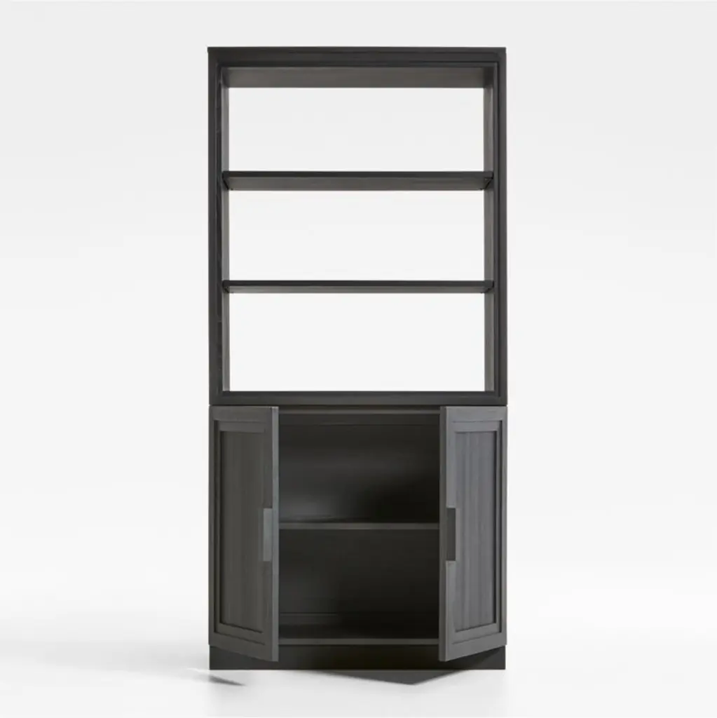 Inspired by classic barrister cabinetry, our Calypso collection opens up living room storage with a light and airy look. Elm wood frames each piece in this roomy configuration with stepped trim and a black finish to bring out the grain. The two-piece unit places a bookshelf hutch atop a wood-door cabinet base for a mix of open and closed storage of books, media components and collectibles. A recessed plinth base and blocky pulls add modern details to this timelessly styled black storage configuration, a Crate & Barrel exclusive.By choosing FSC ®-certified furniture, you are supporting responsible management of the world's forests.