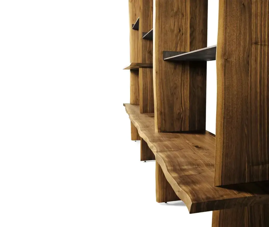 Dale Italia bookcases can also serve as a replacement for walls, dividing spaces according to your specific requirements. The originality of this model is in the notable stripped wood finish, a feature of the verticals and the shelves.• Colour: Natural Walnut• Finish: OilComposition:Back panel for stripped wood bookcase (x 4)Shelf for stripped wood bookcase, 1 compartment (x 1)Shelf for stripped wood bookcase, 3 compartments (x 1)Shelf in rusted metal L. 90 (x 7)