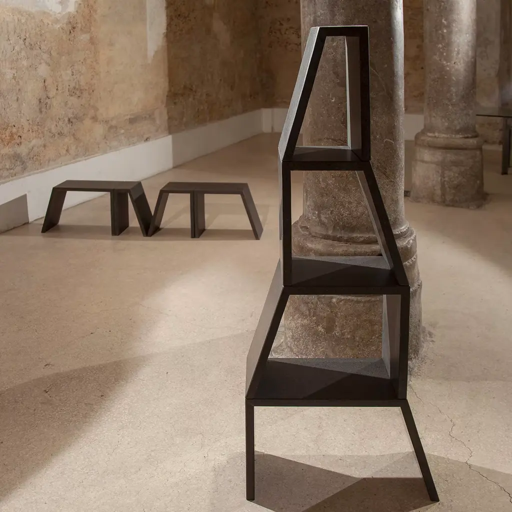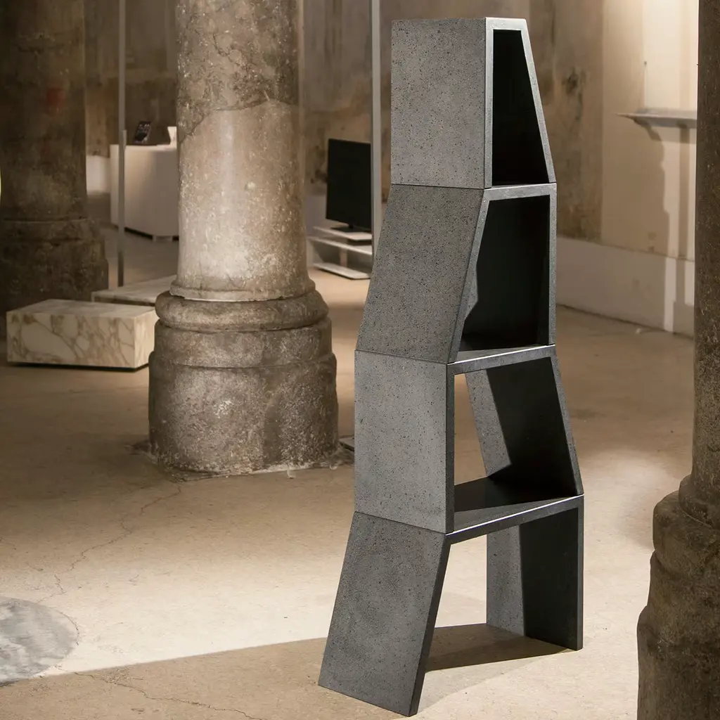 A series of asymmetrical modular components made of black lava stone are stacked one on top of each other to create this striking and versatile bookcase. The modules are designed to be assembled in several shapes for a variety of different uses, please ask the Concierge for details.