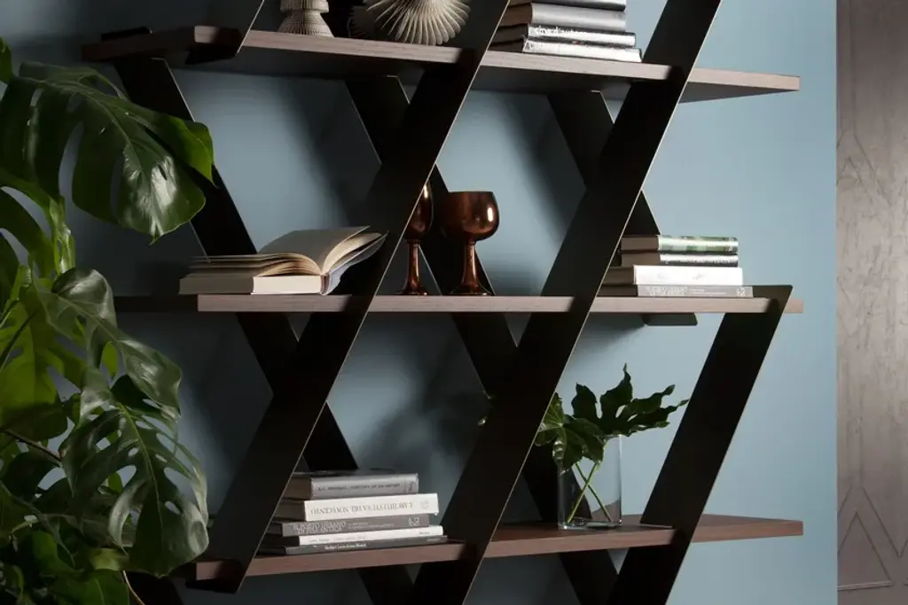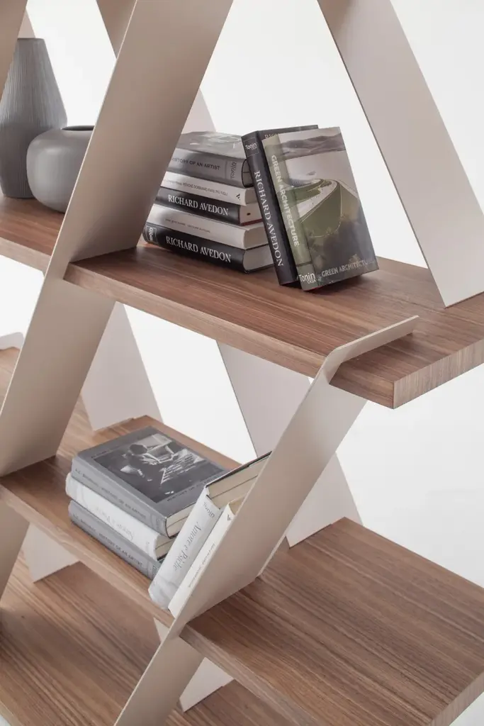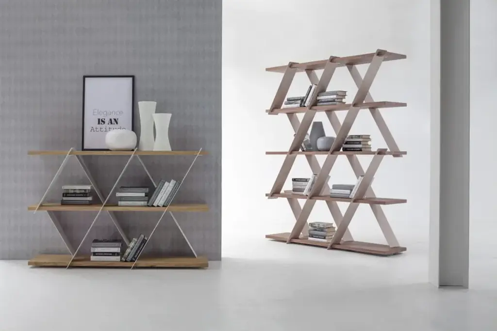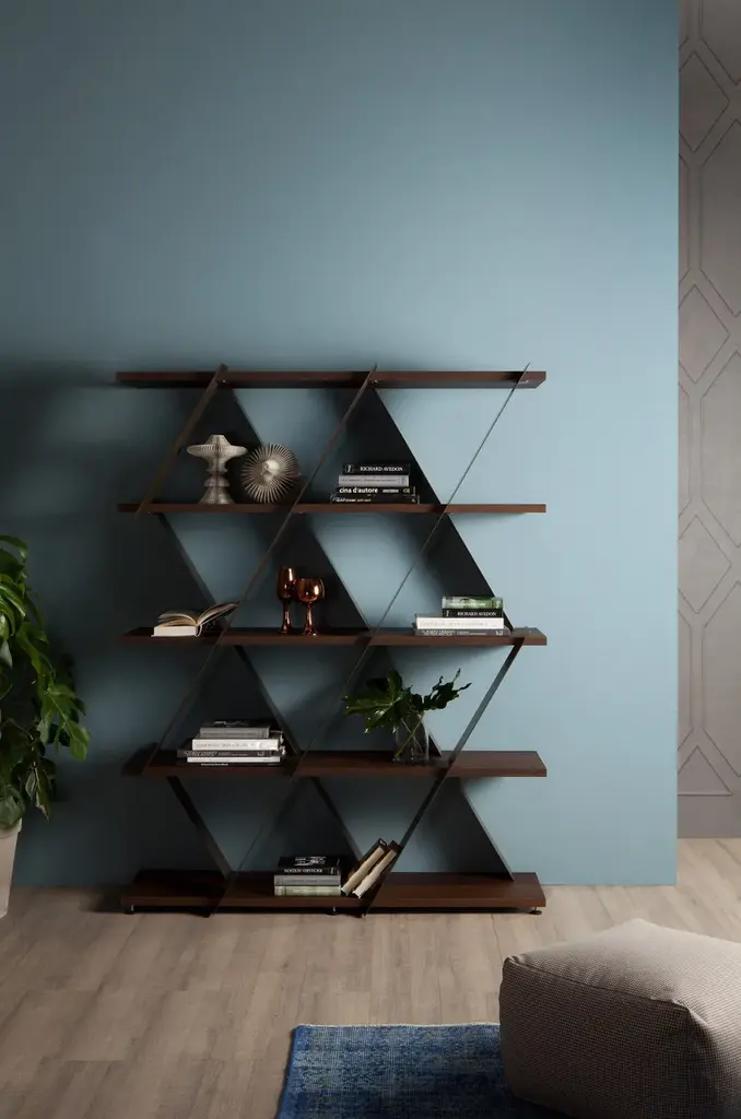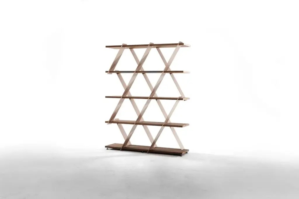 An essential and light structure, based on open spaces and light triangles that step into metal and wood.Just like a house of cards, CASTLE is filled with colors, with lighting effects created by its every finishing. Another aesthetic possibility is given by the chance to set it horizontal, or vertical. A magnificent game in design.
