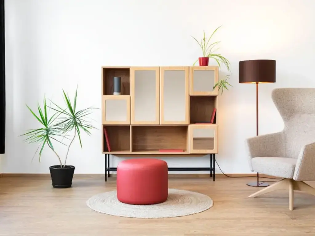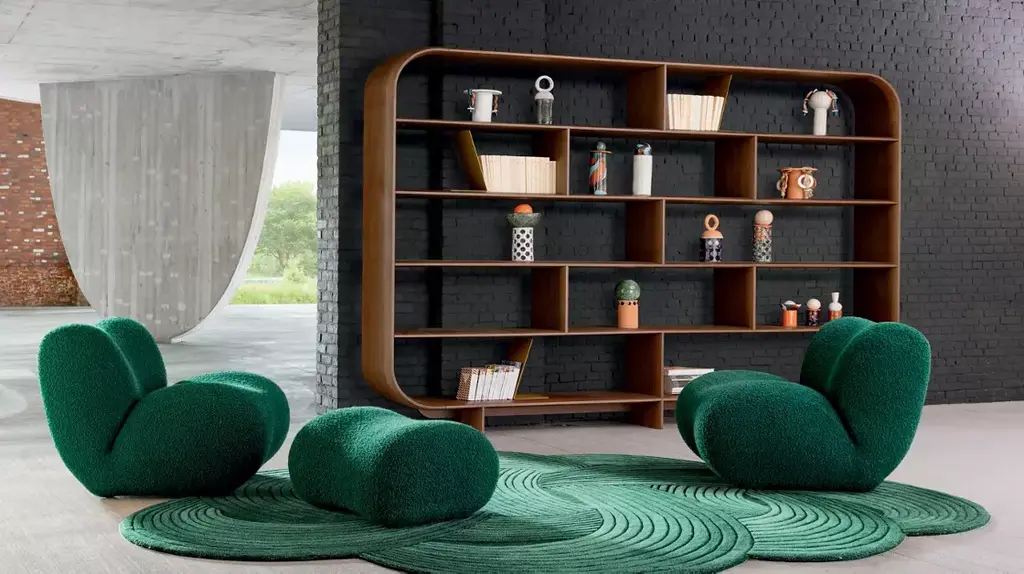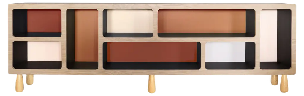 A blend of 1950s influences and Asian inspiration, Sacha Lakic's Celta bookcase features a walnut structure whose softened, graphic lines sculpt space with lightness. It plays with the contrasts of the wall, and its tapered shelves are enlivened by oblique book supports.