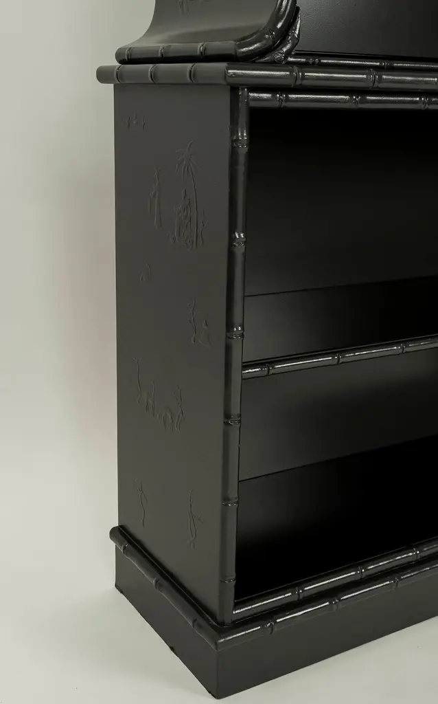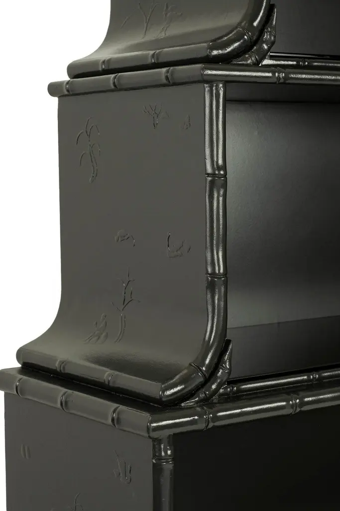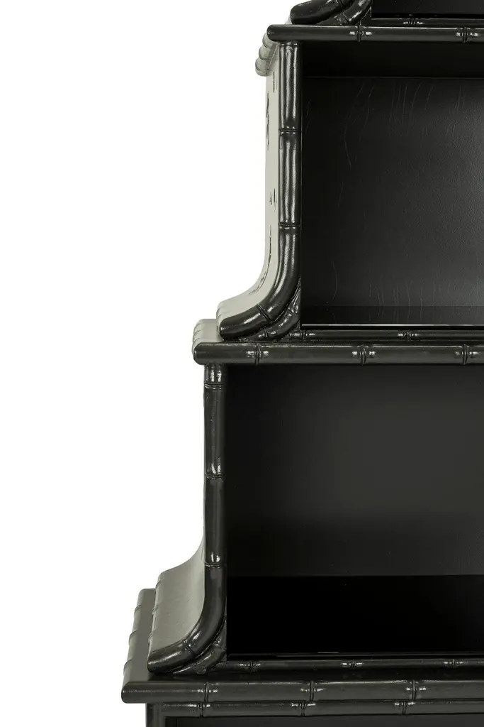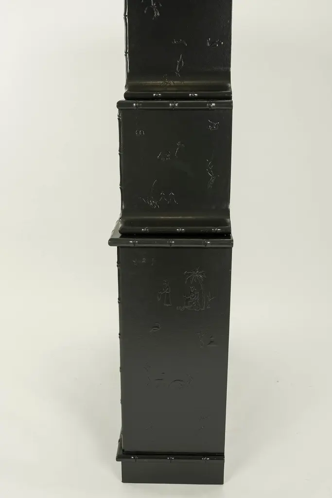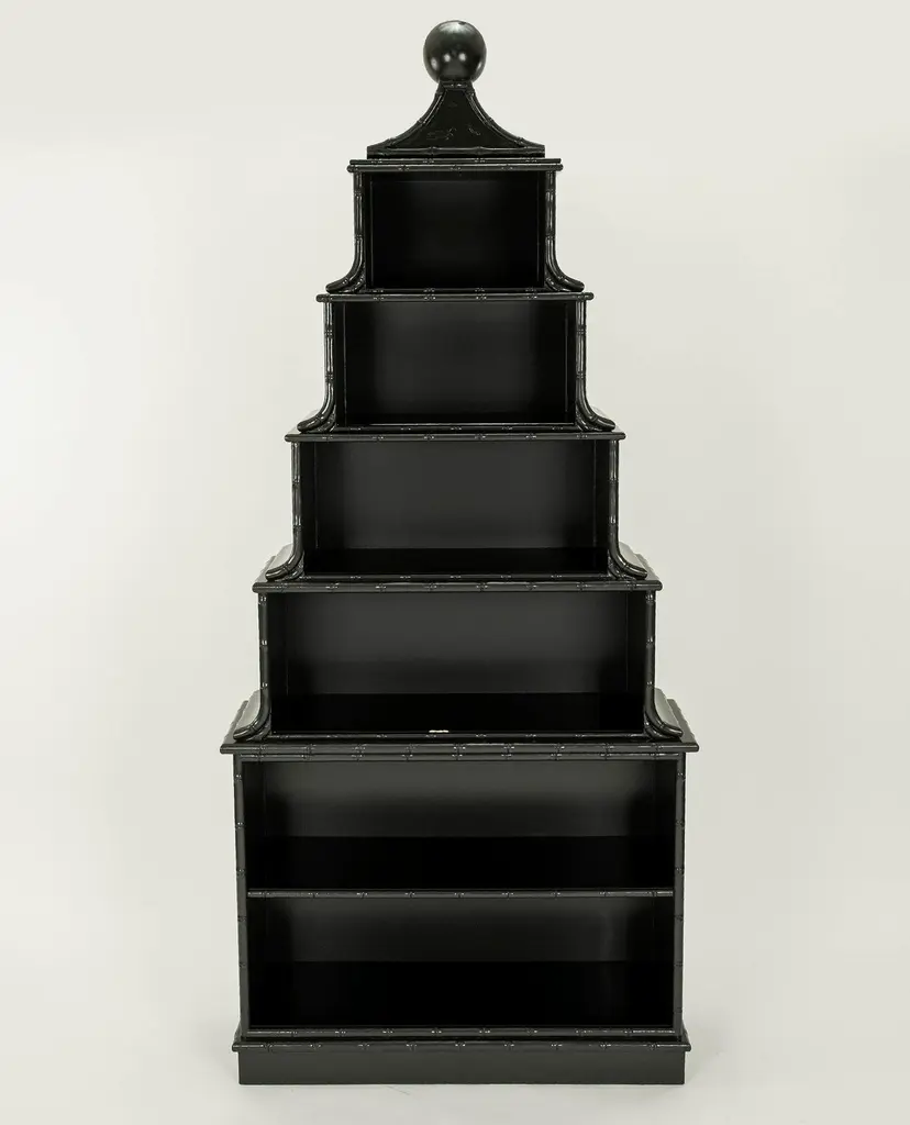 Dramatic vintage Stickley Chinoiserie hardwood bookcases or étagères newly styled in a dark charcoal paint with smokey glass shelves These contemporary cases are comprised of four sections that build upwards into a modern pagoda silhouette and were featured at the Kipps Bay Showhouse Dallas morning room and bar. Two available and are sold individually.