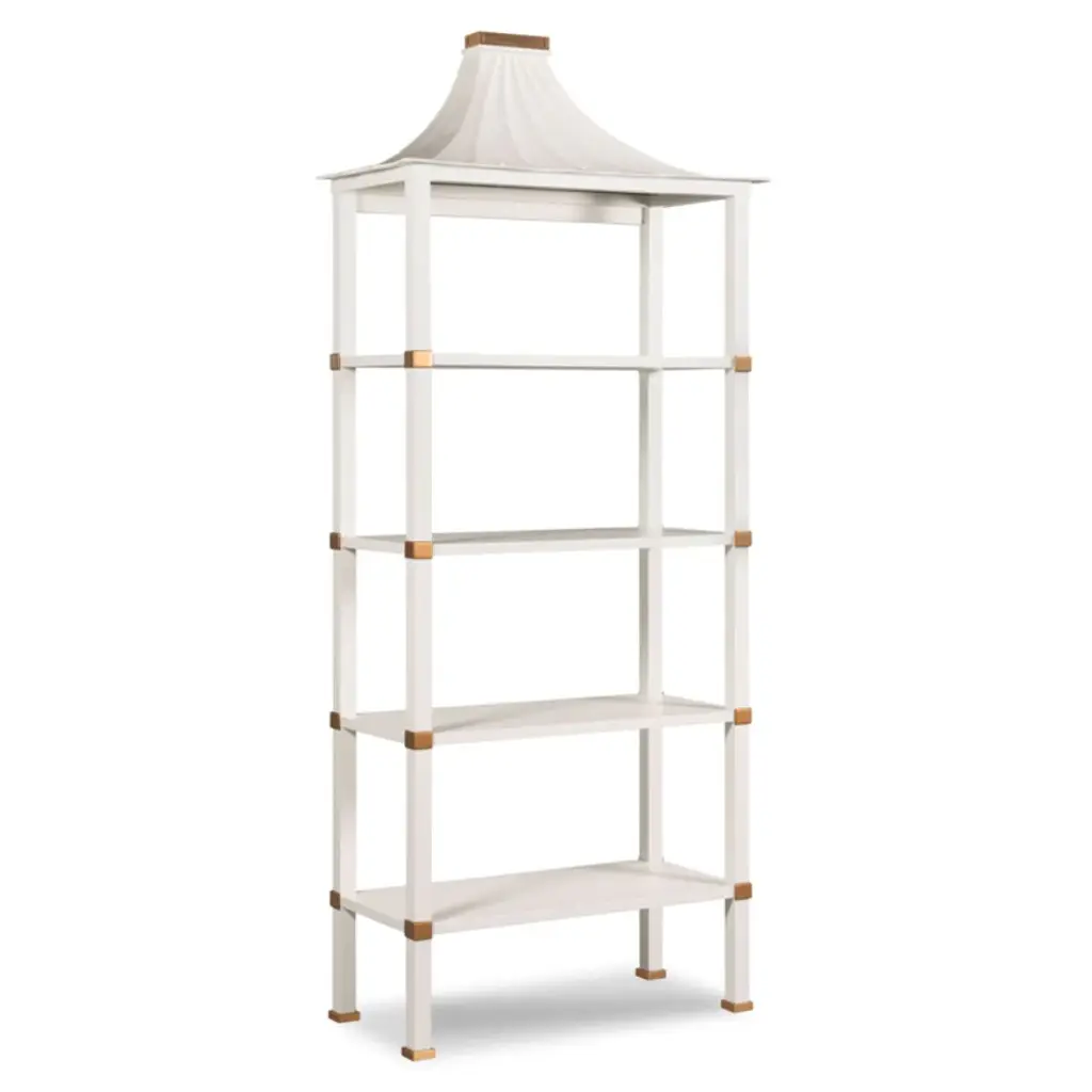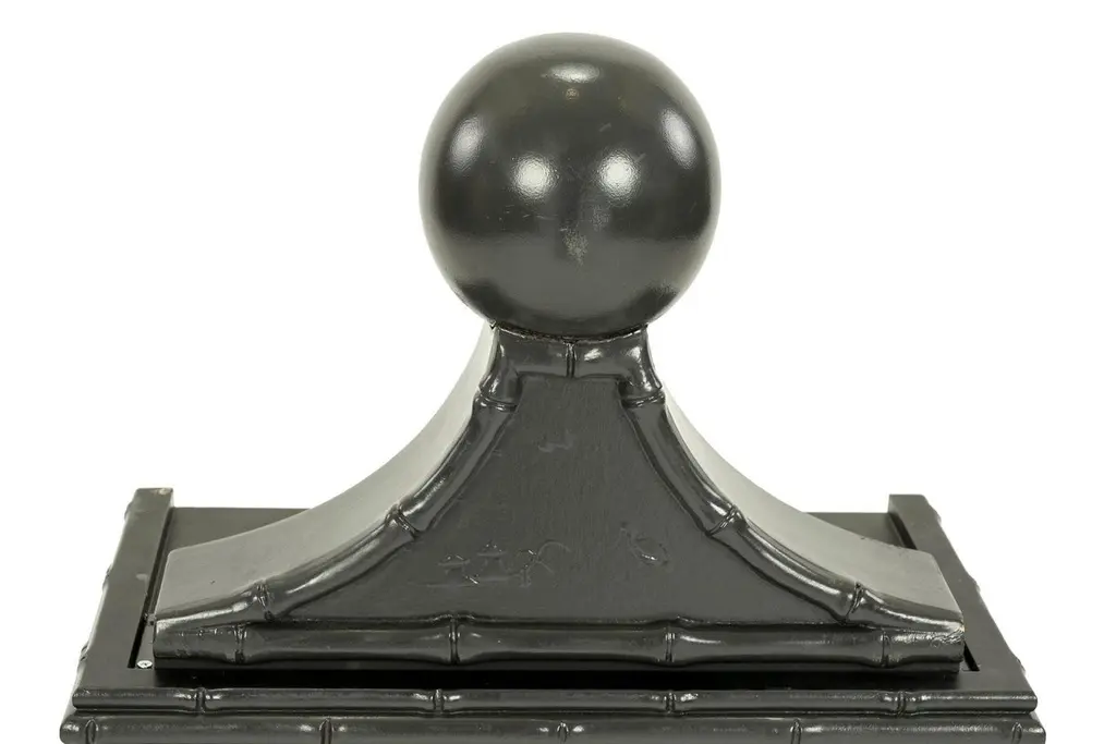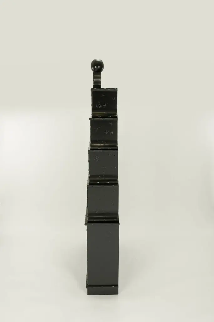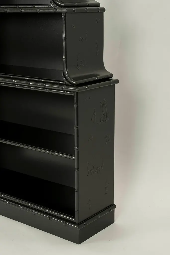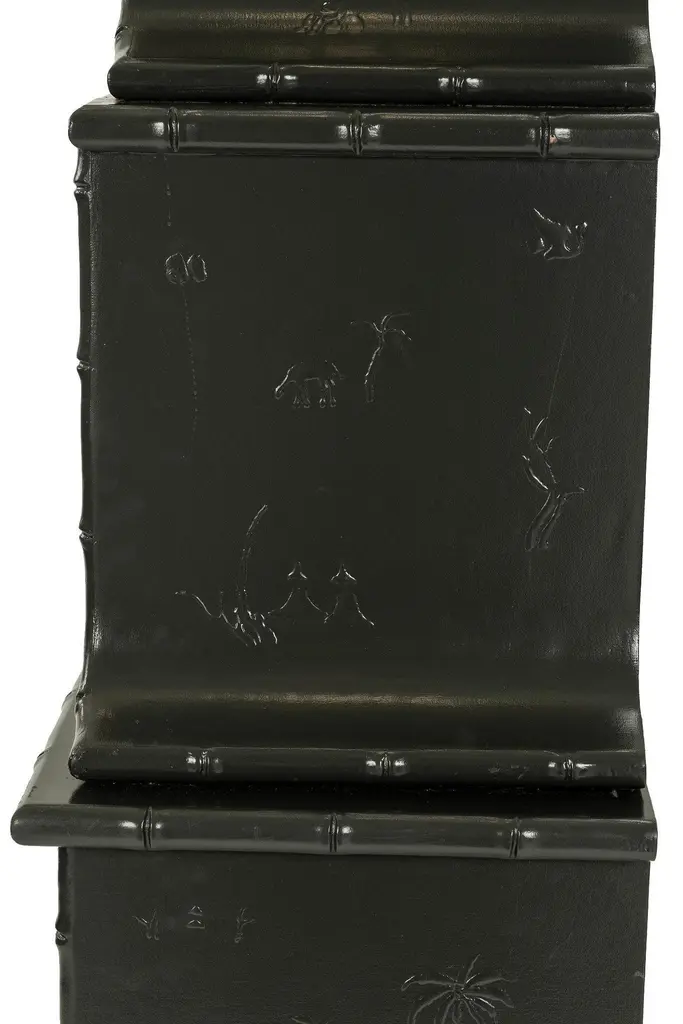 Dramatic vintage Stickley Chinoiserie hardwood bookcases or étagères newly styled in a dark charcoal paint with smokey glass shelves These contemporary cases are comprised of four sections that build upwards into a modern pagoda silhouette and were featured at the Kipps Bay Showhouse Dallas morning room and bar. Two available and are sold individually.