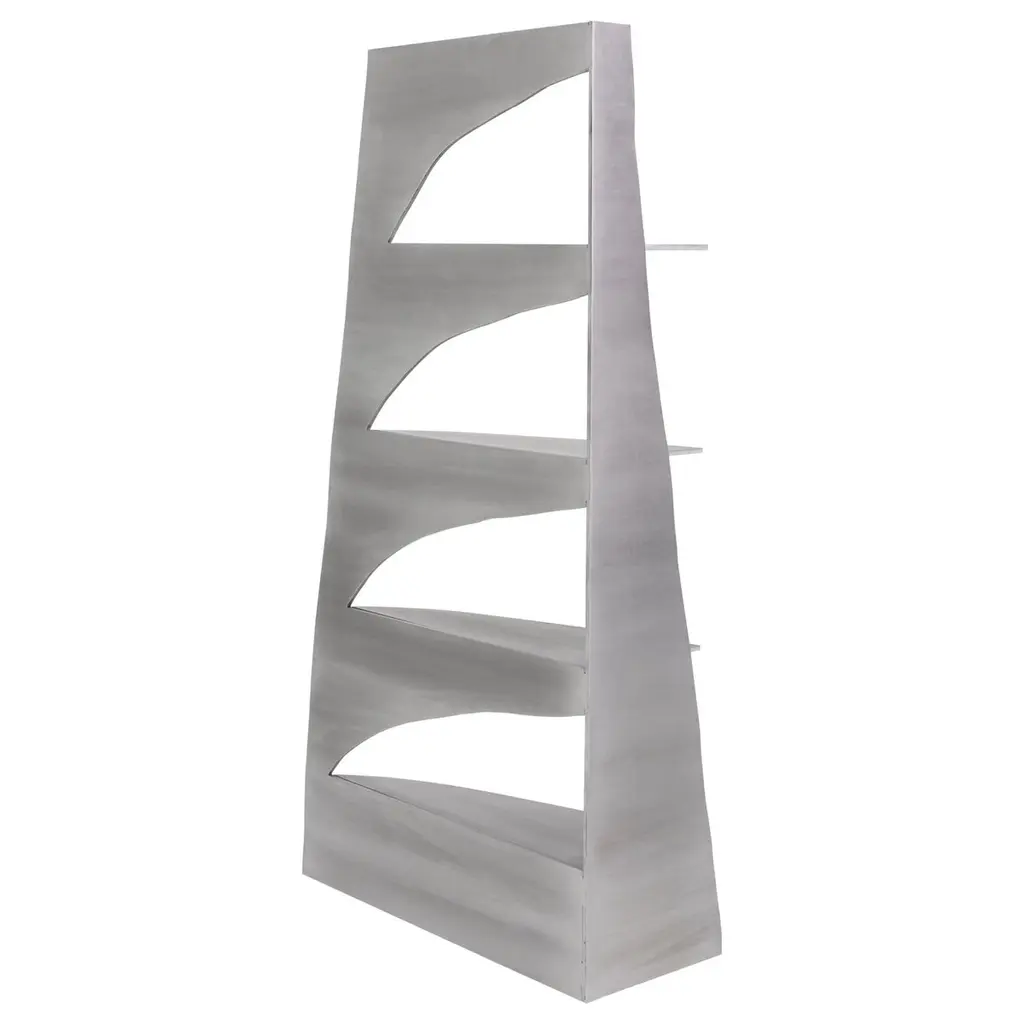 Born from the creative mind of famous designer Aziz Sariyer, this bookcase is crafted entirely of aluminum with a dark silver finish and it's distinguished for its challenging curves and thin profile. Three horizontal folds are intersected vertically by a long fold to form six shelves in a design that evokes the shape of a chocolate bar. This symmetric silhouette is the perfect choice to display books and collectibles in a contemporary living room or private office.