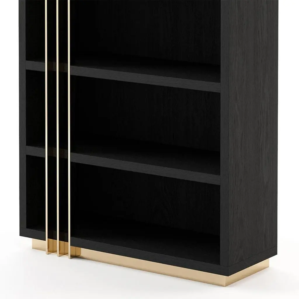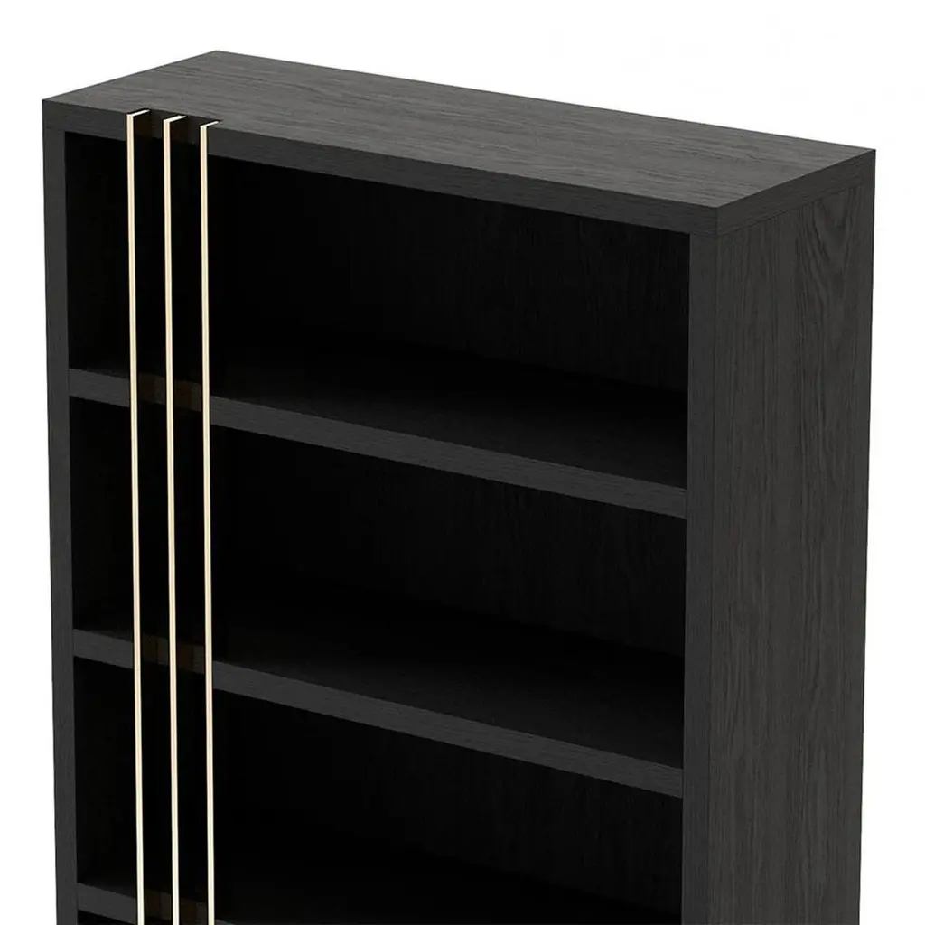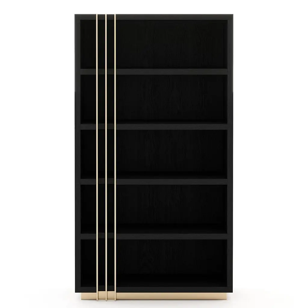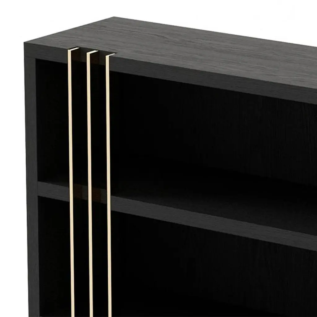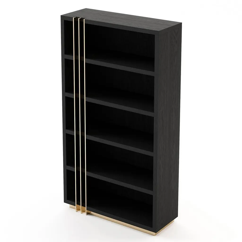 Bookcase Clark Black Ash with structure in ash vennerin black matte finish, with 3 vertical polished stainless steel trims in gold finish.Also available in ebony matte finish, or grey oak matte finish,Or natural oak finish, or rosewood matte finish, or in walnut finish,on request.