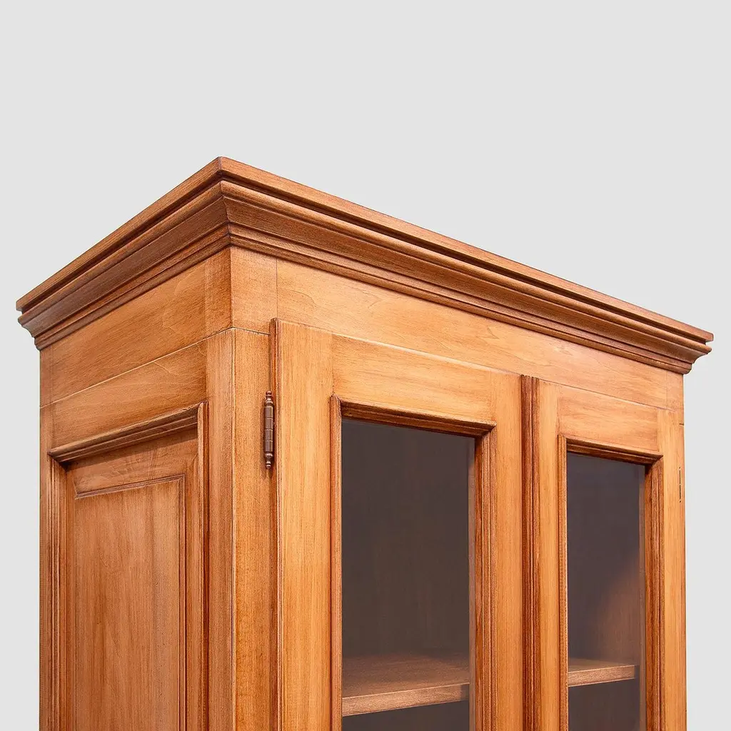 An exquisite example of classic style, this bookcase features a tall structure entirely handcrafted of tulipwood and stained in light walnut using nontoxic, sustainable lacquers. Framed by streamlined borders and frame-like decorations carved on the front and sides, the doors feature a double-hook closure and open to reveal four adjustable shelves where to store books and display collectibles. The piece can be fully disassembled. Hand-finished with beeswax.