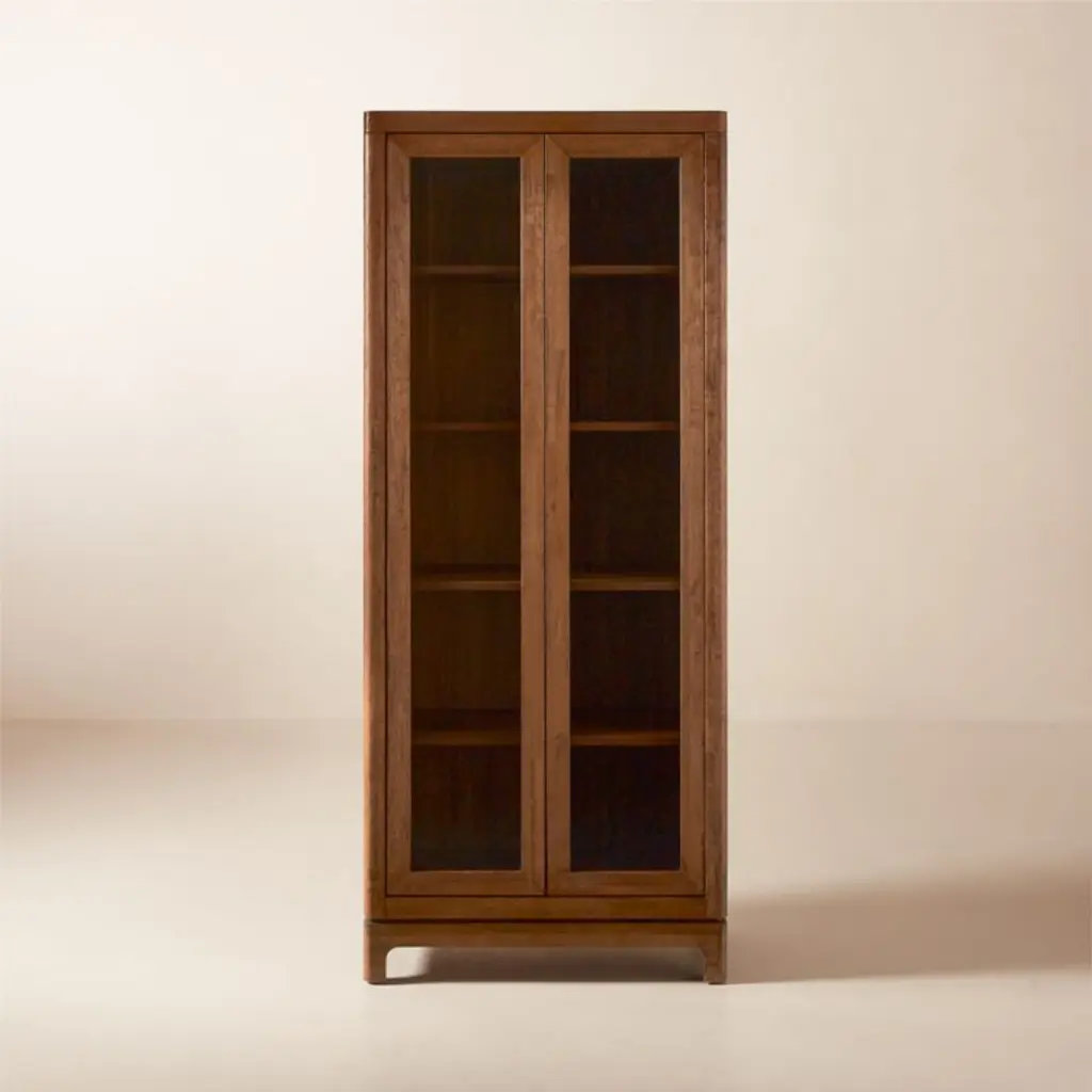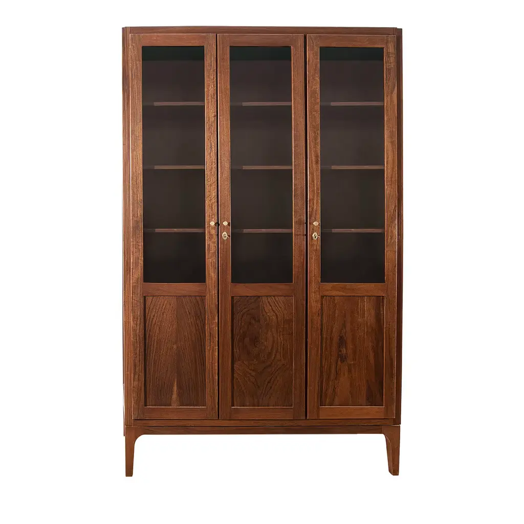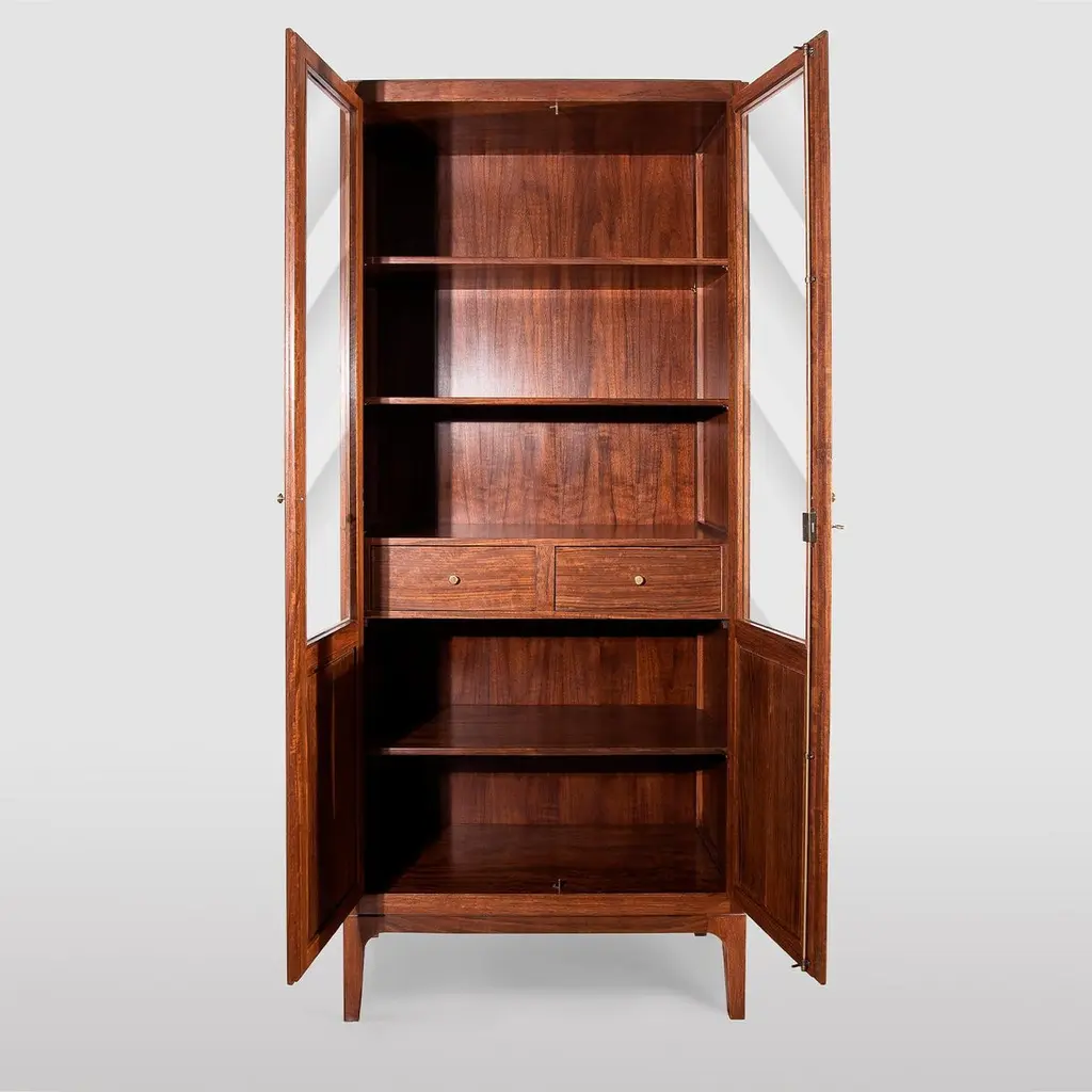 This modern display cabinet exudes a rustic flair with its intense grain and minimal details. It is marked by a tall structure handcrafted of solid Daniela walnut wood raised on tapered feet and equipped with two sections - a lower, closed section and a taller, upper section with glass double doors. Featuring double-hook locks and open to reveal three adjustable shelves with two drawers with cut-out handles. The piece comes disassembled and supplied with instructions. Entirely customizable.