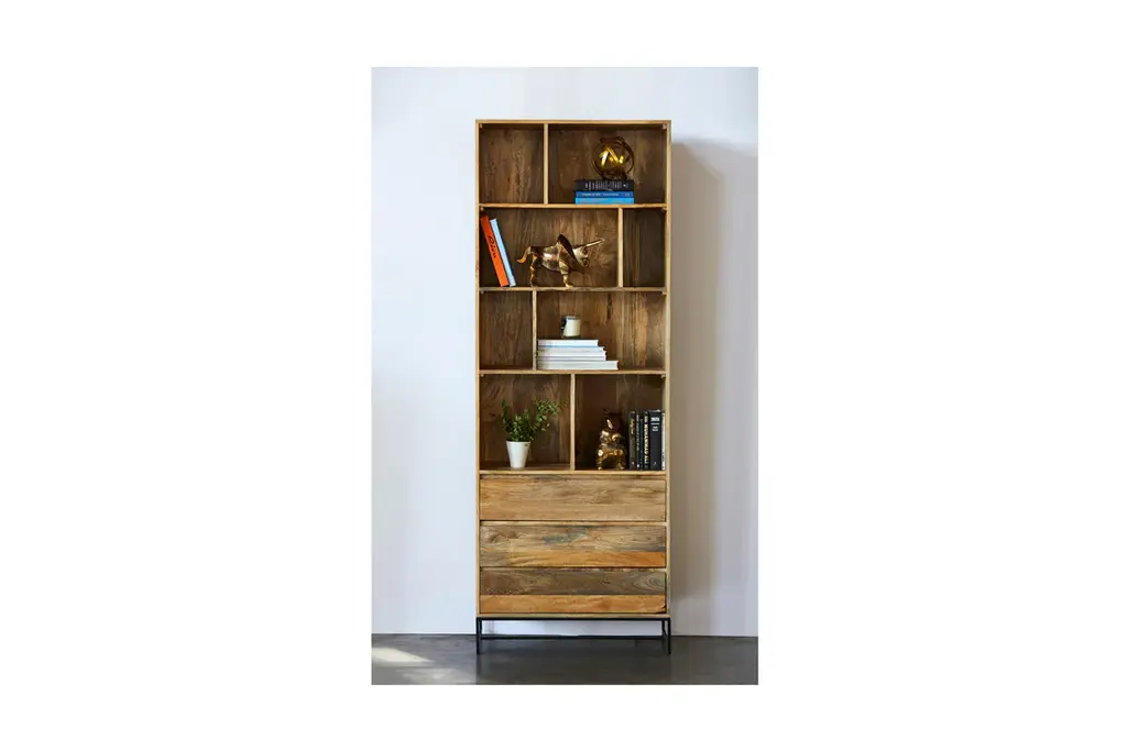 The Clovis Bookcase offers an elevated take on storage furniture. Its clean lines and minimalist silhouette take inspiration from contemporary Scandinavian design, stylishly marrying form and function. It features solid mango wood construction, highlighting a unique woodgrain and knot pattern. Eight open compartments create unique frames around shelf contents, creating a gallery look for your decor, books, or choice belongings. Below, three closed drawers offer further hidden storage.