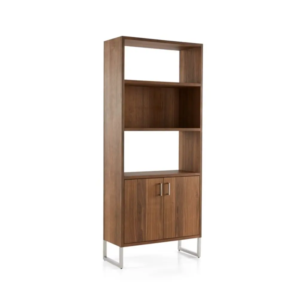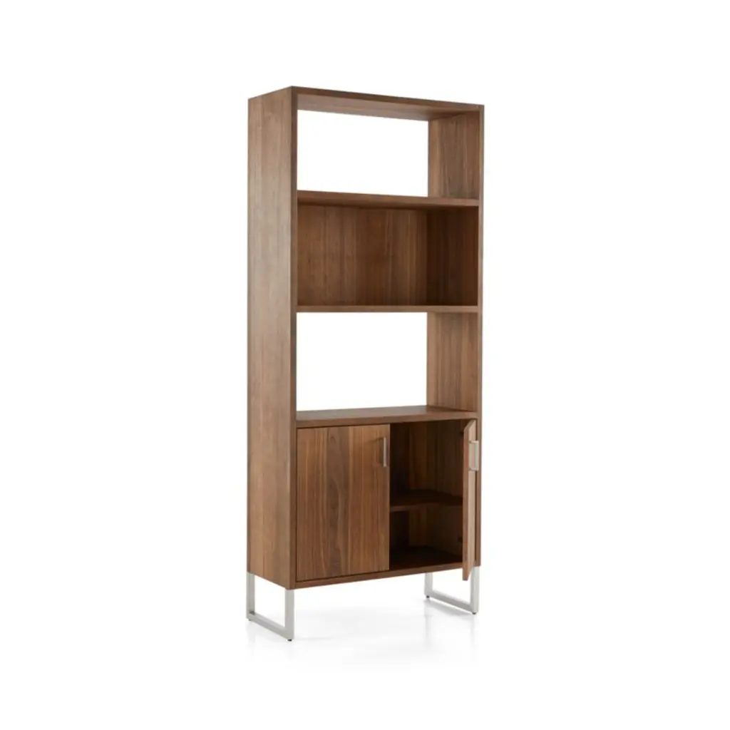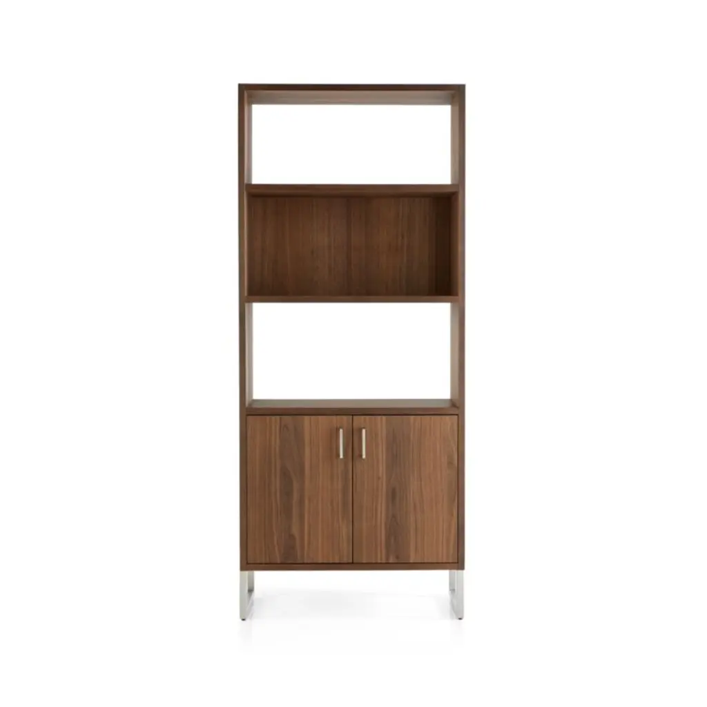 Our Clybourn bookcase's walnut veneer frame floats on brushed stainless steel sled legs for a striking, architectural look that provides plenty of storage. Our exclusive mid-century modern bookshelf offers space for books, decorative accessories and more on its four fixed shelvesone with a closed back, two with open backs and one behind closed doors. Designed by Blake Tovin of Tovin Design, this sophisticated office essential showcases the natural beauty of walnut with a dark satin wax finish that emphasizes the wood's lush grain. Pair the Clybourn Walnut Storage Bookcase with the other walnut pieces in our Clybourn furniture collection.
