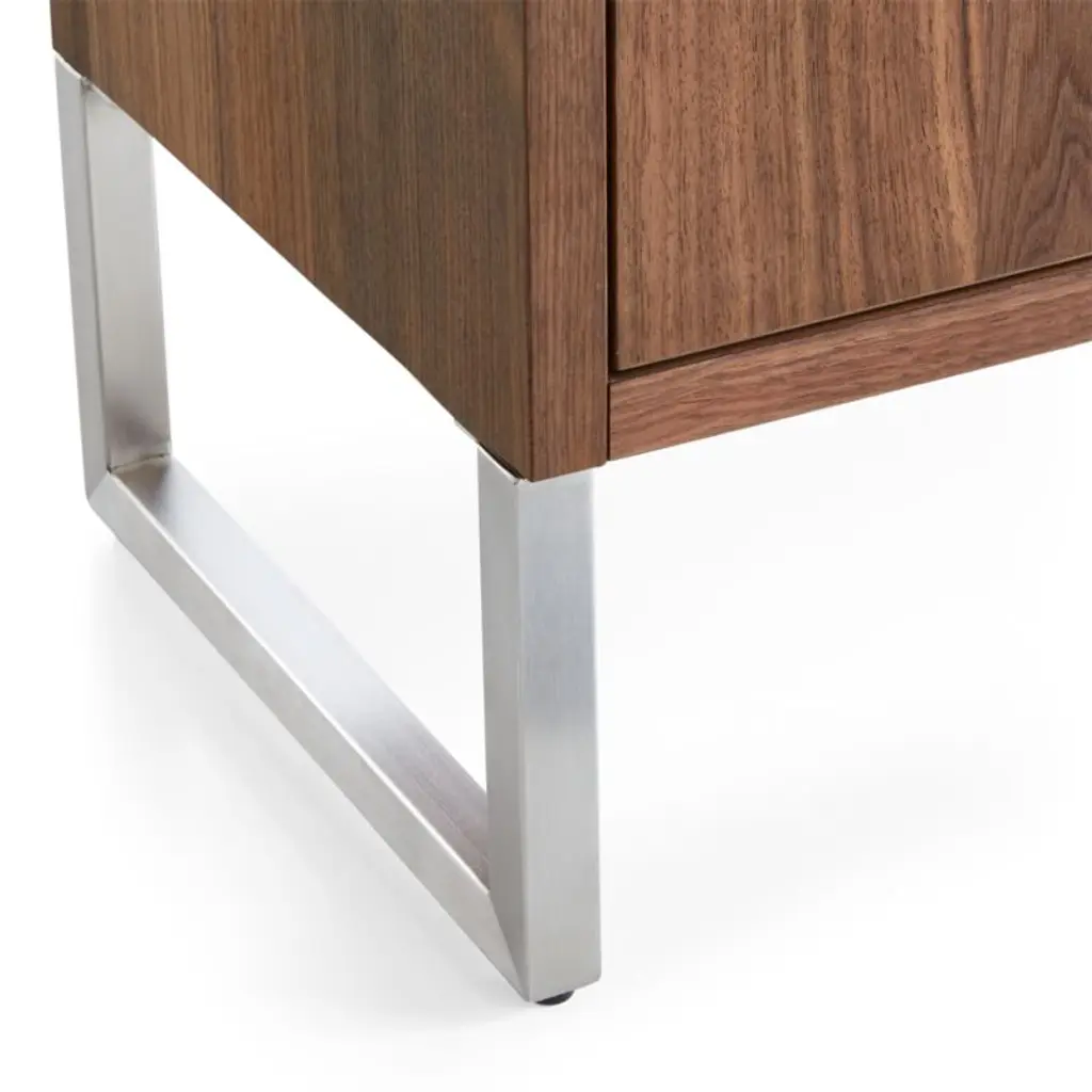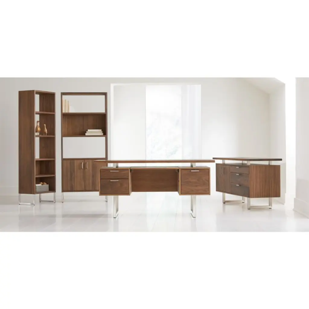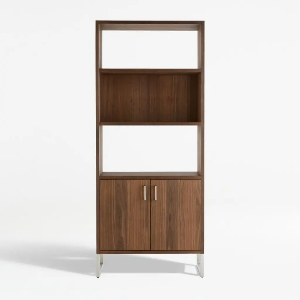 Our Clybourn bookcase's walnut veneer frame floats on brushed stainless steel sled legs for a striking, architectural look that provides plenty of storage. Our exclusive mid-century modern bookshelf offers space for books, decorative accessories and more on its four fixed shelvesone with a closed back, two with open backs and one behind closed doors. Designed by Blake Tovin of Tovin Design, this sophisticated office essential showcases the natural beauty of walnut with a dark satin wax finish that emphasizes the wood's lush grain. Pair the Clybourn Walnut Storage Bookcase with the other walnut pieces in our Clybourn furniture collection.