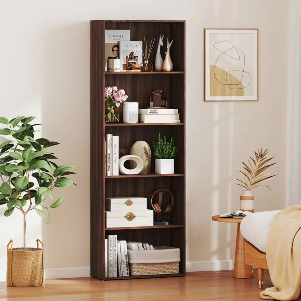Add a touch of modern flair to your organization with this bookcase. This 5-tier bookshelf boosts storage and display options, perfect for showcasing your favorite books, ornaments, or storage boxes. Constructed with thickened panels, each shelf boasts a high weight capacity for supporting items while maintaining stability. Utilize the included anti-toppling kit when placing the bookcase against the wall to prevent any accidents. Ideal for optimizing storage options in your living room, study, or office, this freestanding display shelf combines functionality with elegance.Features5-tier bookshelf with open design for easy access Enlarge storage and display space for books, plants and photos Anti-toppling device to improve stability and safety Thickened boards with premium edge-sealing for reliable usage Equipped with screw hole stickers for a clean look Anti-slip foot pads protect the floor from scratches Contemporary style complements various home styles Smooth surface saves much effort in daily upkeep Suitable for living room, study, kitchen and office, etc Considerate details ensure better user experience Assembly neededColor: Black/White/Walnut Material: Engineered Wood, MDF Overall Dimensions: 23" x 9.5" x 67.5"(L x W x H) Dimensions of Each Cube: 22" x 9" x 13"(L x W x H) Weight Capacity of Each Shelf: 45 lbs Net Weight: 34.5 lbs Package Includes: 1 x 5-Tier Bookcase 1 x User Guide