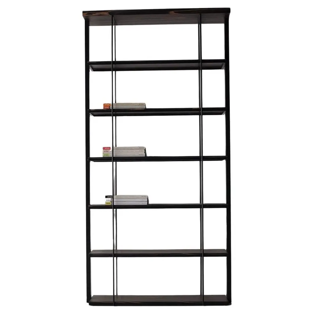 Crazy is a bookshelf in solid wood with a fine iron frame, “irondust” anthracite grey lacquered, and shelving with natural edges that intersect and protrude from the structure.STANDARD VERSION: IRON STRUCTURE LACQUERED IRONDUST COLOUR (B2), WHICH CAN BE DISASSEMBLEDATTENTION: SHELVES AND FRAME MUST BE FIXED TO THE WALL (L-SHAPED METAL PLATES AT SIGHT).FOR BOOKCASES LONGER THAN 200 CM, EACH SINGLE SHELF MUST BE COMPULSORY FIXED TO THE WALL WITH THE RELEVANT FIXING TOOLAVAILABLE FINISHES:A1: walnut without knots, walnut with knotsA2: oak without knots, oak with knots, cherryA4: oak without knots pigmented: milk white, total blackoak with knots pigmented: milk white, total blackA6: briccolaAVAILABLE FINISHES - IRON STRUCTUREB2: lacquered iron: irondust, RAL (selected colours only)B3: matt brushed lacquered iron: antique bronze, steel, titanium