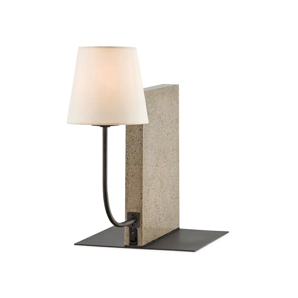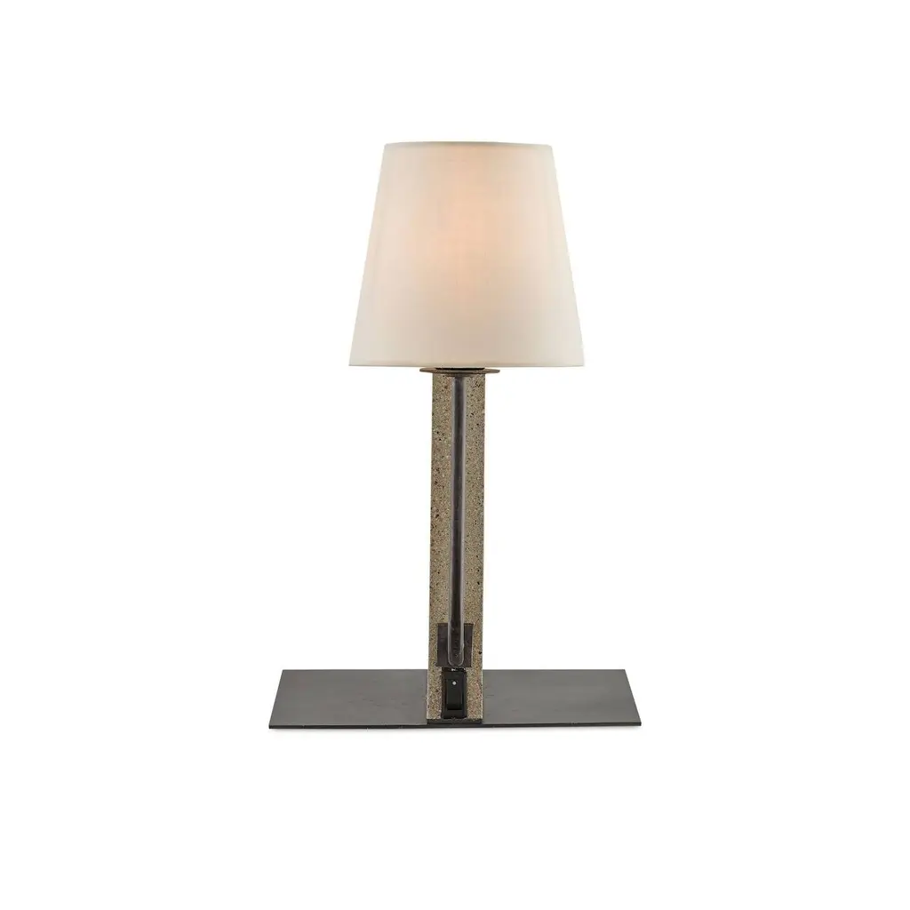 Polished concrete serves as the anchor for the Oldknow Bookcase Lamp. The wrought iron base and stem in an aged steel finish tease out the dark stippling in the concrete. The concrete lamp is topped with an off-white linen shade.