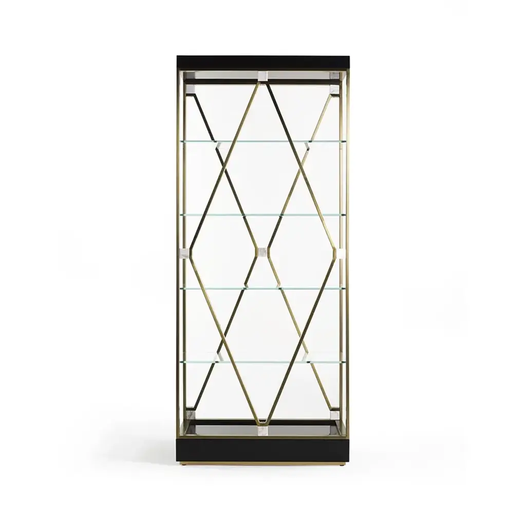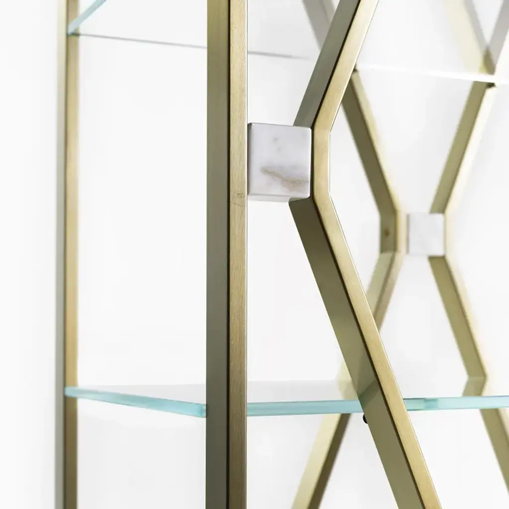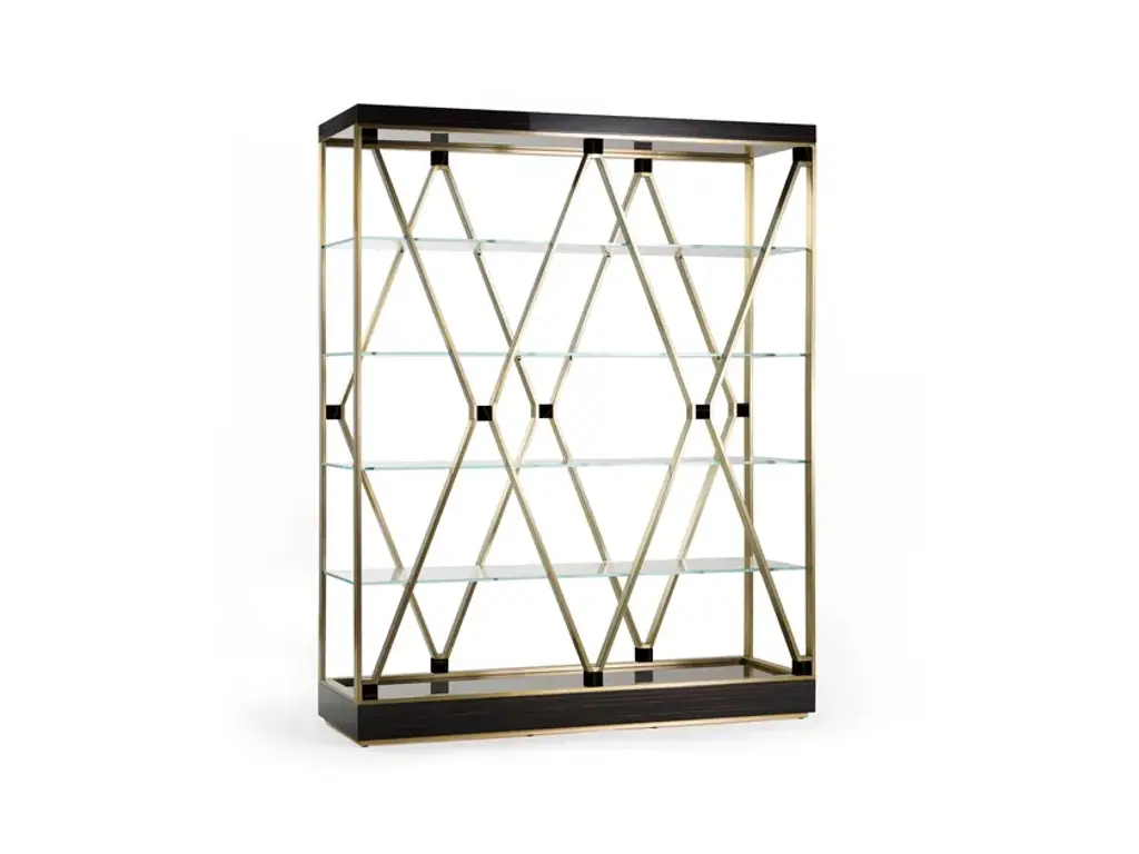 Bookcase in metal with wooden base and top, laquered or veneered. Bearing structure with rhombus shape and connection elements in marble. Available also in other combinations of materials.