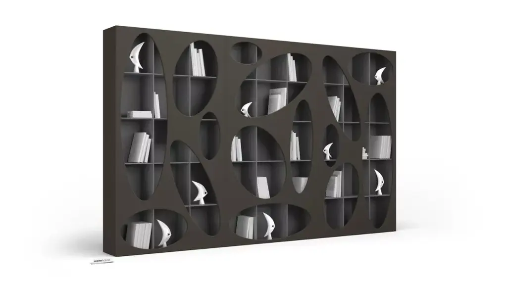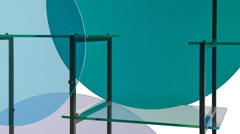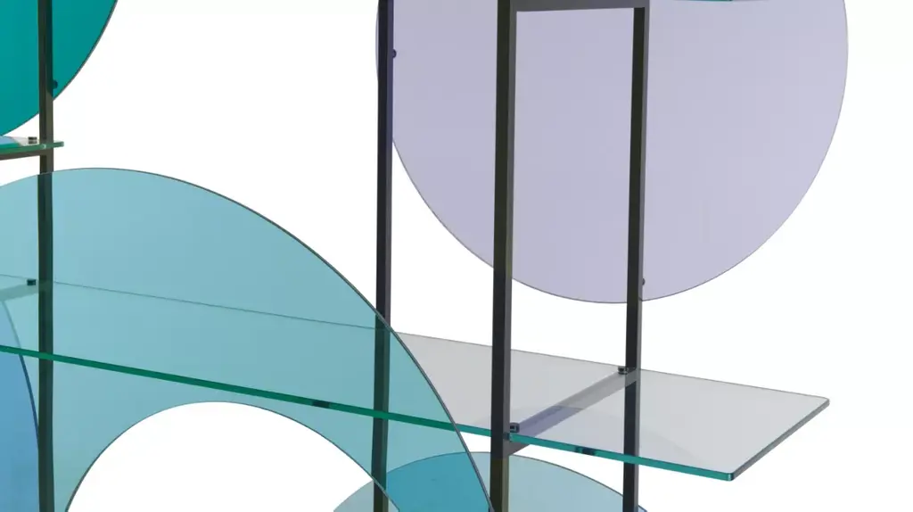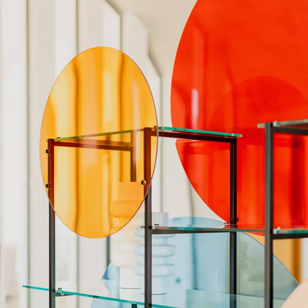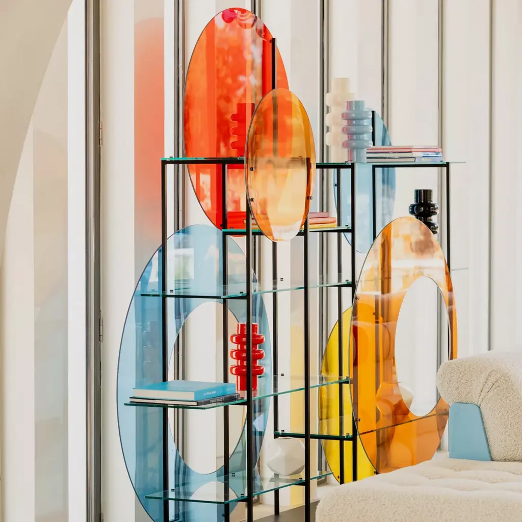 The Disk bookcase plays with light, color, and space. Designer Sacha Lakic envisioned colored glass discs like a modern stained glass window, framed by a slim black metal structure. Transparent glass shelves add a sense of lightness while providing space for books, treasured objects, or works of art. Both poetic and practical, Disk comes in two versions: multicolored or in shades of blue.