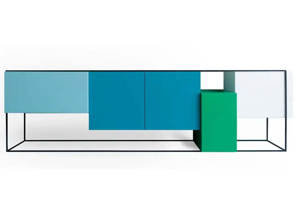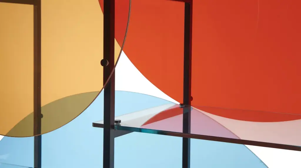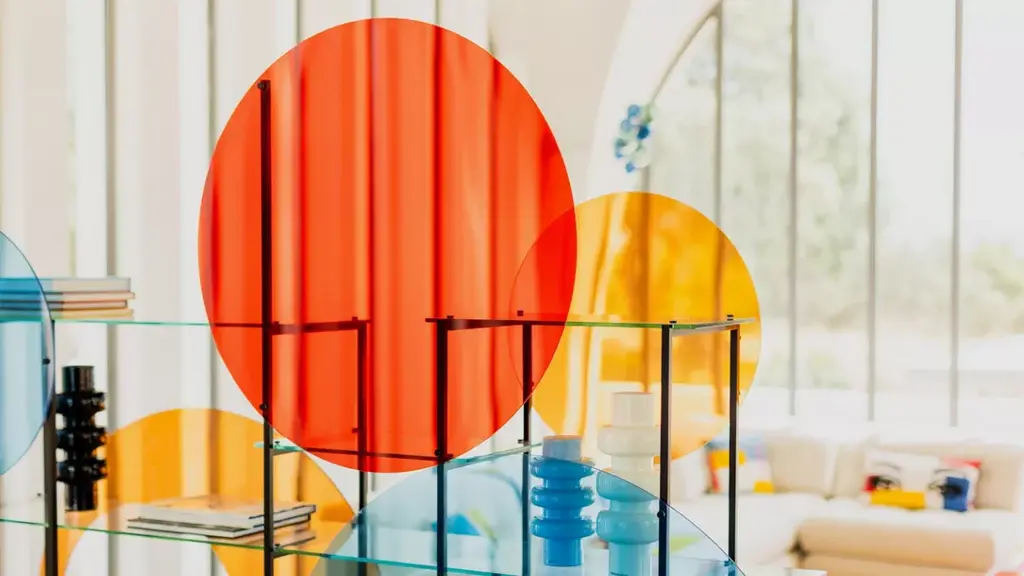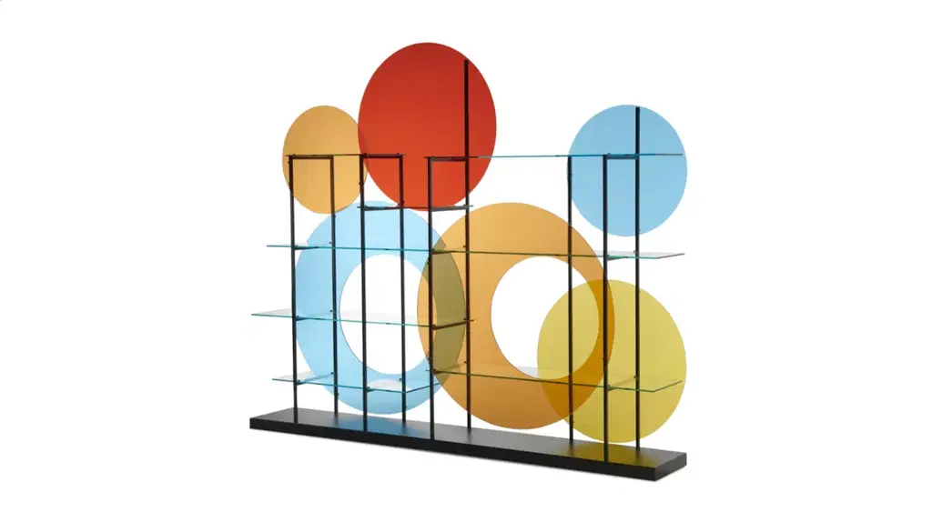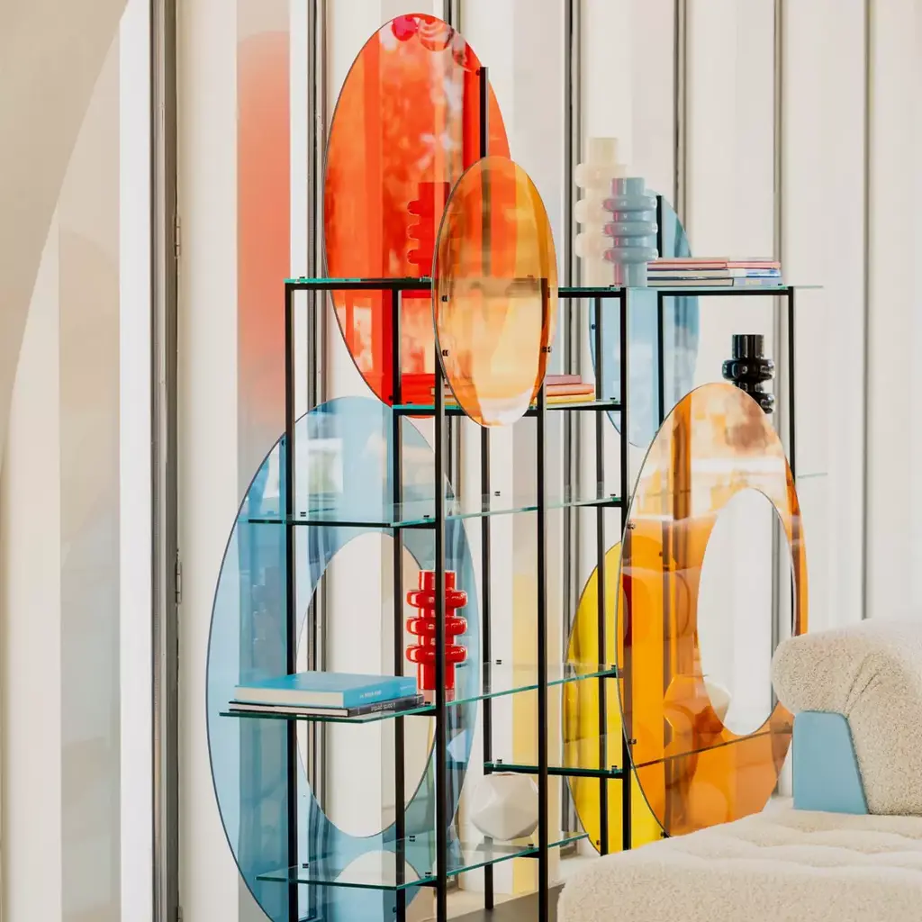 The Disk bookcase plays with light, color, and space. Designer Sacha Lakic envisioned colored glass discs like a modern stained glass window, framed by a slim black metal structure. Transparent glass shelves add a sense of lightness while providing space for books, treasured objects, or works of art. Both poetic and practical, Disk comes in two versions: multicolored or in shades of blue.