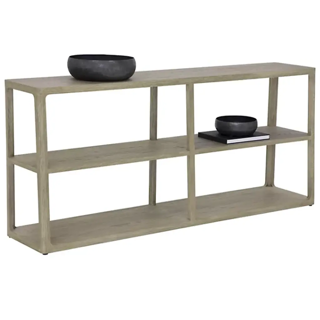 Introduce a touch of minimalist style into any space with the Doncaster Low Bookcase from Sunpan. It's thoughtfully crafted using a solid oak wood frame with a sleek smoke-grey oak veneer. You'll find this bookcase in regular small and large versions to suit your needs. Given the organic nature of wood, these pieces exhibit natural variations in texture, which may include fine indentations and cracks. Wood pieces also showcase a delightful disparity of color and grain, along with visible knots and burls, contributing to the individual character of each piece.