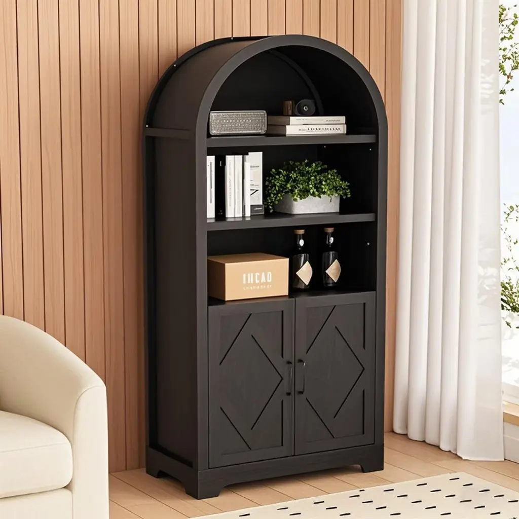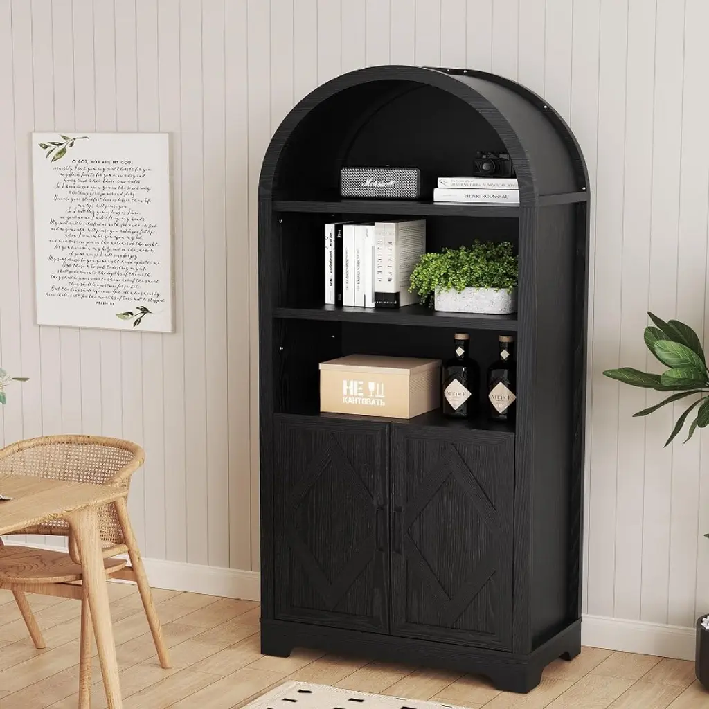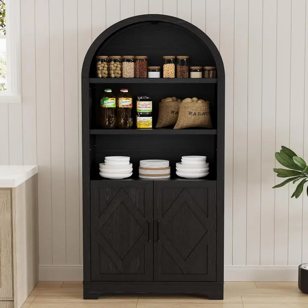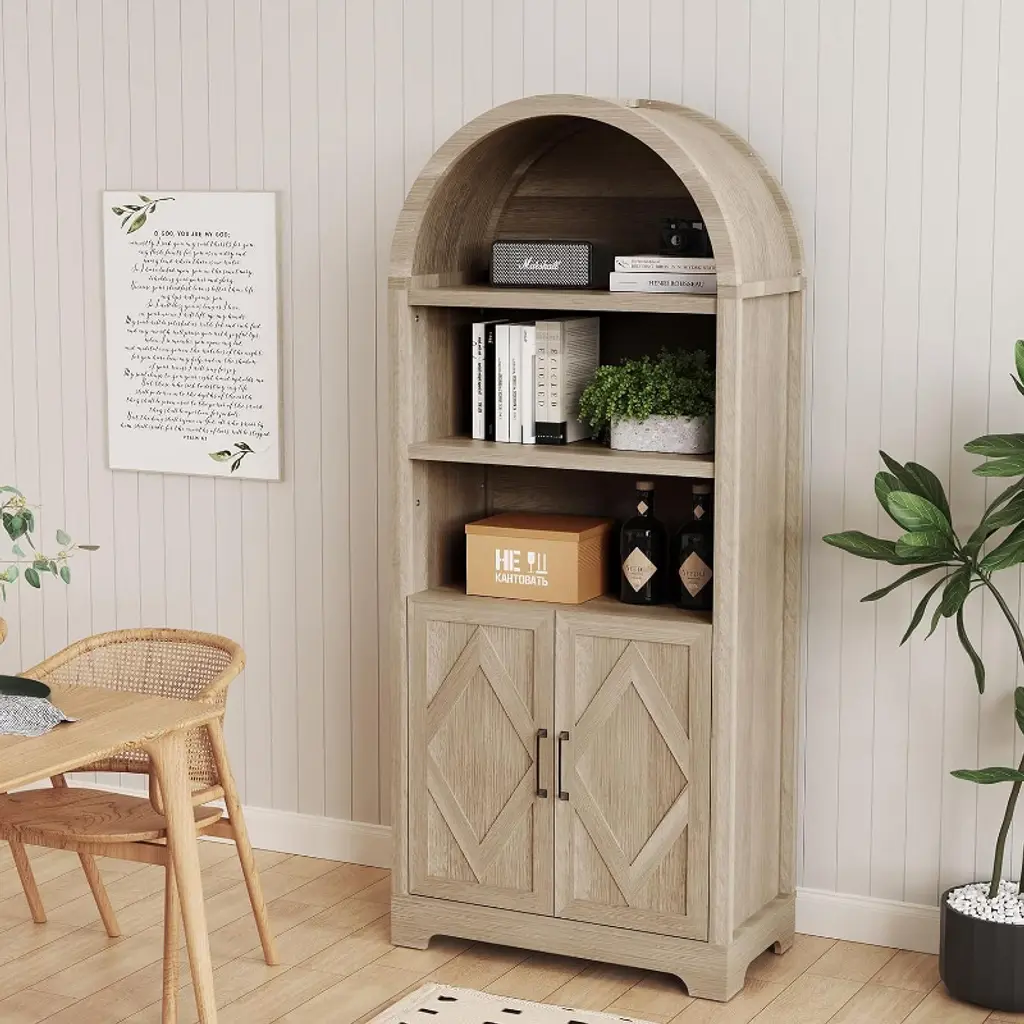 The Modern arched bookcase with doors features a reinforced base for extra sturdiness, plus anti-tip backing with wall-mounting options¡ªmaking it ideal for homes with kids or pets! In the living room, it serves as a stylish display cabinet or curio cabinet or tall storage cabinet to showcase family photos, favorite books, china and collectibles.This tall cabinet also is perfect for the kitchen¡ªstore cookware, food, dinnerware,and more with its easy-access open shelving! Crafted with premium wood, this arched kitchen pantry cabinet boasts a unique grain pattern on every piece. Wood bookshelf's arched top design adds a stylish, warm vibe to any room! The arch hutch includes a step-by-step installation video & manual, with precise pre-drilled holes for mounting¡ªmaking setup simple even for beginners! Every arched tall bookcase with doors is rigorously tested for durability and safety, backed by professional customer support¡ªso you can shop with confidence!
