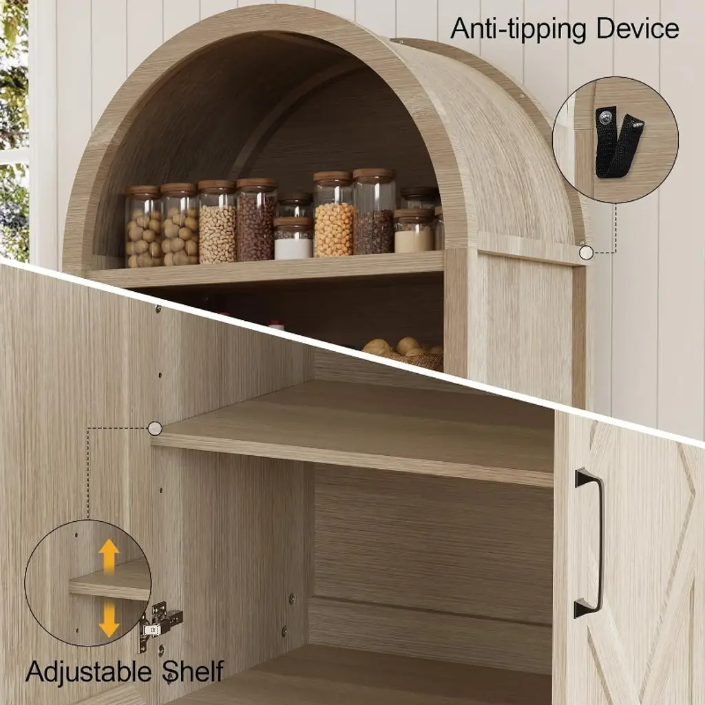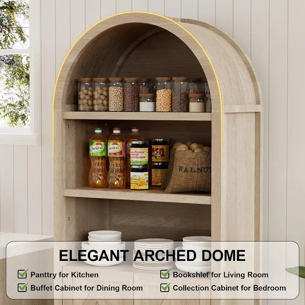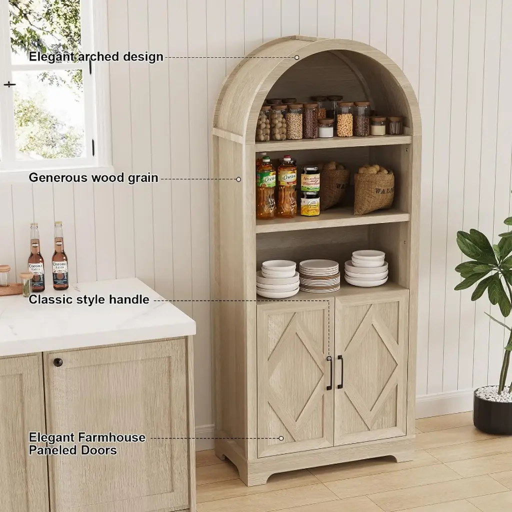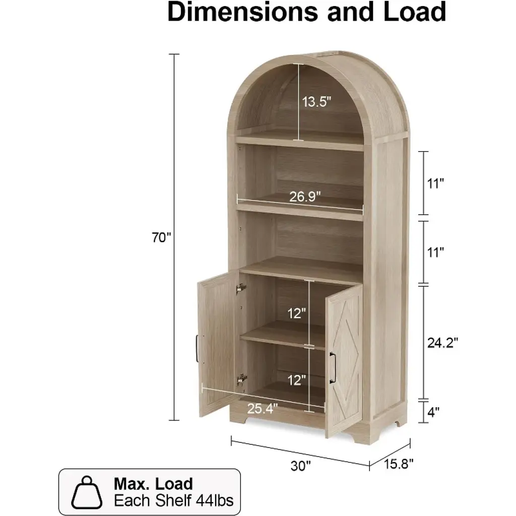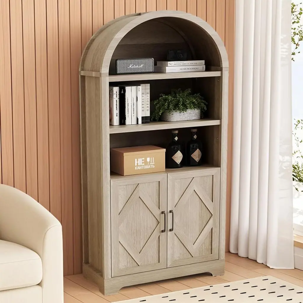 The Modern arched bookcase with doors features a reinforced base for extra sturdiness, plus anti-tip backing with wall-mounting options¡ªmaking it ideal for homes with kids or pets! In the living room, it serves as a stylish display cabinet or curio cabinet or tall storage cabinet to showcase family photos, favorite books, china and collectibles.This tall cabinet also is perfect for the kitchen¡ªstore cookware, food, dinnerware,and more with its easy-access open shelving! Crafted with premium wood, this arched kitchen pantry cabinet boasts a unique grain pattern on every piece. Wood bookshelf's arched top design adds a stylish, warm vibe to any room! The arch hutch includes a step-by-step installation video & manual, with precise pre-drilled holes for mounting¡ªmaking setup simple even for beginners! Every arched tall bookcase with doors is rigorously tested for durability and safety, backed by professional customer support¡ªso you can shop with confidence!