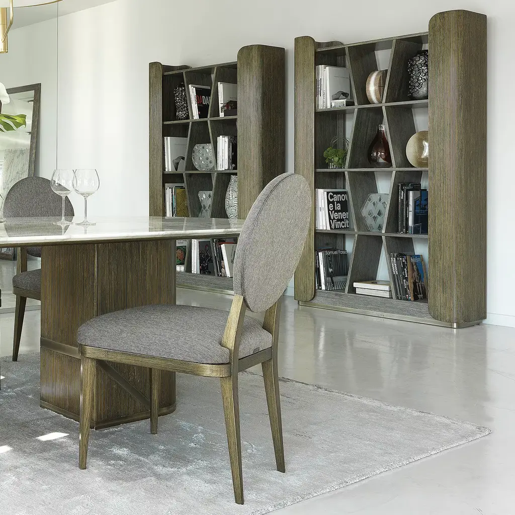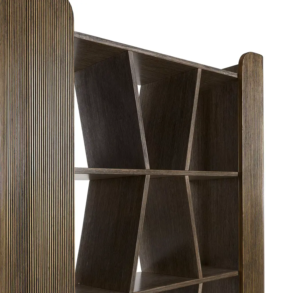 Bold and sophisticated this bookcase will be a striking addition to a contemporary home. Either against a wall, or used as superb room divider, this piece of functional decor will make a statement, thanks to its noble materials, unique designer, and impeccable craftsmanship. The plinth base in bronzed brass supports a thick bottom and sides in wood with vertical ridges that give the piece a bold character. The horizontal wooden shelves are connected with slightly diagonal elements that give the piece dynamic tension.