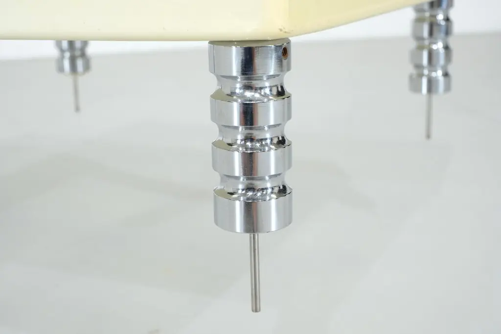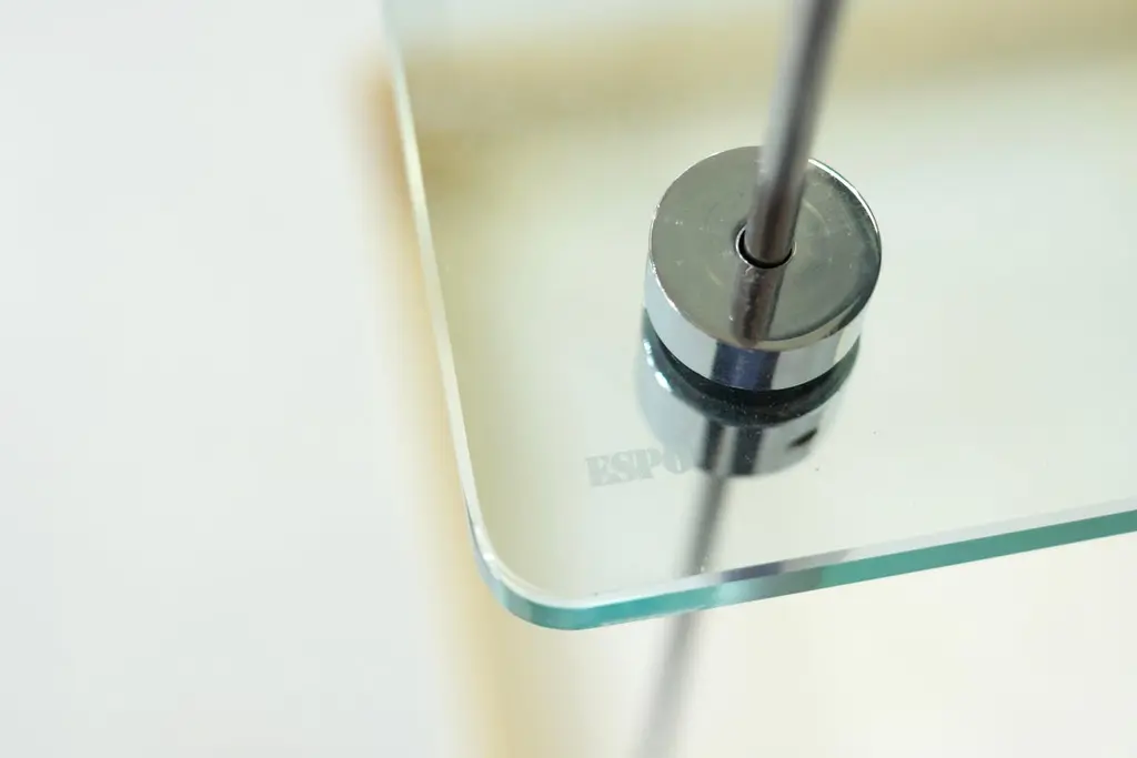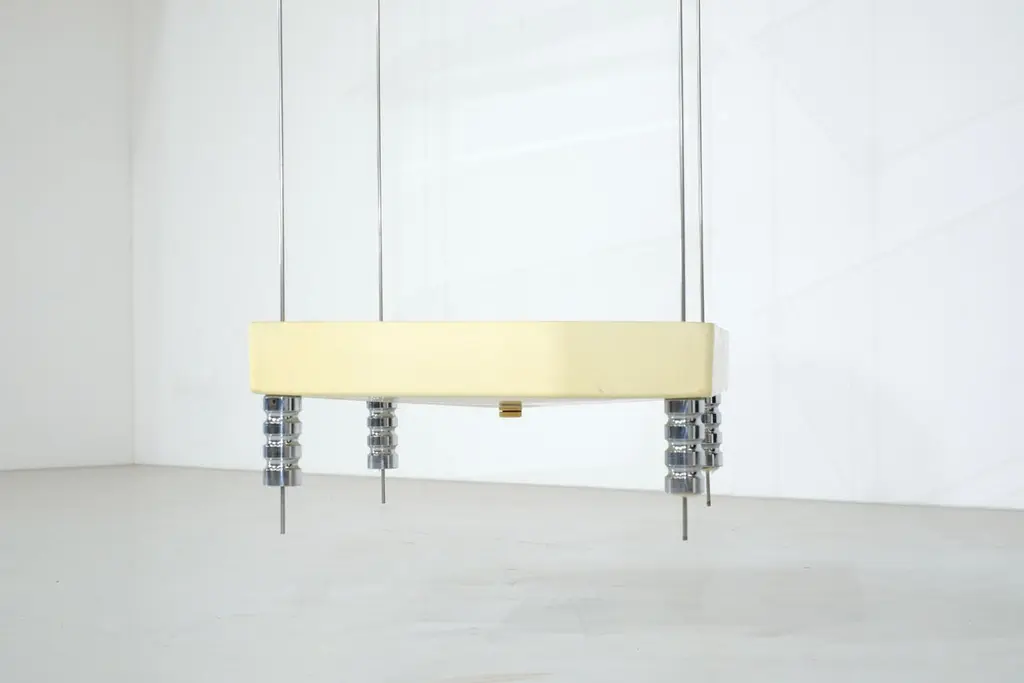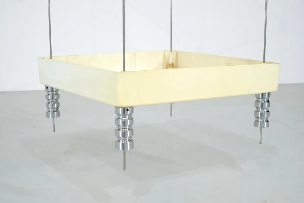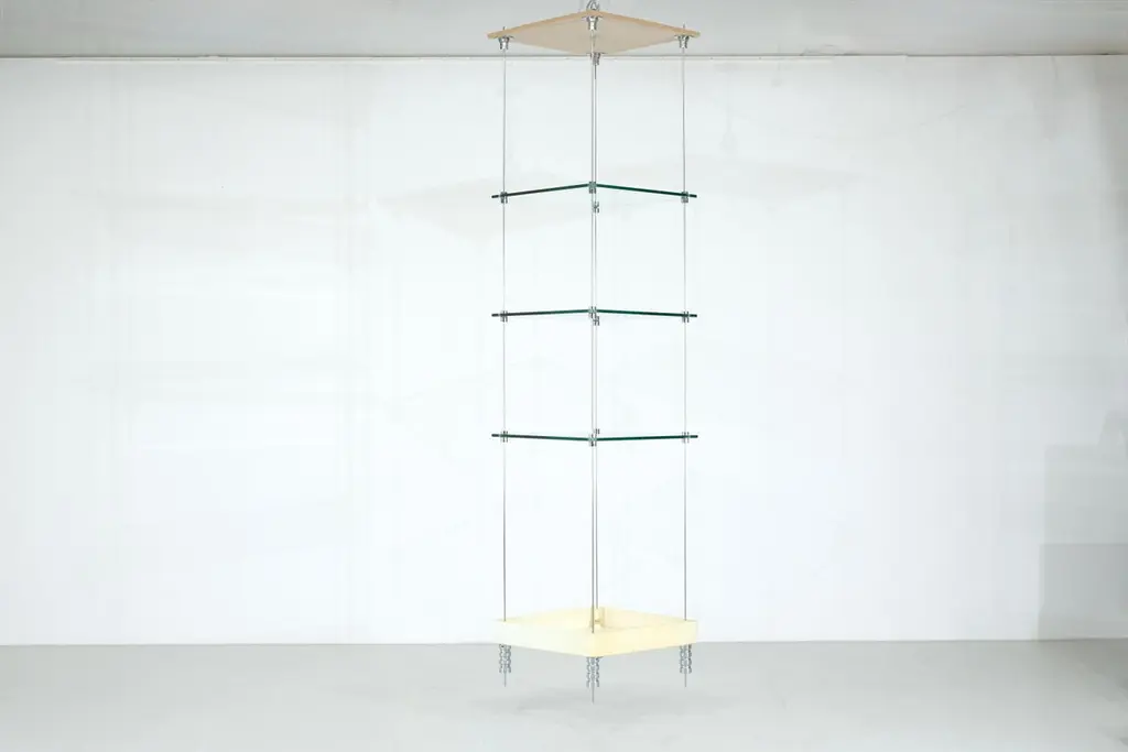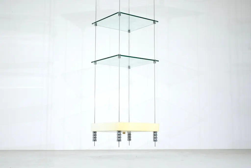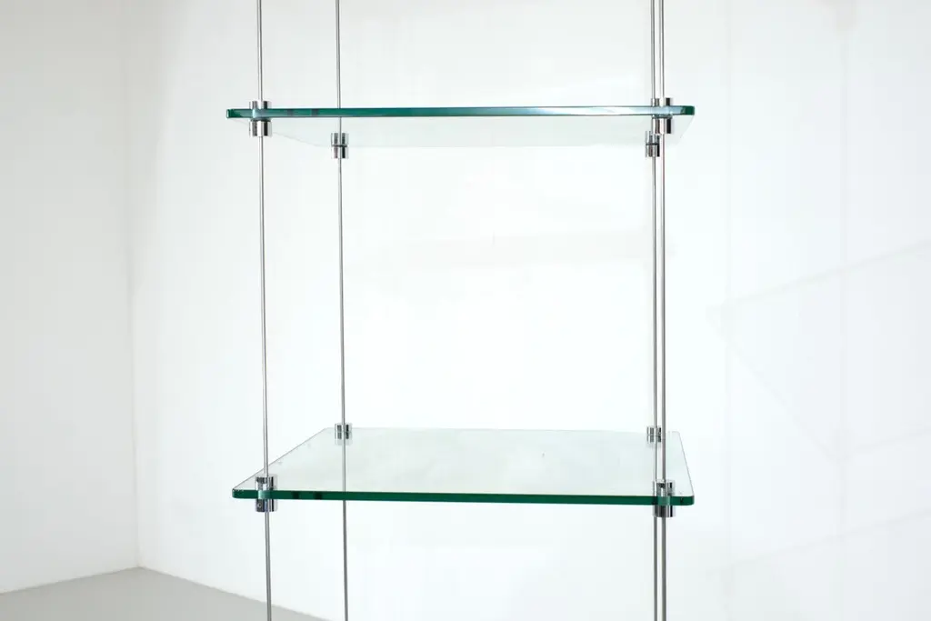 Magnificent Esposi Ramloc hanging bookcase designed by Marino Collecchia for Espo in the 1970s.This very rare and highly original model consists of four flexible metal rods attached to the ceiling.Three glass shelves and a planter (which can be used for other purposes) rest on these four rods.Each shelf can be arranged as you wish. You can create any composition you like. Note that the planter must be installed last, as it rests on four "posts."This bookcase is signed "Espo" on one of the glass shelves (as you can see in the photos).Excellent vintage condition, no damages. SIgns of use due to the life time of the bookcase