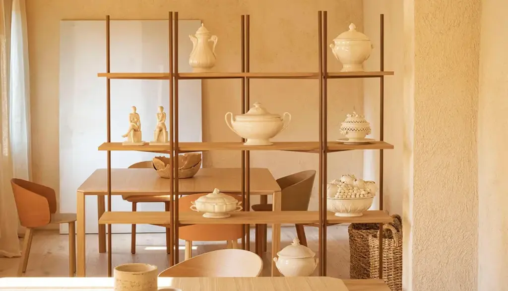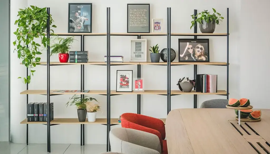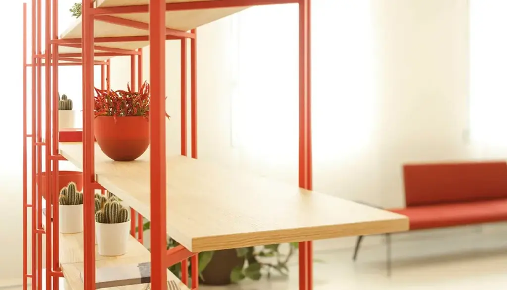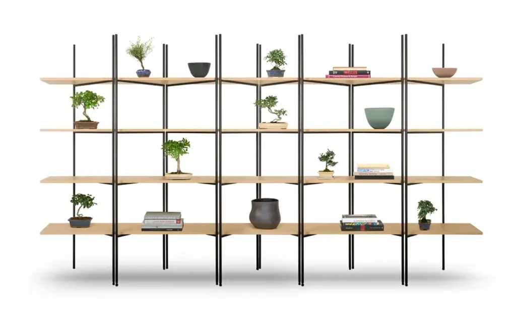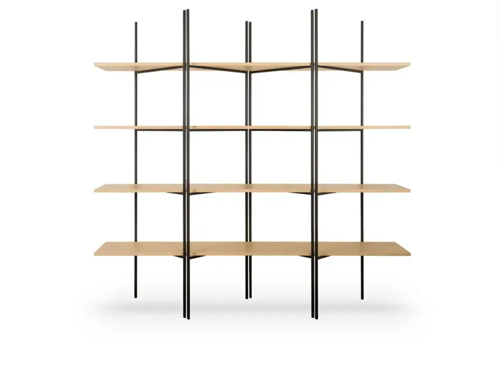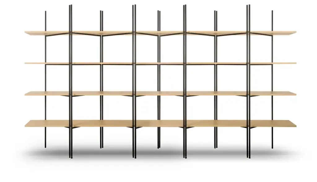 This is a very flexible shelving system that can suit any type of space.With a simple shifting in the assembling of the shelves, a variety of possible configurations is available, different in terms of shape and dimensions: linear, on a corner or cross-shaped. The structure is made up of glossy steel, available in many different colours and can be combined with veneered chipboard shelves, top thickness 20mm.