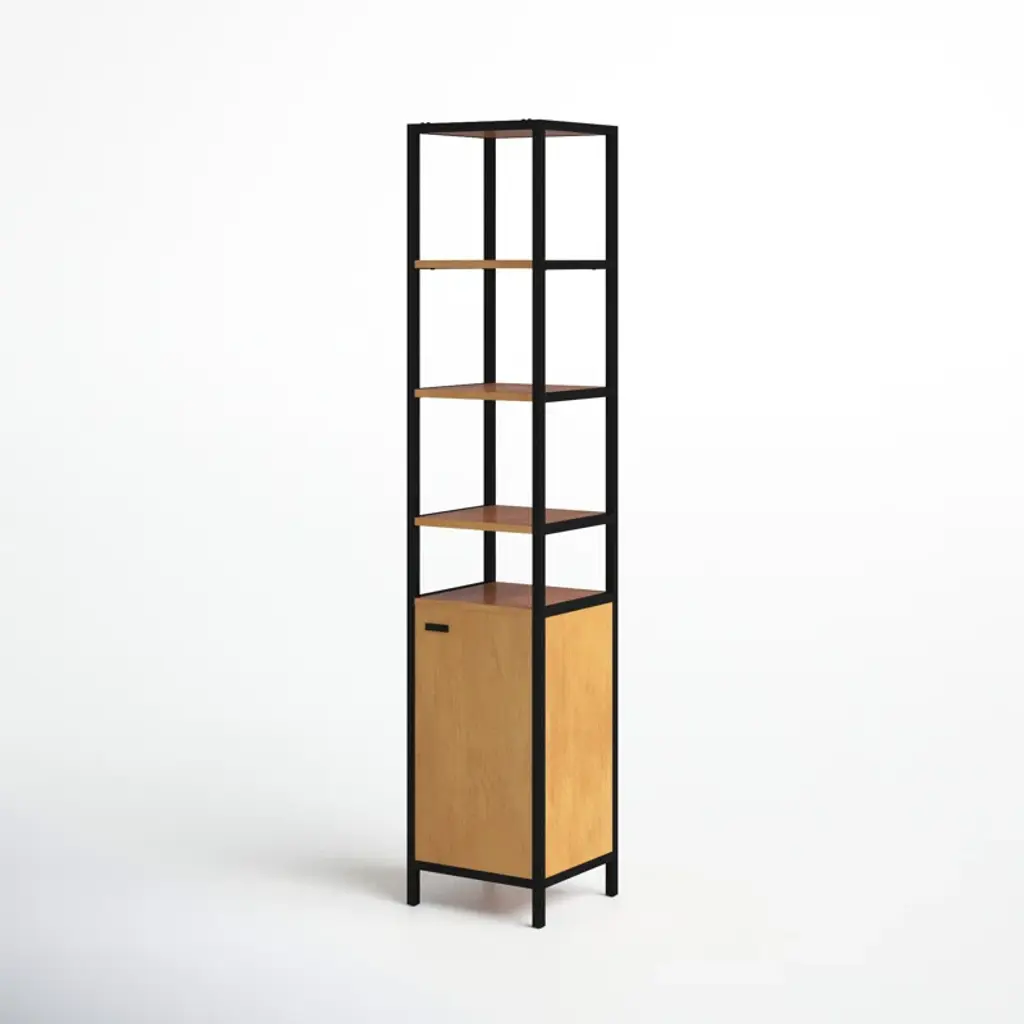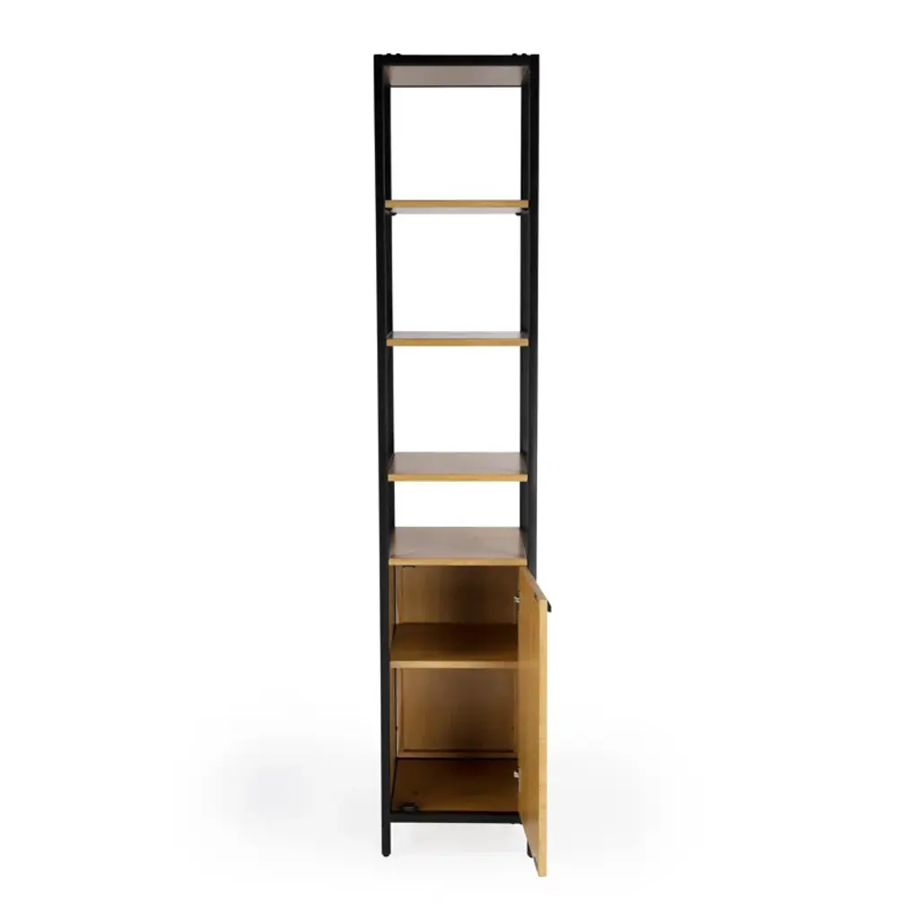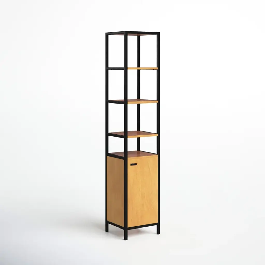 This attractive narrow bookcase was designed for compact spaces. It boasts a minimalistic design with modern and industrial influences, and it will display books and cherished artifacts. It is crafted from mango wood solids, engineered wood, and Gmelina veneer, and is supported within a sleek durable black iron frame. It features ample storage for all your stuff - for display on the four open shelves on top or tucked away out of view in the cabinet below which includes an adjustable shelf. This piece is a great addition to an office, living room, bedroom, or family room.