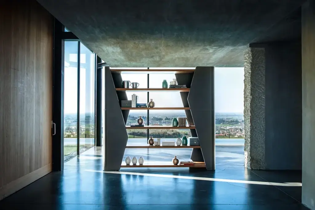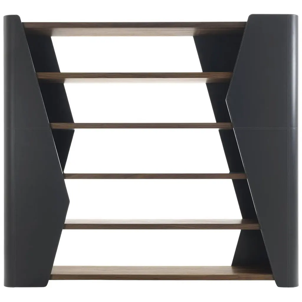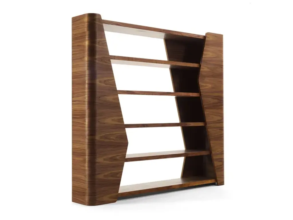FIN ESSE is a shelf characterized by asymmetrical supports in curved and shaped multilayer wood panels, that can either be veneered or covered with leather, in which are fitted six 5 cm thick shelves in veneered multilayer.AVAILABLE FINISHES:A1: walnut without knotsA2: oak without knotsD3: leather: suede, crystalD4: leather: utah, nubuckD5: olimpia leather