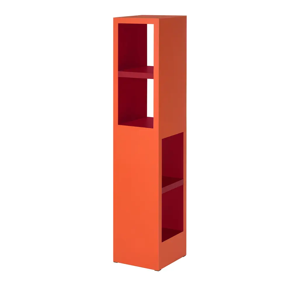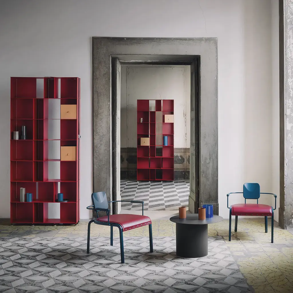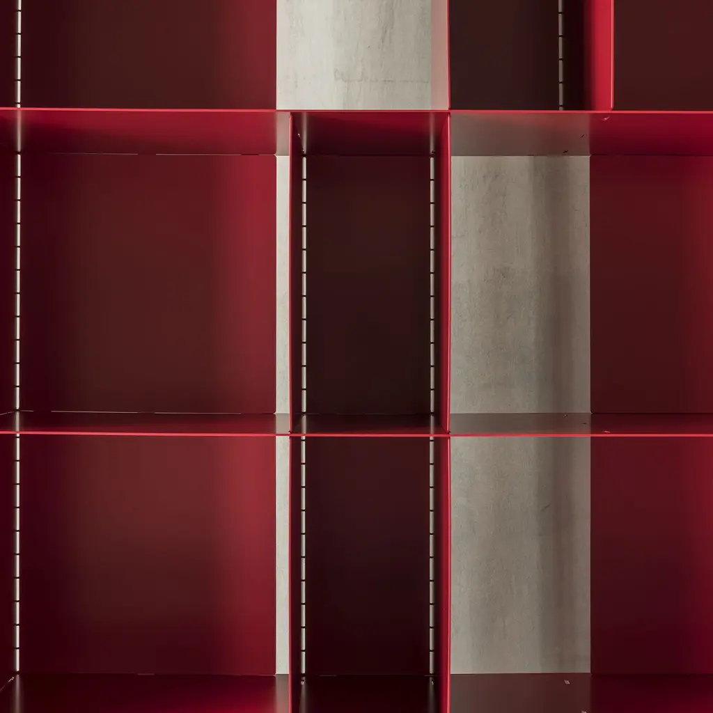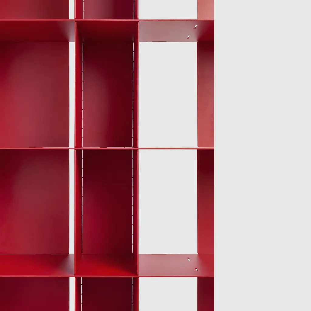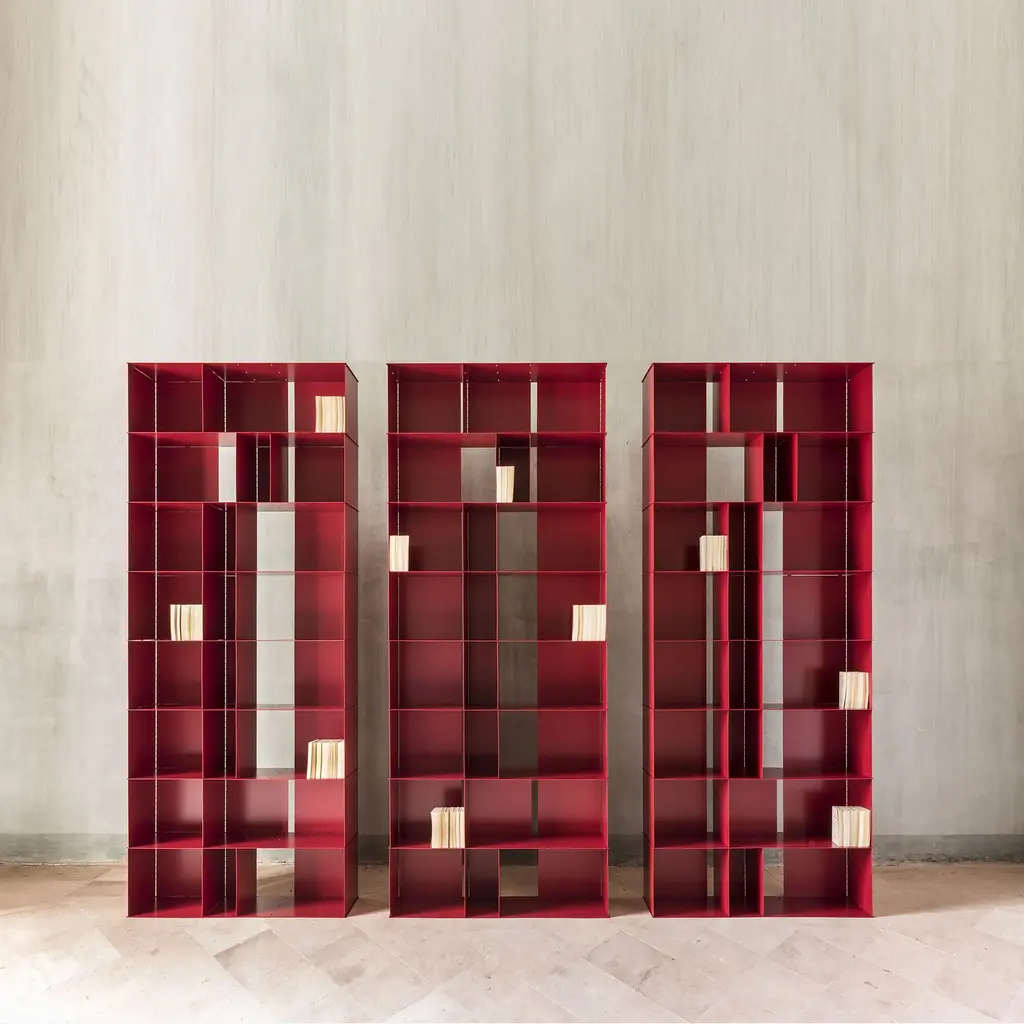 A unique piece of modern sophistication, this bookcase will add a colorful and elegant accent to any contemporary indoor or outdoor area. Resting on turned brass feet and equipped with a lateral nylon belt fixing the composition, this bookcase is composed of modular pieces of red-lacquered laser-cut steel, that can be fit together (hence the name) to form infinite compositions. This piece is customizable in colors, measures, and in the addition of elements, please ask the Concierge for further details and options.