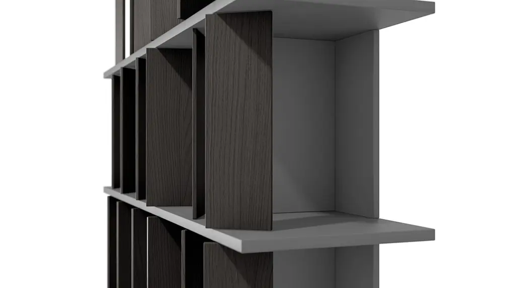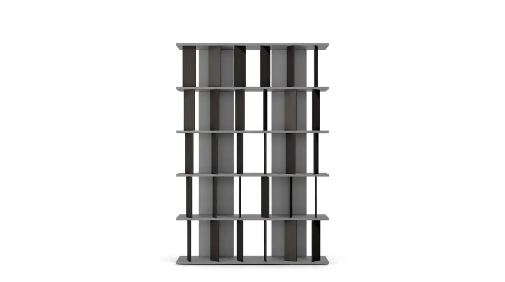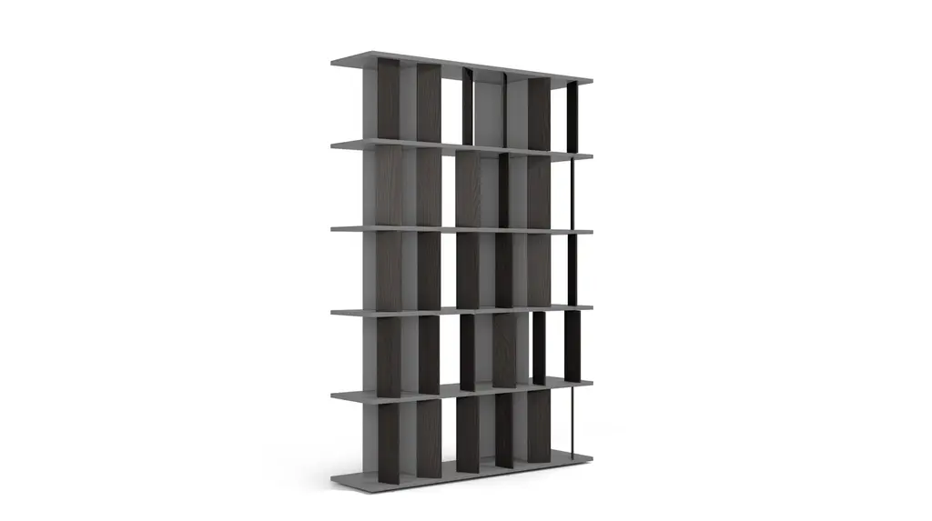 This bookcase features carefully aligned rotating vertical vanes. Each vane can be opened or closed to create symmetrical or more free compositions...