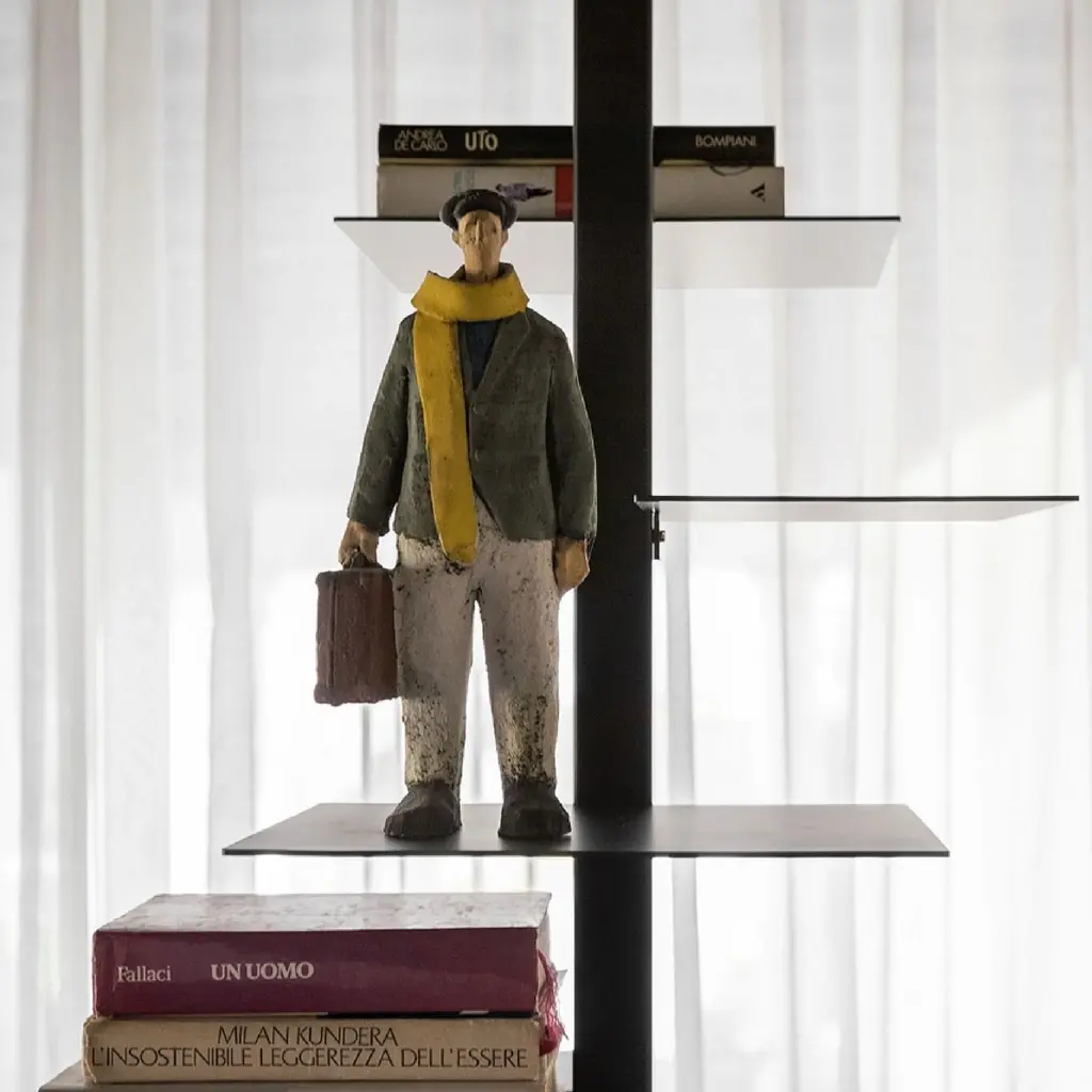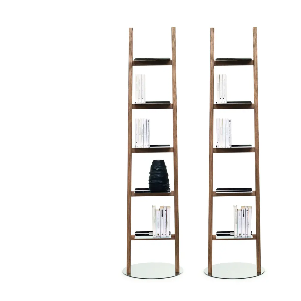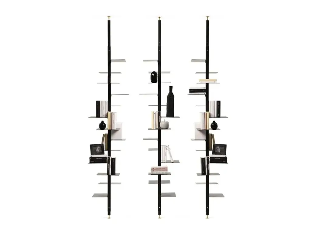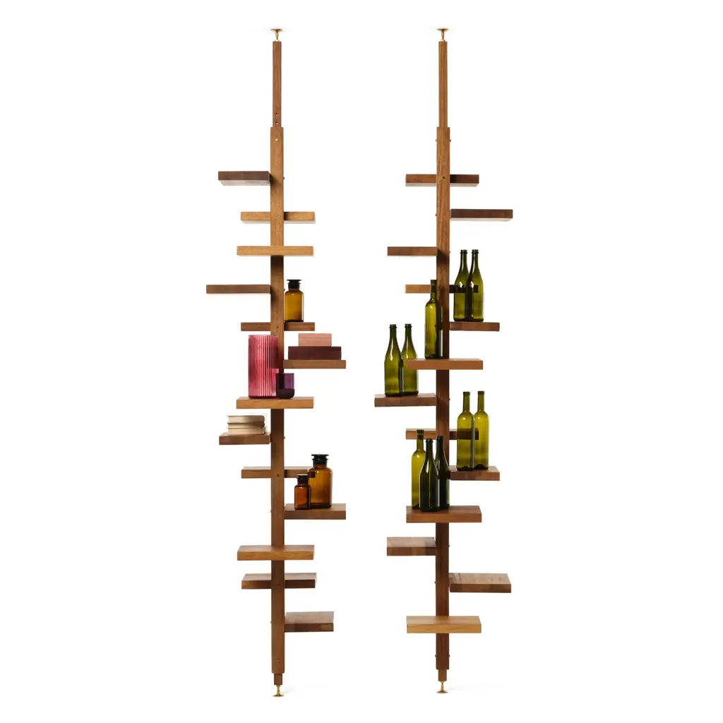 Elevate your space with Mogg Adelaide - a versatile floor-to-ceiling bookcase made of solid Iroko wood or matte black iron. With 13 shelves for ample storage, its rotating column adds a unique touch. Its elegant structure and asymmetrical shelves make it a functional work of art.