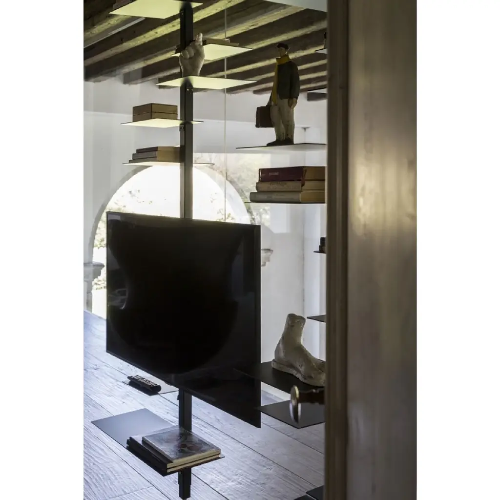 Elevate your space with Mogg Adelaide - a versatile floor-to-ceiling bookcase made of solid Iroko wood or matte black iron. With 13 shelves for ample storage, its rotating column adds a unique touch. Its elegant structure and asymmetrical shelves make it a functional work of art.