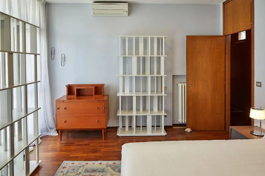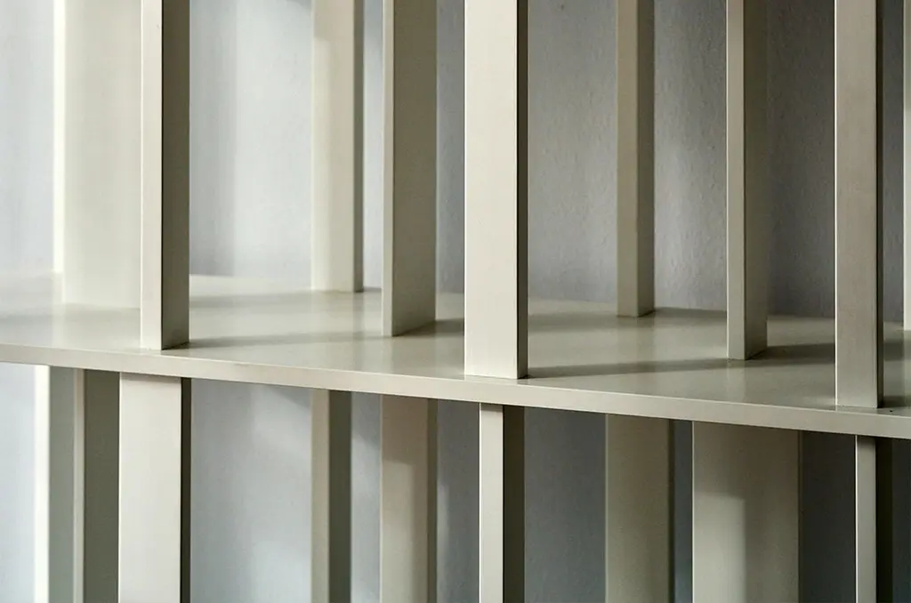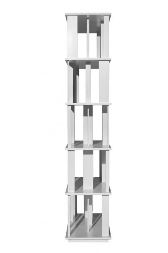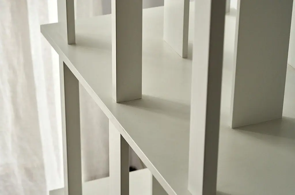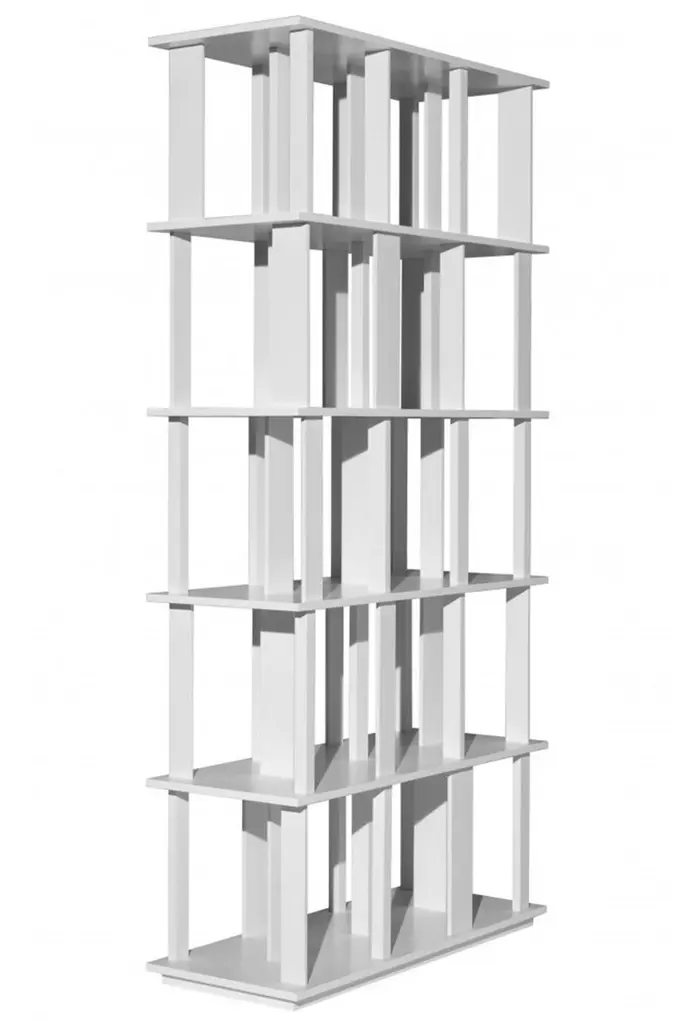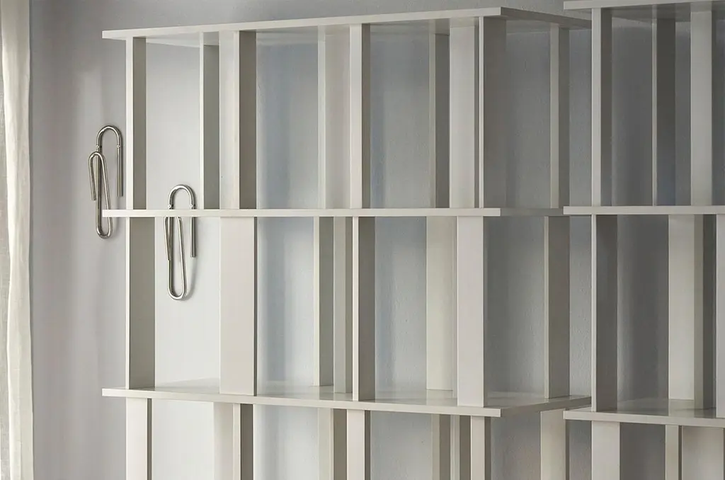 Bookcase designed by Nendo for Driade. The bookcase features shelves interspersed with rotated vertical elements, which serve as an aesthetic and functional element to support books. The bookcase has adjustable feet from below.The bookcase is discontinued. The bookcase is made entirely of solid wood lacquered in white color
