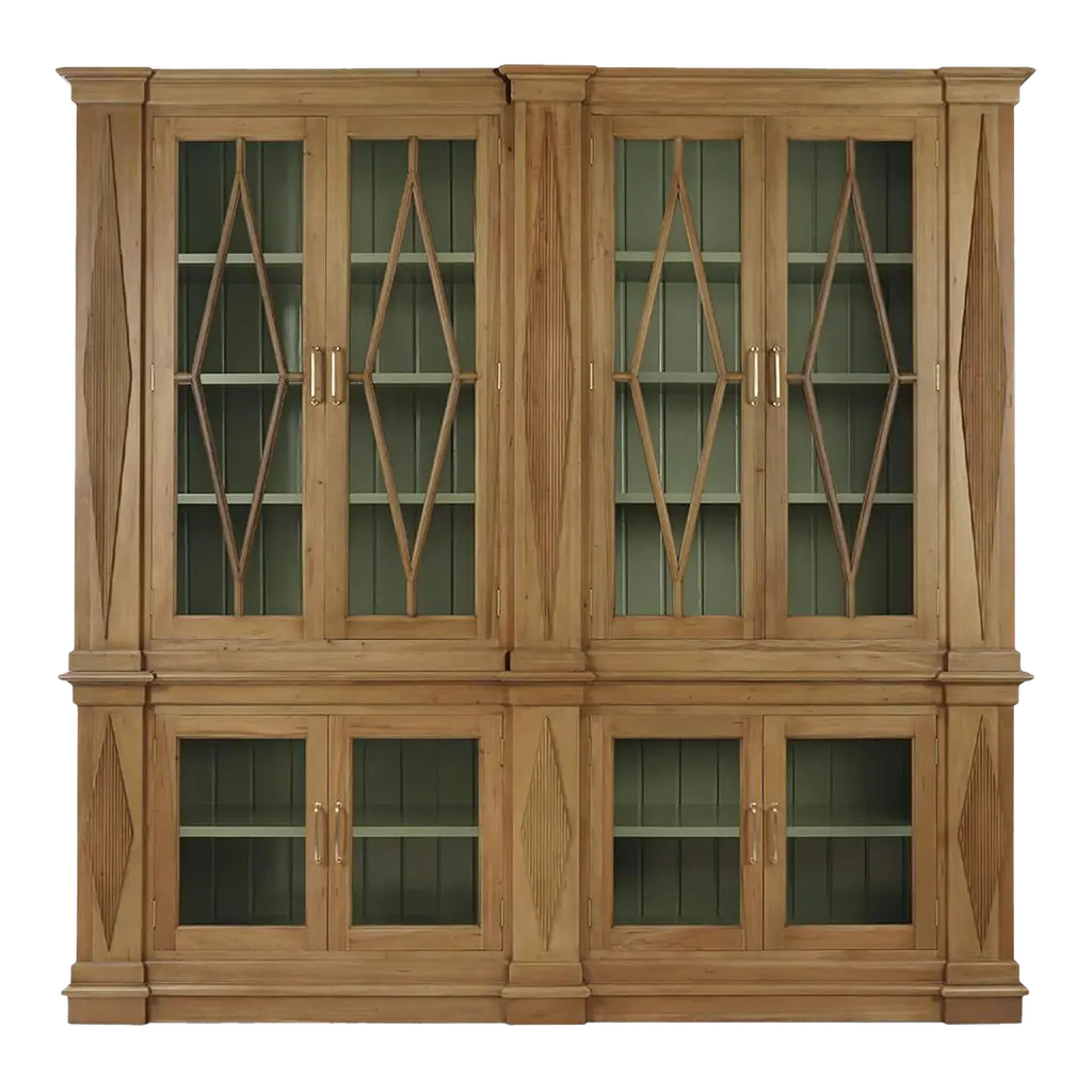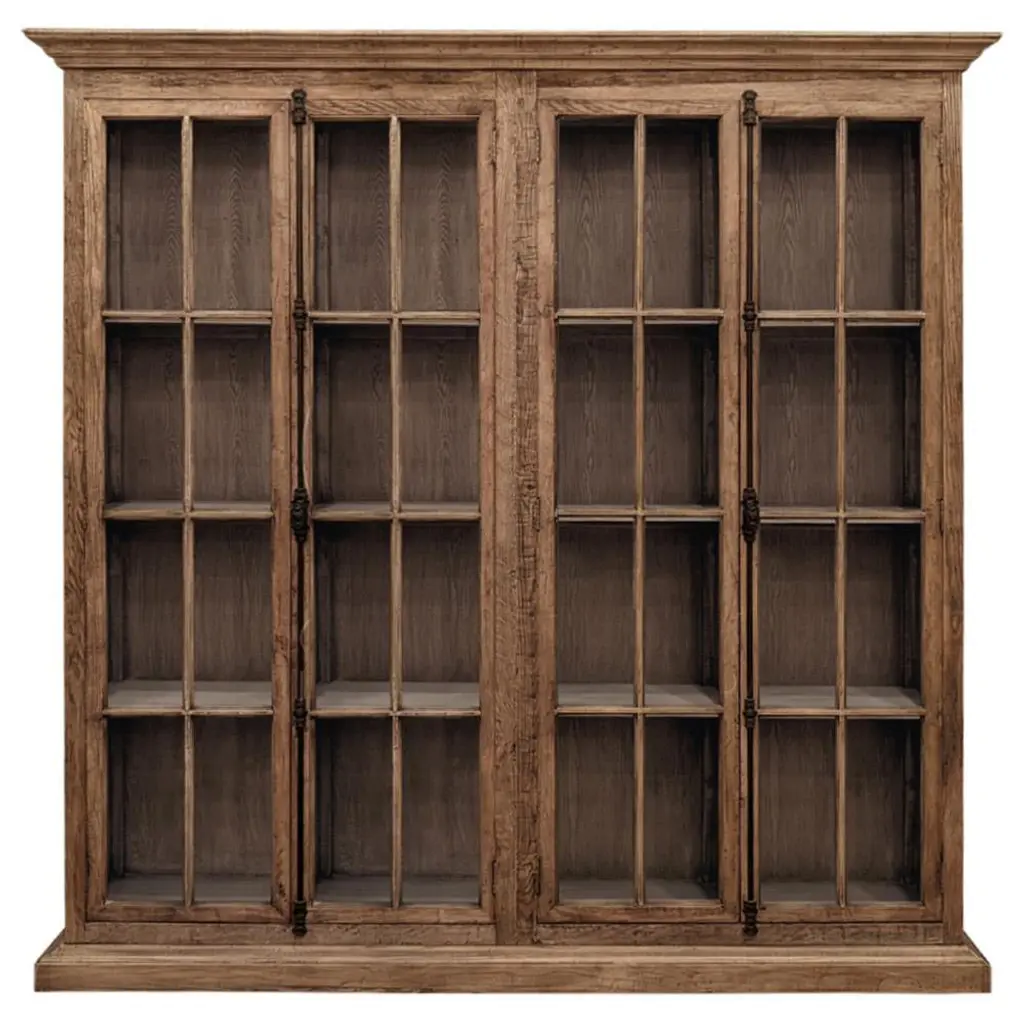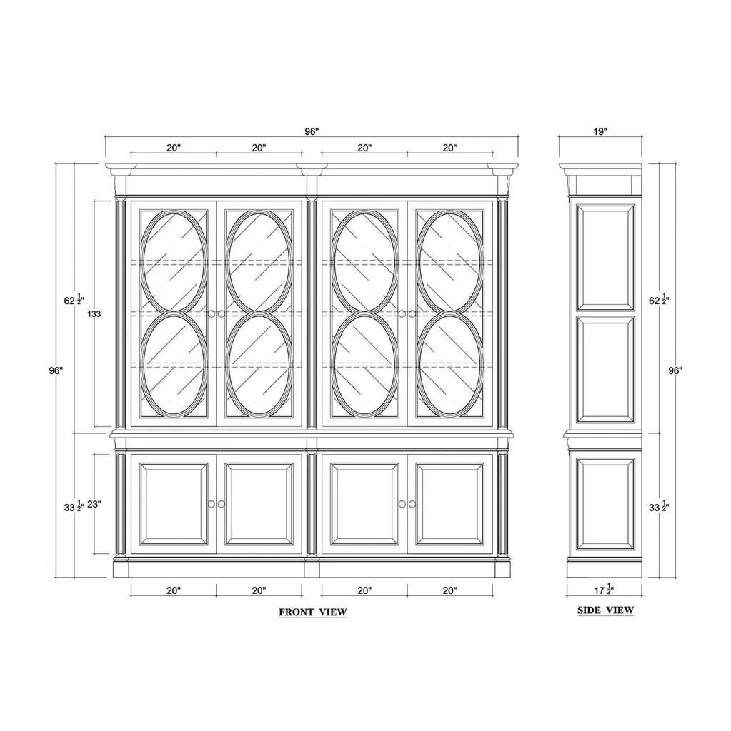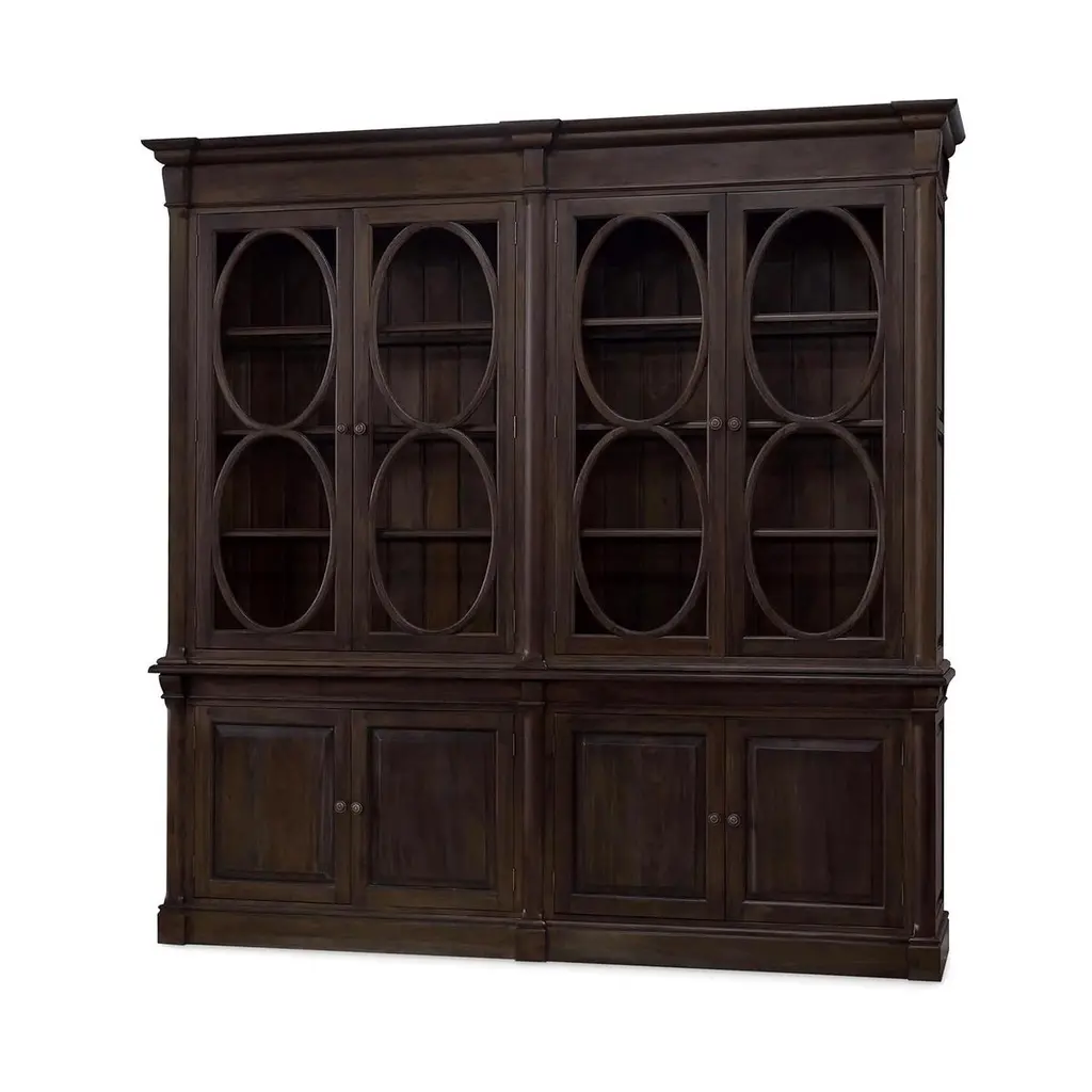 The cabinet has a Dark Walnut stain finish to the exterior. The interior, finished in the same dark walnut stain, offers a clean backdrop for books, china, or display objects.Glass doors with classic oval motifs lend architectural interest and soft sophistication, while the paneled doors below offer concealed storage. Crown molding and subtle columnar accents enhance its stately silhouette, making it ideal for living rooms, dining areas, or libraries with French country or European-influenced styling.Dimensions: 96" W x 19" D x 96" HCustom finish options are also available. Contact us to learn more.Lead time 20 - 24 weeks.Our finishes are applied by hand - slight variances are to be expected and only add to the unique character of each piece.